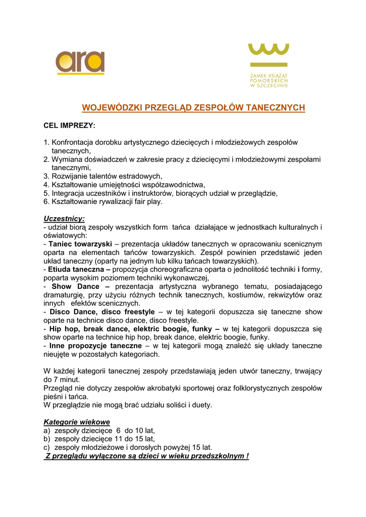 WOJEWÓDZKI PRZEGLĄD ZESPOŁÓW TANECZNYCH CEL IMPREZY: 1. Konfrontacja dorobku artystycznego dziecięcych i młodzieżowych zespołów tanecznych, 2. Wymiana doświadczeń w zakresie pracy z dziecięcymi i młodzieżowymi zespołami tanecznymi, 3. Rozwijanie talentów estradowych, 4. Kształtowanie umiejętności współzawodnictwa, 5. Integracja uczestników i instruktorów, biorących udział w przeglądzie, 6. Kształtowanie rywalizacji fair play. Uczestnicy: - udział biorą zespoły wszystkich form tańca działające w jednostkach kulturalnych i oświatowych: - Taniec towarzyski – prezentacja układów tanecznych w opracowaniu scenicznym oparta na elementach tańców towarzyskich. Zespół powinien przedstawić jeden układ taneczny (oparty na jednym lub kilku tańcach towarzyskich). - Etiuda taneczna – propozycja choreograficzna oparta o jednolitość techniki i formy, poparta wysokim poziomem techniki wykonawczej, - Show Dance – prezentacja artystyczna wybranego tematu, posiadającego dramaturgię, przy użyciu różnych technik tanecznych, kostiumów, rekwizytów oraz innych efektów scenicznych. - Disco Dance, disco freestyle – w tej kategorii dopuszcza się taneczne show oparte na technice disco dance, disco freestyle. - Hip hop, break dance, elektric boogie, funky – w tej kategorii dopuszcza się show oparte na technice hip hop, break dance, elektric boogie, funky. - Inne propozycje taneczne – w tej kategorii mogą znaleźć się układy taneczne nieujęte w pozostałych kategoriach. W każdej kategorii tanecznej zespoły przedstawiają jeden utwór taneczny, trwający do 7 minut. Przegląd nie dotyczy zespołów akrobatyki sportowej oraz folklorystycznych zespołów pieśni i tańca. W przeglądzie nie mogą brać udziału soliści i duety. Kategorie wiekowe a) zespoły dziecięce 6 do 10 lat, b) zespoły dziecięce 11 do 15 lat, c) zespoły młodzieżowe i dorosłych powyżej 15 lat. Z przeglądu wyłączone są dzieci w wieku przedszkolnym ! U W A G A: o występie zespołu w danej kategorii decyduje wiek większości jego członków. Nie mogą brać udziału w przeglądzie zespoły, które w roku ubiegłym uzyskały tytuł Laureata w Przeglądzie Wojewódzkim. Mogą natomiast zaprezentować się poza konkursem po wcześniejszym uzgodnieniu z organizatorem przeglądu. Ocena: 1. Jury oceniać będzie trzy walory prezentacji zespołów tanecznych: - technikę – w tym wymiarze oceniane będzie właściwe wykonanie elementów danego stylu tanecznego, charakter tańca, poziom trudności i współpraca między tancerzami na scenie. Układ taneczny powinien być adekwatny do poziomu technicznego tańca i wieku wykonawców, - kompozycja (choreografia) – jury oceniać będzie ruch, figury, zmiany, poczucie rytmu, linie, koła wykorzystane w kompozycji danego układu tanecznego, różnorodność i oryginalność zastosowanych elementów w ogólnym rysunku tańca, - wrażenia artystyczne – w ocenie istotne są ekspresja fizyczna i emocjonalna, kontakt z widownią, dynamika występu, - rekwizyty, kostiumy, makijaż, fryzura (ale nie mogą zdominować tańca), - zestawienie i dobór muzyki, dyscyplina zespołu, - show – pod uwagę brane będą następujące kryteria: - tematyka układu, - dopasowanie strojów do tematu prezentacji, - figury akrobatyczne, podnoszenia, skoki i inne efekty specjalne, - pomysłowe i kreatywne efekty wizualne z wykorzystaniem rekwizytów i układów, - współgranie poszczególnych komponentów występu jak muzyka, choreografia i ruch. Występ powinien być dopasowany do wieku i poziomu technicznego tańca wszystkich tancerzy i nie powinien negatywnie oddziaływać na widownię. UWAGA: Jury ocenia zespoły taneczne, w skład których nie mogą wchodzić ich instruktorzy. 2. W skład jury wejdą wykwalifikowani choreografowie, instruktorzy tańca o uznanym dorobku artystycznym (w miarę możliwości spoza województwa). 3. Do przeglądu miejskiego (Szczecin) przystępują maksymalnie 4 zespoły bez względu na kategorie wiekowe z danej instytucji. 4. Do przeglądu wojewódzkiego jury kwalifikuje łącznie 3 zespoły, ze wszystkich kategorii wiekowych. 5. W przypadku wysokiego poziomu artystycznego, jury ma prawo zakwalifikować więcej jak 3 zespoły taneczne do przeglądu wojewódzkiego Uwagi organizacyjne: 1. W przeglądzie wojewódzkim prawo udziału mają zespoły zakwalifikowane podczas przeglądów powiatowych i przeglądu miejskiego (Szczecin) 2. Kierownicy zespołów mają obowiązek złożyć kartę zgłoszenia wraz z imienną listą członków zespołu zawierającą ich wiek, w terminie 2 tygodnie przed eliminacjami u właściwego organizatora. (karty bez załączonej listy nie będą przyjmowane przez organizatora) 3.Każdy uczestnik przeglądu może być członkiem tylko jednego zespołu. 4. Wszyscy uczestnicy zobowiązani są posiadać aktualną legitymację szkolną. W przypadku stwierdzenia złamania któregokolwiek z powyższych punktów zespół zostanie zdyskwalifikowany. W przypadku stwierdzenia przekroczenia limitu wiekowego o jednego z uczestników (liczy się rok urodzenia) zespół zostanie wycofany z przeglądu. 6. Nagrania podkładów muzycznych na audio CD muszą być opisane. 7. Nośnik o wysokiej jakości technicznej powinien zawierać nagranie muzyki tylko jednej choreografii. 8. Prezentowane układy muszą uwzględniać realne możliwości w zakresie wielkości sceny i wykorzystania efektów oświetleniowych jakimi dysponują organizatorzy. 9. Kolejność występowania uczestników zostanie ustalona przez Organizatora. 10. Sprawy nieujęte w regulaminie rozstrzyga Organizator. Terminy i miejsca przeglądów: - powiatowe - wg terminarza - miejski (Szczecin) – 14.05.2016 r. – Opera na Zamku w Szczecinie - wojewódzki - 04.06.2016 r. - Opera na Zamku w Szczecinie UWAGA: w celu stworzenia jak najlepszej organizacji przeglądu wojewódzkiego, protokół wraz z kartami zgłoszeń zakwalifikowanych zespołów n