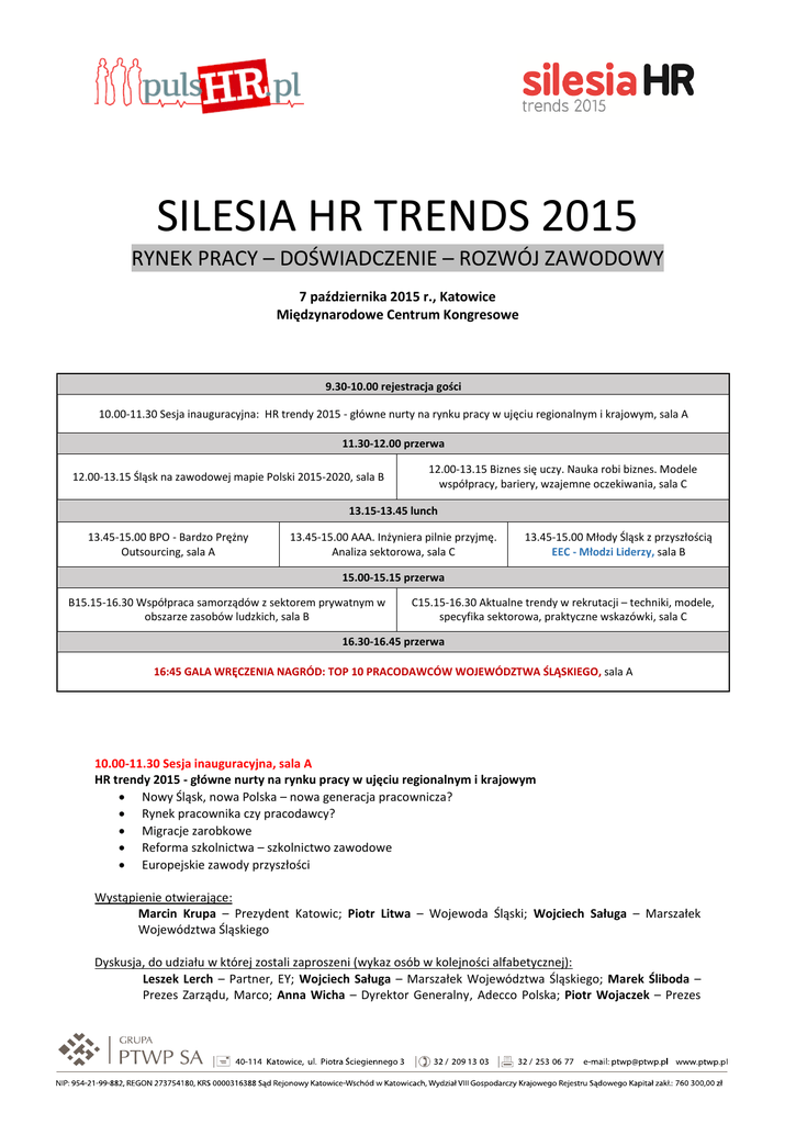 SILESIA HR TRENDS 2015 RYNEK PRACY – DOŚWIADCZENIE – ROZWÓJ ZAWODOWY 7 października 2015 r., Katowice Międzynarodowe Centrum Kongresowe 9.30-10.00 rejestracja gości 10.00-11.30 Sesja inauguracyjna: HR trendy 2015 - główne nurty na rynku pracy w ujęciu regionalnym i krajowym, sala A 11.30-12.00 przerwa 12.00-13.15 Śląsk na zawodowej mapie Polski 2015-2020, sala B 12.00-13.15 Biznes się uczy. Nauka robi biznes. Modele współpracy, bariery, wzajemne oczekiwania, sala C 13.15-13.45 lunch 13.45-15.00 BPO - Bardzo Prężny Outsourcing, sala A 13.45-15.00 AAA. Inżyniera pilnie przyjmę. Analiza sektorowa, sala C 13.45-15.00 Młody Śląsk z przyszłością EEC - Młodzi Liderzy, sala B 15.00-15.15 przerwa B15.15-16.30 Współpraca samorządów z sektorem prywatnym w obszarze zasobów ludzkich, sala B C15.15-16.30 Aktualne trendy w rekrutacji – techniki, modele, specyfika sektorowa, praktyczne wskazówki, sala C 16.30-16.45 przerwa 16:45 GALA WRĘCZENIA NAGRÓD: TOP 10 PRACODAWCÓW WOJEWÓDZTWA ŚLĄSKIEGO, sala A 10.00-11.30 Sesja inauguracyjna, sala A HR trendy 2015 - główne nurty na rynku pracy w ujęciu regionalnym i krajowym Nowy Śląsk, nowa Polska – nowa generacja pracownicza? Rynek pracownika czy pracodawcy? Migracje zarobkowe Reforma szkolnictwa – szkolnictwo zawodowe Europejskie zawody przyszłości Wystąpienie otwierające: Marcin Krupa – Prezydent Katowic; Piotr Litwa – Wojewoda Śląski; Wojciech Saługa – Marszałek Województwa Śląskiego Dyskusja, do udziału w której zostali zaproszeni (wykaz osób w kolejności alfabetycznej): Leszek Lerch – Partner, EY; Wojciech Saługa – Marszałek Województwa Śląskiego; Marek Śliboda – Prezes Zarządu, Marco; Anna Wicha – Dyrektor Generalny, Adecco Polska; Piotr Wojaczek – Prezes Zarządu, Katowicka Specjalna Strefa Ekonomiczna; Jacek Żarnowiecki – Dyrektor Personalny, General Motors Manufacturing Poland Moderacja: Wojciech Kuśpik – Prezes Zarządu, PTWP 12.00–13.15 Sesja tematyczna, sala B Śląsk na zawodowej mapie Polski 2015-2020 Przewagi wynikające ze specyfiki gospodarczo-demograficznej regionu Tradycja i nowoczesność Nowa perspektywa unijna a kapitał ludzki Prognozy gospodarcze dla regionu Jak państwo, agendy rządowe i samorząd powinny stymulować krajowy i lokalny rynek pracy? Problem deficytu kadr Dyskusja, do udziału w której zostali zaproszeni (wykaz osób w kolejności alfabetycznej): Małgorzata Mańka-Szulik – Prezydent Zabrza; Kazimierz Karolczak – Wicemarszałek Województwa Śląskiego; Anna Łotocka – Dyrektor, Departament Zarządzania Zasobami Ludzkimi, TAURON Polska Energia; Monika Roznerska – Dyrektor Personalny, ArcelorMittal; Grzegorz Sikorski – Dyrektor, Wojewódzki Urząd Pracy w Katowicach; Zbigniew Szkaradnik – Prezes Zarządu, 3S Data Center; Piotr Wojaczek – Prezes Zarządu, Katowicka Specjalna Strefa Ekonomiczna Moderacja: Rafał Kerger – Redaktor Naczelny, PulsHr.pl, PortalSamorządowy.pl 12.00–13.15 sesja tematyczna, sala C Biznes się uczy. Nauka robi biznes. Modele współpracy, bariery, wzajemne oczekiwania Skuteczna współpraca na linii biznes-uczelnia jako warunek rozwoju sektora R&D Polskie firmy na tle europejskich modeli współpracy akademickiej Programy stypendialne Wspólne programy badawcze, dobre praktyki Dyskusja, do udziału w której zostali zaproszeni (wykaz osób w kolejności alfabetycznej): Arkadiusz Hołda – Kanclerz, Wyższa Szkoła Techniczna, Katowice, Prezes Zarządu, TVS; Marek Gzik – Pełnomocnik Rektora ds. Współpracy z Przemysłem Politechniki Śląskiej; Artur Pałasz – Dyrektor Centrum Rekrutacji na Europę Centralną, TRW Steering Europe; Luk Palmen – Silesia Automotive; Tomasz Szpikowski – Prezes Zarządu, BERGMAN ENGINEERING Moderacja: Bartosz Dyląg – Redaktor, PulsHR.pl 13.45–15.00 sesja tematyczna, sala A BPO – Bardzo Prężny Outsourcing Masowe rekrutacje do BPO – wyzwania, dobre praktyki Zatrudnianie obcokrajowców – aspekty prawne, metody rekrutacji, pomoc w przeprowadzce do Polski HR Pool na Śląsku Rotacja pracowników w ramach sektora BPO Dyskusja, do udziału w której zostali zaproszeni (wykaz osób w kolejności alfabetycznej): Marcin Nowak – Dyrektor Zarządzający, Infrastructure Services Eastern Europe Capgemini; Joanna Osoba-Botwina – Dyrektor ds. HR, Rockwell Automation; Justyna Piesiewicz – Prezes Zarządu, Międzynarodowe Stowarzyszenie Ekspertów Komunikacji i Przywództwa, IACL; Mateusz Skowroński – Naczelnik Wydział Obsługi Inwestorów, Urząd Miejski, Katowice; Robert Tomanek – Prorektor, Uniwersytet Ekonomiczny w Katowicach Moderacja: Jacek Ziarno – Redaktor, Nowy Przemysł 13.45–15.00 sesja tematyczna, sala B AAA. Inżyniera pilnie przyjmę. Analiza sektorowa Inżynier potrzebny od zaraz – powody niedoboru kadry na rynku pracy Gradacja priorytetów w celu uzdrowienia rynku pracy inżynierów Szukanie rozwiązań – jak zatrzymać emigrację, zatrudnianie inżynierów z zagranicy Współpraca biznesu z uczelniami wyższymi – aktualne potrzeby i wyzwania Dyskusja, do udziału w której zostali zaproszeni (wykaz osób w kolejności alfabetycznej): Marek Gzik – Pełnomocnik Rektora ds. Współpracy z Przemysłem Politechniki Śląskiej; Grzegorz Mródź – Wiceprezes Zarządu, Kamsoft; Artur Pałasz – Dyrektor Centrum Rekrutacji na Europę Centralną, TRW Steering Europe; Anna Timofiejczuk – Prodziekan ds. organizacji i rozwoju, Politechnika Śląska; Wiesław Wilk – Prezes Zarządu, Wilk Elektronik; Wojciech Wolny – Prezes Zarządu, LGBS Moderacja: Tomasz Szpikowski – Prezes Zarządu, BERGMAN ENGINEERING 13.45–15.00 sesja tematyczna, sala C Młody Śląsk z przyszłością Sytuacja i trendy na rynku pracy woj. śląskiego w kontekście demograficznym (migracje, deglomeracja, absolwenci, struktura zatrudnienia) Konkurowanie o mieszkańców, pracowników i talenty między polskimi regionami. Atuty i słabości Śl