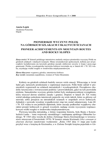 S ł u p s ki e P r a c e G e o g r a f i c z ne 5 • 2008 Aneta Łojek Akademia Pomorska Słupsk PIONIERSKIE WYCZYNY POLEK NA GÓRSKICH SZLAKACH I SKALNYCH ŚCIANACH PIONEER ACHIEVEMENTS ON MOUNTAIN ROUTES AND ROCKY SLOPES Zarys treści: W historii polskiego taternictwa znalazły miejsce pionierskie wyczyny Polek na górskich szlakach i skalnych ścianach. Mimo uwarunkowań społecznych, kobiety już od początków kształtowania się turystyki górskiej zaczęły zdobywać szczyty w kraju i poza jego granicami. Polska wysokogórska turystyka kobieca rozwinęła się w latach 60. i 70. XX wieku, uzyskując wielki rozgłos w środowisku międzynarodowym. Słowa kluczowe: wyprawy górskie, taternictwo kobiece Key words: mountain expeditions, women of Tatra Mountains Kobiety na górskich szlakach budziły zawsze wiele emocji. Wkraczając w świat ludzi gór, naruszyły przekonanie o supremacji mężczyzn. Polki brały udział w pionierskich wyprawach na szlakach tatrzańskich i wysokogórskich. Początkowo chodziły turystycznie z towarzyszami podróży i przewodnikami, gdyż na tyle pozwalała etykieta. Samodzielne wyczyny górskie kobiet były niedopuszczalnym występkiem, który niszczył dawno ustalone zasady i granice. Dopiero w latach 20. XX wieku wśród młodego pokolenia taterniczek pojawiło się wiele takich, które za główny cel stawiały sobie przejścia na tatrzańskich ścianach w zespołach stricte kobiecych. Jednakże z powodu wysokiej wypadkowości etap ten został zahamowany. Lata 60. i 70. XX wieku to era polskich alpinistek, które zaczęły podkreślać wyjątkowy charakter przejść kobiecych w górach wysokich, nadając swoim wyczynom wspinaczkowym wielki rozgłos w środowisku międzynarodowym. Pierwszą turystką tatrzańską, o której wspomina historia, była Beata z Kościeleckich Łaska – żona wojewody sieradzkiego i nadżupana spiskiego Olbrachta Łaskiego. W 1565 roku weszła do doliny Zielonego Stawu Kieżmarskiego w towarzystwie mieszczan (Chwaściński 1979). W kronice miasta Kieżmark Liber censuum et aliarium diarium zanotowano wydarzenie: „Roku 1565 dnia 11 maja pan Łaski przybył wraz z księżną do Kieżmarku, a w Zielone Świątki księżna pojechała w Gó43 ry Śnieżne z wieloma ludźmi z miasta” (Nyka 1961). Wyprawa Beaty z Kościeleckich Łaskiej stała się momentem przełomowym w dziejach dworskiej etykiety. Nie tylko przełamała bariery obyczajowe i maniery dworskie, ale jej wyczyn miał też aspekt sentymentalny, gdyż dostrzeżono uroki dzikich, tatrzańskich zakątków. Na wiele kolejnych lat wysokogórska turystyka kobieca zanikła, nie pozwalały bowiem na nią konwenanse i normy moralno-obyczajowe minionych epok. Za nieprzyzwoitość uznano by współczesny strój turystyczny, bowiem kobiety ubierały się tak, jak nakazywały im obyczaje: „kaskady fałdów, w które układając się, pod kostki i na kilku uwarstwieniach halek spoczywające spódnice, [...], owym dziwnotwornym uskrzydleniom kapeluszy to po prostu zdumiewać się trzeba, iż w takim stroju dokonywać można było jakichkolwiek wycieczek górskich” (Rotkiewicz 1995). Słowa jednego z najznamienitszych taterników początku XX wieku, Mieczysława Świerza, przypominają współczesnym kanon mody minionych epok, strojów bardzo uciążliwych na skalnych szlakach, będących jednocześnie udręką dla właścicielek i towarzyszy wyprawy. Mimo takich niedogodności, żadna kobieta nie odważyła się zmienić pewnych ustalonych zasad. „Wszystkie percie, brzeżki, granie, przełęcze zmierzone zostały ich drobnemi stopami, i z najwyższych wirchów tatrzańskich powiewała już chorągiew – w spódnicy” (Witkiewicz 1891). Często podążały w krynolinach, które wlokły za sobą kamienie lub wplątywały się w kosodrzewinę, dlatego kobiety nie były zbyt chętnie widziane na męskich wyprawach (Hennel 1979). Z czasem jednak przebierały się podczas górskich wędrówek w strój typowo męski: „wyjęła z plecaka spódnicę i kapelusz z szerokim rondem. Wspinała się w spodniach i w chusteczce na głowie, ale fotografowała się zawsze w spódnicy i kapeluszu, aby nie obrażać poczucia przyzwoitości swojej sfery” (Chwaściński 1987). Kobietom turystykę górską zalecano jako naturalne wzmocnienie mięśni, poprawiające sylwetkę. „Kobieta, która pokochała góry i trud pieszej wycieczki, napełni duszę całym świetlanym urokiem słońca i powietrza, całą upajającą wonią świerkowych lasów i granitową rzeźbą arcymistrza świata a pozatem jeszcze nie będzie potrzebowała gorsetu dla osiągnięcia tzw. „ładnej figury”. Bo jeśli dość wcześnie rzuciła się do sportu, jako do radości życia i ratunku a rozporządza jeszcze młodością i jaką taką siłą, po pewnym czasie może sama stać się, jak rzeźba a zdrowiem kwitnąć, jak poranek majowy” (Ogórek-Pankowa 1908). Kobiety coraz częściej odwiedzały Tatry, będąc najczęściej towarzyszkami podróży. Witkiewicz pisał: „Ponoszą one wszystkie trudy z niezwykłą wytrzymałością; wykazują odwagę, przytomność umysłu, spokój wobec niebezpieczeństwa i w ogóle wszystkie dobre przymioty taternika. [...] Często wycieczka kończy się deszczem, [...] a wtedy damy zmokłe, zbłocone, zmęczone, potrącając się wśród głazów, ślizgając się po błocie, wracają pozbawione wszelkiej nawet pretensyi do wdzięku i piękna. [...] otyłą, ciężką babę, zmokłą, ociekłą, wystraszoną i spłakaną, którą znosił w garści przewodnik z Zawratu, śmiejąc się przytem, i wmawiając, że jest to droga gładka, jak szosa z Nowego Targu…” (Witkiewicz 1891). Na uwagę zasługują dokonania kilku kobiet w XIX wieku. Po ponad 250 latach od pamiętnej „pseudogórskiej” wycieczki Beaty Łaskiej pojawiła się w Tatrach Łucja z Giedrojciów Rautenstrauchowa. Należała do grona osób, które ślad swoich wycieczek utrwalały na kartach papieru. W