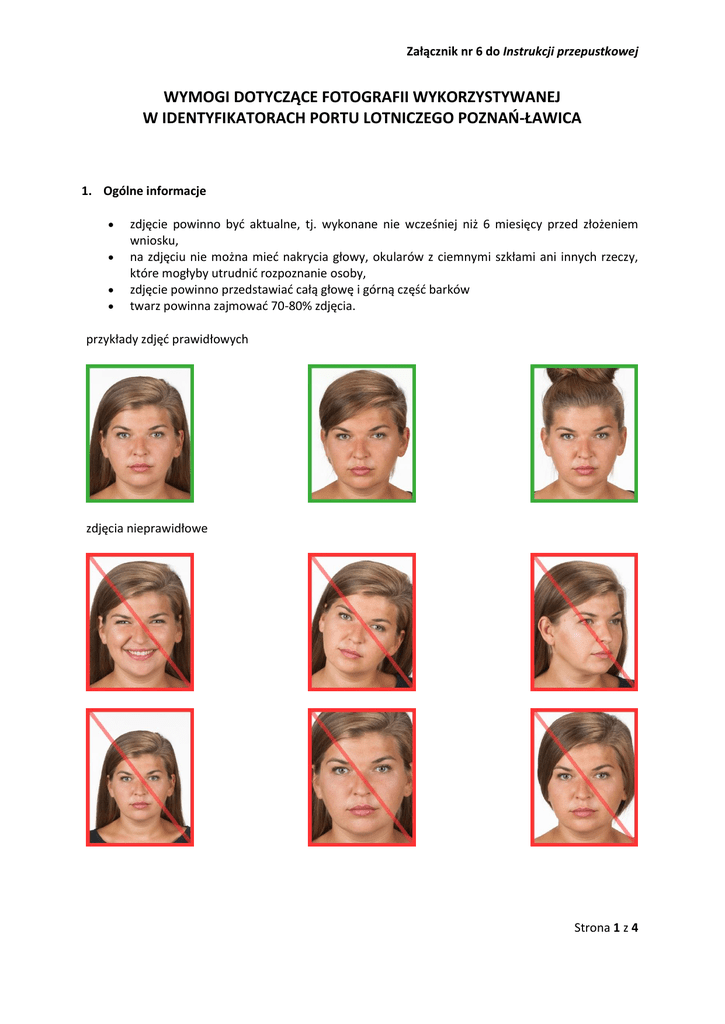 Załącznik nr 6 do Instrukcji przepustkowej WYMOGI DOTYCZĄCE FOTOGRAFII WYKORZYSTYWANEJ W IDENTYFIKATORACH PORTU LOTNICZEGO POZNAŃ-ŁAWICA 1. Ogólne informacje zdjęcie powinno być aktualne, tj. wykonane nie wcześniej niż 6 miesięcy przed złożeniem wniosku, na zdjęciu nie można mieć nakrycia głowy, okularów z ciemnymi szkłami ani innych rzeczy, które mogłyby utrudnić rozpoznanie osoby, zdjęcie powinno przedstawiać całą głowę i górną część barków twarz powinna zajmować 70-80% zdjęcia. przykłady zdjęć prawidłowych zdjęcia nieprawidłowe Strona 1 z 4 Załącznik nr 6 do Instrukcji przepustkowej 2. Okulary i soczewki kontaktowe jeśli nosisz okulary korekcyjne - możesz zrobić zdjęcie w okularach. Twoje oczy muszą być dobrze widoczne, a na zdjęciu nie może być odblasków na skutek odbicia światła od szkieł. Aby uniknąć ewentualnych problemów, lepiej zrobić zdjęcie bez okularów, jeśli nosisz soczewki kontaktowe - możesz zrobić zdjęcie w soczewkach, o ile nie zmieniają one Twojego naturalnego kształtu i koloru oczu, jeśli posiadasz wrodzone lub nabyte wady wzroku - możesz zrobić fotografię w ciemnych okularach. Pamiętaj, aby do wniosku dołączyć orzeczenie o niepełnosprawności albo orzeczenie o stopniu niepełnosprawności. Jeśli składasz wniosek przez internet, dołącz skan dokumentu, a oryginał przekaż pracownikowi Zespołu Elektronicznych Systemów Bezpieczeństwa podczas odbierania identyfikatora. 3. Nakrycie głowy jeśli nosisz nakrycie głowy, bo tego wymaga Twoja religia - możesz je mieć na zdjęciu, jeśli twarz będzie nadal widoczna. Wtedy do wniosku dołącz zaświadczenie, które potwierdzi, że należysz do wspólnoty wyznaniowej. Pamiętaj, że musi to być wspólnota, która jest zarejestrowana w Polsce. Jeśli składasz wniosek przez internet - dołącz skan dokumentu, a oryginał przekaż pracownikowi Zespołu Elektronicznych Systemów Bezpieczeństwa podczas odbierania identyfikatora, cały owal twarzy oraz linii uszu musi być odsłonięty. Zobacz przykłady prawidłowych i nieprawidłowych zdjęć: zdjęcie prawidłowe Strona 2 z 4 Załącznik nr 6 do Instrukcji przepustkowej zdjęcia niepoprawne 4. Format zdjęcia Zdjęcie może być dostarczone: na papierze - kolorowe zdjęcie w formacie 35 mm (szerokość) na 45 mm (wysokość), w formie elektronicznej - kolorowe zdjęcie o rozdzielczości co najmniej 492 x 633 pikseli i wielkości maksymalnie 2,5 MB. 5. Wygląd twarzy na zdjęciu twarz musi być skierowana prosto w obiektyw aparatu, głowa nie może być przekrzywiona, zdjęcie powinno przedstawiać widoczny owal twarzy, bez półprofilu, musisz mieć naturalny wygląd twarzy, zamknięte usta oraz całkowicie widoczne brwi, fryzura na zdjęciu może wystawać poza obrys zdjęcia, oczy muszą być naturalnie otwarte, widoczne wraz ze źrenicami (na przykład nie mogą być zakryte przez włosy) i skierowane prosto w obiektyw, niedopuszczalny jest efekt tak zwanych "czerwonych oczu", uszy nie muszą być widoczne. Zobacz przykłady nieprawidłowych zdjęć: 6. Tło i oświetlenie zdjęcia białe, oświetlone jednolicie, pozbawione cieni i elementów ozdobnych, zdjęcie musi pokazywać jedynie osobę, która jest fotografowana, twarz na zdjęciu musi być równomiernie oświetlona (niedopuszczalne są odbicia światła na skórze czy włosach oraz cienie na twarzy). Strona 3 z 4 Załącznik nr 6 do Instrukcji przepustkowej Zobacz przykłady nieprawidłowych zdjęć: 7. Ostrość, kontrast i jakość zdjęcia zdjęcie musi być ostre (bez widocznych pikseli) i posiadać naturalny kontrast, kontur głowy musi być wyraźny (niedopuszczalne są prześwietlenia tła), zdjęcie powinno zostać wykonane na błyszczącym papierze fotograficznym lub błyszczącym papierze fotograficznym przeznaczonym do drukarek komputerowych, w neutralnej kolorystyce i odpowiedniej gęstości tonalnej (nie może być ani za jasne, ani za ciemne), zdjęcie nie może mieć załamań lub innych uszkodzeń powierzchni, zdjęcie musi odwzorowywać naturalny kolor skóry. Zobacz przykłady nieprawidłowych zdjęć: 8. Biżuteria jeśli nosisz biżuterię - możesz ją mieć na zdjęciu, jeśli nie zasłania ona owalu twarzy i nie zaburza jednolitego tła zdjęcia. Aby uniknąć ewentualnych problemów, lepiej zrobić zdjęcie bez biżuterii, jeśli usunięcie biżuterii mogłoby spowodować uszkodzenie uszu lub twarzy - możesz zrobić zdjęcie w biżuterii, nawet jeśli zasłania owal twarzy lub zaburza tło. 9. Dodatkowe informacje Jeśli fotografia została wykonana w prawidłowy sposób, ale ze względu na chorobę, wypadek czy cechy fizyczne osoba na zdjęciu ma zamknięte oczy, otwarte usta albo inny niż naturalny wyraz twarzy, pracownik Zespołu Elektronicznych Systemów Bezpieczeństwa może zaakceptować taką fotografię. Opracowano na podstawie: https://obywatel.gov.pl/dowody-osobiste/zdjecie-do-dowodu-lub-paszportu Strona 4 z 4