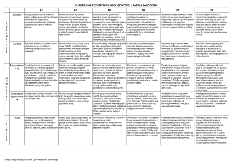 EUROPEJSKIE POZIOMY BIEGŁOŚCI JĘZYKOWEJ – TABELA SAMOOCENY R O Z U M I E N I E M Ó W I E N I E P I S A N I E A1 A2 B1 B2 C1 C2 Słuchanie Potrafię zrozumieć znane mi słowa i bardzo podstawowe wyrażenia dotyczące mnie osobiście, mojej rodziny i bezpośredniego otoczenia, gdy tempo wypowiedzi jest wolne a wymowa wyraźna. Potrafię zrozumieć wyrażenia i najczęściej używane słowa, związane ze sprawami dla mnie ważnymi (np. podstawowe informacje dotyczące mnie i mojej rodziny, zakupów, miejsca i regionu zamieszkania, zatrudnienia). Potrafię zrozumieć główny sens zawarty w krótkich, prostych komunikatach i ogłoszeniach. Potrafię zrozumieć główne myśli zawarte w jasnej, sformułowanej w standardowej odmianie języka wypowiedzi na znane mi tematy, typowe dla domu, szkoły, czasu wolnego itd. Potrafię zrozumieć główne wątki wielu programów radiowych i telewizyjnych traktujących o sprawach bieżących lub o sprawach interesujących mnie prywatnie lub zawodowo – wtedy, kiedy te informacje są podawane stosunkowo Potrafię zrozumieć dłuższe wypowiedzi i wykłady oraz nadążać za skomplikowanymi nawet wywodami – pod warunkiem, że temat jest mi w miarę znany. Rozumiem większość wiadomości telewizyjnych i programów o sprawach bieżących. Rozumiem większość filmów w standardowej odmianie języka. Rozumiem dłuższe wypowiedzi, nawet jeśli nie są one jasno skonstruowane i kiedy związki logiczne są w nich jedynie implikowane, a nie wyrażone bezpośrednio. Bez większych trudności rozumiem programy telewizyjne i filmy. Nie mam żadnych trudności ze zrozumieniem jakiejkolwiek wypowiedzi mówionej – słuchanej „na żywo” czy odbieranej za pośrednictwem mediów – nawet przy szybkim tempie mówienia rodzimego użytkownika języka, pod warunkiem jednak, iż mam trochę czasu, by przyzwyczaić się do nowego akcentu. Czytanie Rozumiem znane nazwy, słowa i bardzo proste zdania, np.: na tablicach informacyjnych i plakatach lub w katalogach. Potrafię czytać bardzo krótkie, proste teksty. Potrafię znaleźć konkretne, przewidywalne informacje w prostych tekstach dotyczących życia codziennego, takich jak ogłoszenia, reklamy, prospekty, karty dań, rozkłady jazdy. Rozumiem krótkie, proste listy prywatne. Rozumiem teksty składające się głównie ze słów najczęściej występujących, dotyczących życia codziennego lub zawodowego. Rozumiem opisy wydarzeń, uczuć i pragnień zawarte w prywatnej korespondencji. Czytam ze zrozumieniem artykuły i reportaże dotyczące problemów współczesnego świata, w których piszący prezentują określone stanowiska i poglądy. Rozumiem współczesną prozę literacką. Rozumiem długie i złożone teksty informacyjne i literackie, dostrzegając i doceniając ich zróżnicowanie pod względem stylu. Rozumiem artykuły specjalistyczne i dłuższe instrukcje techniczne, nawet te niezwiązane z moją dziedziną. Rozumiem z łatwością praktycznie wszystkie formy języka pisanego, włączając w to abstrakcyjne lub językowo skomplikowane teksty, takie jak podręczniki, artykuły specjalistyczne i dzieła literackie. Porozumiewani Potrafię brać udział w rozmowie pod warunkiem, że rozmówca jest gotów e się Potrafię brać udział w zwykłej, typowej rozmowie wymagającej prostej i powtarzać lub inaczej formułować swoje bezpośredniej wymiany informacji na myśli, mówiąc wolniej oraz pomagając mi znane mi tematy. Potrafię sobie radzić ująć w słowa to, co usiłuję opowiedzieć. w bardzo krótkich rozmowach towarzyskich, nawet jeśli nie rozumiem Potrafię formułować proste pytania dotyczące najlepiej mi znanych tematów wystarczająco dużo, by samemu podtrzymać rozmowę. lub najpotrzebniejszych spraw – i odpowiadać na tego typu pytania. Potrafię sobie radzić w większości sytuacji, w których można się znaleźć w czasie podróży po kraju lub regionie, gdzie mówi się danym językiem. Potrafię - bez uprzedniego przygotowania – włączać się do rozmów na znane mi tematy prywatne lub dotyczące życia codziennego (np. rodziny, zainteresowań, pracy, podróżowania i wydarzeń bieżących). Potrafię się porozumiewać na tyle płynnie i spontanicznie, że mogę prowadzić dość swobodne rozmowy z rodzimymi użytkownikami języka. Potrafię brać czynny udział w dyskusjach na znane mi tematy, przedstawiając swoje zdanie i broniąc swoich poglądów. Potrafię się wypowiadać płynnie i spontanicznie, bez zbyt widocznego namyślania się w celu znalezienia właściwych sformułowań. Potrafię skutecznie porozumiewać się w kontaktach towarzyskich i sprawach zawodowych. Potrafię precyzyjnie formułować swoje myśli i poglądy, zręcznie nawiązując do wypowiedzi rozmówców. Samodzielne Potrafię używać prostych wyrażeń i zdań, Potrafię posłużyć się ciągiem wyrażeń i wypowiadanie aby opisać miejsce, gdzie mieszkam oraz zdań, by w prosty sposób opisać swoją rodzinę, innych ludzi, warunki życia, ludzi, których znam. się Potrafię łączyć wyrażenia w prosty sposób, by opisywać przeżycia i zdarzenia, a także swoje marzenia, nadzieje i ambicje. Potrafię krótko uzasadniać i objaśniać własne poglądy i plany. Potrafię relacjonować wydarzenia i opowiadać przebieg akcji książek czy filmów, opisując własne reakcje i wrażenia. Potrafię formułować przejrzyste, rozbudowane wypowiedzi na różne tematy związane z dziedzinami, które mnie interesują. Potrafię wyjaśnić swój punkt widzenia w danej kwestii oraz podać argumenty za i przeciw względem możliwych rozwiązań. Potrafię pisać proste teksty na znane mi lub związane z moimi zainteresowaniami tematy. Potrafię pisać prywatne listy, opisując swoje przeżycia i wrażenia. Potrafię pisać zrozumiałe, szczegółowe teksty na dowolne tematy związane z moimi zainteresowaniami. Potrafię napisać rozprawkę lub opracowanie, przekazując informacje lub rozwa