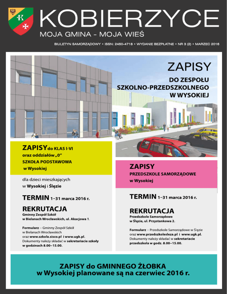 BIULETYN SAMORZĄDOWY • ISSN: 2450-4718 • WYDANIE BEZPŁATNE • NR 3 (2) • MARZEC 2016 2 INFORMACJE GMINNE Szanowni Państwo, Informujemy, że w okresie od grudnia 2015 r. do lutego 2016 r. dostarczyliśmy mieszkańcom i podmiotom gospodarczym działającym na terenie Gminy Kobierzyce formularze wniosków o zawarcie nowych umów na dostarczanie wody i odprowadzanie ścieków z Kobierzyckim Przedsiębiorstwem Wodociągów i Kanalizacji Sp. z o.o., któremu zostały powierzone zadania zbiorowego zaopatrzenia w wodę i zbiorowego odprowadzania ścieków od dnia 1 kwietnia 2016 roku. Zwracamy się z uprzejmą prośbą do wszystkich osób i podmiotów, które do tej pory nie wystąpiły do KPWiK Sp. z o.o. z powyższymi wnioskami, o pilne ich złożenie lub przesłanie wypełnionego formularza wniosku wraz z wymaganymi dokumentami w terminie do 15.03.2016 r. Biuro Obsługi Klienta KPWiK Sp. z o.o. czynne jest od poniedziałku do piątku w godzinach od 7:30 do 15:30, nr telefonu 71 344 03 55, nr fax-u 71 396 37 16, e-mail: [email protected], adres: ul. Wrocławska 44, Bielany Wrocławskie, 55-040 Kobierzyce. Z poważaniem: Zarząd i Pracownicy KPWiK Sp. z o.o. Poczta Polska S.A. poszukuje kandydatów na stanowisko: LISTONOSZ Z WŁASNYM SAMOCHODEM Miejsce pracy: Kobierzyce (Pow. Wrocławski) Numer referencyjny 224/WW/2016 Wymiar etatu: 1,00 KANCELARIA ADWOKACKA Adwokat Anna Pawliszyn z siedzibą w Bielanach Wrocławskich, ul. Liliowa 6, tel. 502 704 132 poszukuje do współpracy aplikanta adwokackiego I lub II roku aplikacji. CV wraz z listem motywacyjnym proszę wysyłać na adres e-mail: [email protected] lub pocztą na adres Kancelarii wskazany powyżej. Operator wózka widłowego/ Pakowacz Biskupice Podgórne, 55-040 Kobierzyce, Dolnośląskie Samwha Poland Sp. z o.o. Opis stanowiska pracy: przyjmowanie i weryfikacja dostaw pod względem zgodności z dokumentami, komplementacja towaru zgodnie z dokumentami, dokonywanie inwentaryzacji, prowadzenie dokumentacji magazynowej, rozmieszczenie towaru na magazynie zgodnie z jego lokacją, sortowanie towaru na magazynie, rozładunek i załadunek towarów. Wymagania: uprawnienia do obsługi wózków widłowych, bardzo dobra organizacja pracy własnej, umiejętność pracy pod presją czasu, odpowiedzialność, zaangażowanie w wykonywaną pracę, uczciwość, terminowość. Oferujemy: pracę w prężnie rozwijającej się firmie, narzędzia niezbędne do wykonywania powierzonych obowiązków, stałą formę zatrudnienia w oparciu o umowę o pracę, prywatny pakiet medyczny po okresie próbnym (Luxmed), bardzo dobrą atmosferę w pracy. Miejsce pracy: ul. Fińska 2, Biskupice Podgórne Prosimy o dodanie klauzuli: „Wyrażam zgodę na przetwarzanie moich danych osobowych zawartych w mojej ofercie pracy dla potrzeb niezbędnych do realizacji procesu rekrutacji (zgodnie z Ustawą z dnia 29.08.1997 roku o Ochronie Danych Osobowych; tekst jednolity: Dz. U. z 2002r. Nr 101, poz. 926 ze zm.)”. Informacje dodatkowe: rodzaj pracy: pełny etat, rodzaj umowy: na okres próbny, liczba wakatów: 1, min. doświadczenie: tylko praktyki, min. wykształcenie: średnie zawodowe, branża: praca logistyka Forma kontaktu: e-mail [email protected], [email protected] Do zadań pracownika będzie należeć: Poczta Polska S.A. poszukuje kandydatów na stanowisko: PRACOWNIK DS. OBSŁUGI KLIENTA Miejsce pracy: Kobierzyce (Pow. Wrocławski) Numer referencyjny 237/WW/2016 Wymiar etatu: 0,875 Do zadań pracownika będzie należeć: •• profesjonalna obsługa klientów w zakresie usług pocztowych i finansowych, •• aktywna sprzedaż usług i towarów handlowych, •• udzielanie informacji o świadczonych usługach, •• kształtowanie pozytywnego wizerunku Poczty Polskiej S.A., w tym dbałość o estetykę stanowiska pracy, •• sporządzanie dokumentacji w zakresie realizowanych usług. Od kandydatów oczekujemy: •• wykształcenia średniego, •• umiejętności profesjonalnej obsługi klienta, •• umiejętności obsługi komputera, w tym podstawowej znajomości pakietu MS Office, •• wysokiej orientacji na klienta, skuteczności w dążeniu do rezultatów, •• komunikatywności, dobrej organizacji pracy własnej. W zamian oferujemy: •• umowę o pracę na okres próbny, •• możliwość rozwoju zawodowego, •• pakiet świadczeń socjalnych, •• pracę w dużej, renomowanej, rozwijającej się firmie, •• możliwość skorzystania z pakietu ubezpieczeń grupowych i pakietu medycznego na atrakcyjnych warunkach. Inne oczekiwania: •• mile widziane doświadczenie zawodowe w obsłudze klienta i w sprzedaży. Zachęcamy do udziału w rekrutacji także osoby z orzeczoną niepełnosprawnością, które spełniają określone powyżej kryteria kwalifikacyjne. Osoby zainteresowane ofertą prosimy o przesłanie CV na adres mailowy: [email protected] •• profesjonalna obsługa klientów w zakresie usług pocztowych, •• doręczanie przesyłek, przekazów pocztowych i telegramów, •• prowadzenie aktywnej sprzedaży wybranych usług i towarów, •• zbieranie i aktualizacja danych dotyczących rejonu doręczeń oraz bazy adresowej firm, •• prowadzenie dokumentacji eksploatacyjnej, •• monitorowanie estetyki i stanu technicznego nadawczych i oddawczych skrzynek pocztowych, •• kształtowanie pozytywnego wizerunku Poczty Polskiej S.A. Od kandydatów oczekujemy: •• wykształcenia zawodowego (mile widziane średnie), •• znajomości standardów obsługi klienta, •• wysokiej orientacji na klienta, skuteczności w dążeniu do rezultatów, •• komunikatywności, odpowiedzialności, sumienności, samodzielności, •• umiejętności organizacji pracy własnej, sprawności fizycznej. W zamian oferujemy: •• umowę o pracę w pełnym wymiarze etatu na okres próbny, •• możliwość rozwoju zawodowego, •• pakiet świadczeń socjalnych, •• pracę w dużej, renomowanej, rozwijającej się firmie, 