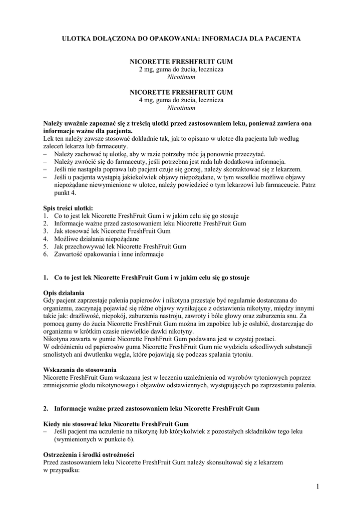ULOTKA DOŁĄCZONA DO OPAKOWANIA: INFORMACJA DLA PACJENTA NICORETTE FRESHFRUIT GUM 2 mg, guma do żucia, lecznicza Nicotinum NICORETTE FRESHFRUIT GUM 4 mg, guma do żucia, lecznicza Nicotinum Należy uważnie zapoznać się z treścią ulotki przed zastosowaniem leku, ponieważ zawiera ona informacje ważne dla pacjenta. Lek ten należy zawsze stosować dokładnie tak, jak to opisano w ulotce dla pacjenta lub według zaleceń lekarza lub farmaceuty. – Należy zachować tę ulotkę, aby w razie potrzeby móc ją ponownie przeczytać. – Należy zwrócić się do farmaceuty, jeśli potrzebna jest rada lub dodatkowa informacja. – Jeśli nie nastąpiła poprawa lub pacjent czuje się gorzej, należy skontaktować się z lekarzem. – Jeśli u pacjenta wystąpią jakiekolwiek objawy niepożądane, w tym wszelkie możliwe objawy niepożądane niewymienione w ulotce, należy powiedzieć o tym lekarzowi lub farmaceucie. Patrz punkt 4. Spis treści ulotki: 1. Co to jest lek Nicorette FreshFruit Gum i w jakim celu się go stosuje 2. Informacje ważne przed zastosowaniem leku Nicorette FreshFruit Gum 3. Jak stosować lek Nicorette FreshFruit Gum 4. Możliwe działania niepożądane 5. Jak przechowywać lek Nicorette FreshFruit Gum 6. Zawartość opakowania i inne informacje 1. Co to jest lek Nicorette FreshFruit Gum i w jakim celu się go stosuje Opis działania Gdy pacjent zaprzestaje palenia papierosów i nikotyna przestaje być regularnie dostarczana do organizmu, zaczynają pojawiać się różne objawy wynikające z odstawienia nikotyny, między innymi takie jak: drażliwość, niepokój, zaburzenia nastroju, zawroty i bóle głowy oraz zaburzenia snu. Za pomocą gumy do żucia Nicorette FreshFruit Gum można im zapobiec lub je osłabić, dostarczając do organizmu w krótkim czasie niewielkie dawki nikotyny. Nikotyna zawarta w gumie Nicorette FreshFruit Gum podawana jest w czystej postaci. W odróżnieniu od papierosów guma Nicorette FreshFruit Gum nie wydziela szkodliwych substancji smolistych ani dwutlenku węgla, które pojawiają się podczas spalania tytoniu. Wskazania do stosowania Nicorette FreshFruit Gum wskazana jest w leczeniu uzależnienia od wyrobów tytoniowych poprzez zmniejszenie głodu nikotynowego i objawów odstawiennych, występujących po zaprzestaniu palenia. 2. Informacje ważne przed zastosowaniem leku Nicorette FreshFruit Gum Kiedy nie stosować leku Nicorette FreshFruit Gum – Jeśli pacjent ma uczulenie na nikotynę lub którykolwiek z pozostałych składników tego leku (wymienionych w punkcie 6). Ostrzeżenia i środki ostrożności Przed zastosowaniem leku Nicorette FreshFruit Gum należy skonsultować się z lekarzem w przypadku: 1 – – – – – – – – – – – przebytego ostatnio udaru mózgu lub zawału mięśnia sercowego, bólów w klatce piersiowej lub objawów dławicy piersiowej, choroby serca wpływającej na szybkość lub miarowość rytmu serca, niewyrównanego nadciśnienia tętniczego, choroby wrzodowej żołądka lub dwunastnicy, nadczynności tarczycy, cukrzycy insulinozależnej (mogą być wymagane mniejsze dawki insuliny jako rezultat zaprzestania palenia), stwierdzonego guza chromochłonnego nadnerczy, ciężkiej lub umiarkowanej choroby wątroby, ciężkiej choroby nerek, zapalenia przełyku. Guma do żucia może przyklejać się, a w rzadkich przypadkach powodować uszkodzenia protez dentystycznych. Niektórzy pacjenci mogą kontynuować stosowanie gumy Nicorette FreshFruit Gum dłużej niż zalecany okres leczenia, lecz potencjalne ryzyko długotrwałego stosowania jest znacznie mniejsze niż ryzyko uzależnienia związane z powrotem do palenia tytoniu. Nicorette FreshFruit Gum a inne leki Należy powiedzieć lekarzowi o wszystkich lekach przyjmowanych przez pacjenta obecnie lub ostatnio, a także o lekach, które pacjent planuje przyjmować. Zaprzestanie palenia może wymagać modyfikacji ich dawkowania. Jeśli przyjmowana jest imipramina, klomipramina, fluwoksamina (leki stosowane w leczeniu depresji), klozapina, olanzapina (leki stosowane w leczeniu schizofrenii), teofilina (lek stosowany w leczeniu astmy oskrzelowej, przewlekłej obturacyjnej choroby płuc i stanach zapalnych oskrzeli), takryna (lek stosowany w chorobie Alzheimera), ropinirol (lek stosowany w chorobie Parkinsona), flekainid (lek stosowany m.in. w częstoskurczu, napadowym migotaniu przedsionków, zaburzeniach rytmu serca), pentazocyna (lek przeciwbólowy), insulina, należy skonsultować się z lekarzem przed użyciem leczniczej gumy do żucia Nicorette FreshFruit Gum. Ciąża i karmienie piersią Jeśli pacjentka jest w ciąży lub karmi piersią, przypuszcza, że może być w ciąży lub gdy planuje mieć dziecko, powinna poradzić się lekarza przed zastosowaniem tego leku. Aby zmniejszyć narażenie dziecka, lek należy stosować bezpośrednio po karmieniu piersią. Prowadzenie pojazdów i obsługiwanie maszyn Lek nie wpływa lub wywiera nieistotny wpływ na zdolność prowadzenia pojazdów i obsługiwania maszyn. Lek Nicorette FreshFruit Gum zawiera butylowany hydroksytoluen (E 321) Lek może powodować podrażnienie błon śluzowych. 3. Jak stosować lek Nicorette FreshFruit Gum Dzieci i młodzież Bez zalecenia lekarza nie należy stosować gumy do żucia Nicorette FreshFruit Gum u osób poniżej 18 lat. Dane dotyczące leczenia osób z tej grupy wiekowej produktem Nicorette FreshFruit Gum są ograniczone. Dorośli i osoby w podeszłym wieku Wstępna dawka powinna zostać ustalona indywidualnie w zależności od stopnia uzależnienia pacjenta od nikotyny. Zazwyczaj stosuje się 8 – 12 gum na dobę o odpowiedniej zawartości nikotyny. Osoby palące o niskim stopniu uzależnienia (palenie ≤ 20 papierosów/dobę) powinny rozpocząć leczenie od 2 dawki 2 mg. Osoby palące o wysokim stopniu uzależnienia powinny rozpocząć leczenie od dawki 4 mg. Nie należy stosować więcej niż 15 gum na dobę. Zaprzestanie palenia Lek Nicorette FreshFruit 