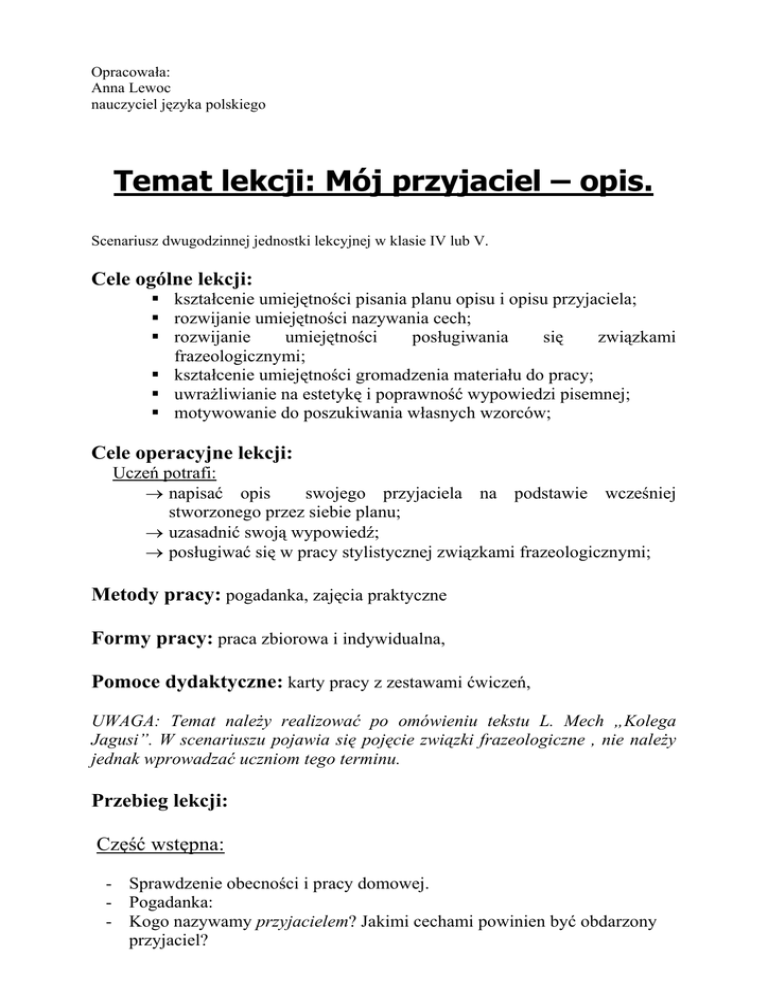 Opracowała: Anna Lewoc nauczyciel języka polskiego Temat lekcji: Mój przyjaciel – opis. Scenariusz dwugodzinnej jednostki lekcyjnej w klasie IV lub V. Cele ogólne lekcji: kształcenie umiejętności pisania planu opisu i opisu przyjaciela; rozwijanie umiejętności nazywania cech; rozwijanie umiejętności posługiwania się związkami frazeologicznymi; kształcenie umiejętności gromadzenia materiału do pracy; uwrażliwianie na estetykę i poprawność wypowiedzi pisemnej; motywowanie do poszukiwania własnych wzorców; Cele operacyjne lekcji: Uczeń potrafi: → napisać opis swojego przyjaciela na podstawie wcześniej stworzonego przez siebie planu; → uzasadnić swoją wypowiedź; → posługiwać się w pracy stylistycznej związkami frazeologicznymi; Metody pracy: pogadanka, zajęcia praktyczne Formy pracy: praca zbiorowa i indywidualna, Pomoce dydaktyczne: karty pracy z zestawami ćwiczeń, UWAGA: Temat należy realizować po omówieniu tekstu L. Mech „Kolega Jagusi”. W scenariuszu pojawia się pojęcie związki frazeologiczne , nie należy jednak wprowadzać uczniom tego terminu. Przebieg lekcji: Część wstępna: - Sprawdzenie obecności i pracy domowej. - Pogadanka: - Kogo nazywamy przyjacielem? Jakimi cechami powinien być obdarzony przyjaciel? Ćwiczenie 1 ROZPISYWANIE SŁOWA Na tablicy wielkimi literami piszemy słowo PRZYJACIEL, uczniowie dopisują do niego na zasadzie luźnych skojarzeń inne wyrazy, tworzą jakby krzyżówkę. Ćwiczenie uczniowie zapisują na kartach pracy. – praca zbiorowa. Część właściwa lekcji: Podanie tematu lekcji: Mój przyjaciel – opis. Ćwiczenie 2 UZUPEŁNIANKA: Uczniowie uzupełniają związki frazeologiczne nazwami zwierząt.( na kartach pracy ) – praca indywidualna. Ćwiczenie 3 PRZYJACIEL: Uczniowie schemat postaci przyjaciela, uzupełniają związkami frazeologicznymi z ćwiczenia 2. – praca indywidualna. Ćwiczenie 4 PLAN OPISU: Uczniowie plan opisu uzupełniają własnymi wyrazami i związkami frazeologicznymi, pasującymi do opisywanej przez siebie, konkretnej, postaci. - praca indywidualna. Ćwiczenie 5 OPIS PRZYJACIELA Na podstawie przygotowanego planu uczniowie piszą opis swojego przyjaciela, swojej przyjaciółki. - praca indywidualna. Ewaluacja: - Odczytanie przez chętnych uczniów swoich prac. - Pogadanka: Czy łatwo jest znaleźć przyjaciela? Czy każdy potrzebuje przyjaciół? Jak należy pielęgnować przyjaźń? - Ocena pracy uczniów. Praca domowa: Na pisz list do swojego przyjaciela. Opowiedz mu, jak spędziłeś dzień. Karta pracy - Mój przyjaciel- opis. ĆWICZENIE 1 Rozpisywanie słowa: P R Z Y J A I E L ĆWICZENIE 2 Uzupełnianka: pracowity jak .............................. dumny jak .................................. szybki jak ................................... łagodny jak ................................ mądry jak .................................. ma długie nogi jak ...................... włosy ma jak .............................. uszy jak ..................................... silny jak ..................................... duży jak .................................... uśmiechnięty jak ........................ zwinny jak ................................. wysoki jak ................................. uparty jak ................................. potulny jak ................................ jest pulchny jak ......................... oczy duże jak ............................ cichy jak .................................. niezgrabny jak .......................... ....................... usta Umysłowość: ĆWICZENIE 3 Przyjaciel: Wygląd: Charakter: ĆWICZENIE 4 Plan opisu: I Wstęp – przedstawienie postaci: ....................................................... ............................................................................................ II Rozwinięcie - 1) wygląd ................................................................... ............................................................................................ ............................................................................................ ............................................................................................ ............................................................................................ 2) cechy charakteru ................................................... ............................................................................................ ............................................................................................ ............................................................................................ ............................................................................................ III Zakończenie – ocena postaci: .......................................................... ............................................................................................ ............................................................................................