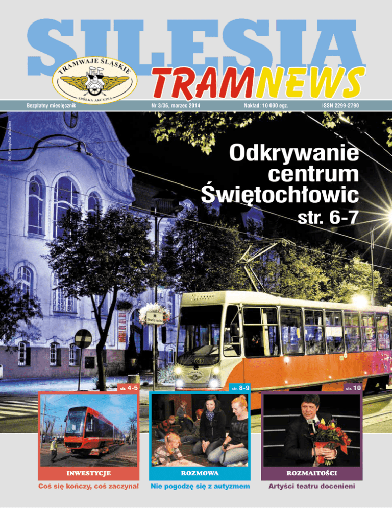 Wydarzenia Nr 3/36, marzec 2014 Fot. Przemysław Wacławek Bezpłatny miesięcznik Nakład: 10 000 egz. ISSN 2299-2790 Odkrywanie centrum Świętochłowic str. 6-7 str. 4-5 str. 8-9 str. 10 INWESTYCJE ROZMOWA ROZMAITOŚCI Coś się kończy, coś zaczyna! Nie pogodzę się z autyzmem Artyści teatru docenieni 1 Aktualności Zdrowych, radosnych i pełnych rodzinnego ciepła Świąt Wielkanocnych życzą wszystkim korzystającym z usług transportu publicznego Pracownicy Tramwajów Śląskich S.A. Jedźmy razem Przypisywane Konfucjuszowi przekleństwo człowieczego losu - „Obyś żył w ciekawych czasach” najprawdopodobniej w ogóle nie pochodzi z Chin, ani z zamierzchłych dziejów, a jego popularność nabierała tempa niedługo przed wybuchem II wojny światowej. Bez względu na pochodzenie słów tego porzekadła i barwność jego legendy jest to przekaz niezwykle uniwersalny – każdy z nas może go spokojnie odnieść do siebie. Bo przecież ciekawe czasy były, są i będą! Pomysły rządzących, zmiany, reformy, ciągła karuzela wydarzeń, postęp nauki, anomalia pogodowe, jednostki powszechnie szanowane i osobowości nieobliczalne, potrafiące wzbudzać lęk w najodleglejszych zakątkach globu... Widząc to wszystko, każdy człowiek na poczekaniu znajdzie dla siebie dowód na to, że przekleństwo ciekawych czasów dotyczy i jego. Jest co najmniej drugie przesłanie tego porzekadła. Ciekawe czasy to również synonim dynamicznie zachodzących zmian - rozszerzenia ludzkiej wrażliwości, horyzontów myślenia i działania, poprawy warunków życia. To drugie przesłanie jest obecnie znacznie bliższe pracownikom Tramwajów Śląskich. Dzięki unijnym środkom wprowadzamy na tory nowoczesność na najwyższym poziomie. Postępowi prac sprzyjała w ostatnich miesiącach nad wyraz łagodna zima. Mam świadomość, że jeszcze teraz modernizacje i zmiany kojarzą się naszym pasażerom przede wszystkim z utrudnieniami, zmianami tras, rozkładów jazdy i zawieszaniem kursów poszczególnych linii. Przebudowy nie da się przeprowadzić inaczej, staramy się jednak uciążliwości te ograniczać do możliwego minimum, niejednokrotnie przesuwając je na czas weekendów, gdy liczba osób korzystających z komunikacji publicznej jest wyraźnie mniejsza. W Tramwajach Śląskich wiele się ostatnio dzieje. Żyjemy w ciekawych czasach – w jak najbardziej pozytywnym znaczeniu tego porzekadła... Złote i srebrne medale dla pracowników Tramwajów Śląskich - W imieniu Prezydenta Rzeczpospolitej Polskiej, na wniosek Wojewody Śląskiego... - tak brzmią pierwsze słowa, które usłyszał każdy pracownik Tramwajów Śląskich odznaczony medalem za długoletnią służbę. Uroczystość wręczenia medali państwowych odbyła się w Śląskim Urzędzie Wojewódzkim w Katowicach. W środę, 19 marca br. reprezentacyjny westybul gmachu Śląskiego Urzędu Wojewódzkiego gościł wielu zasłużonych i wyróżniających się pracowników firm i urzędów z całego województwa śląskiego. W tym gronie znalazło się 7 pracowników spółki Tramwaje Śląskie. Gości przywitała Orkiestra Policyjna Komendy Wojewódzkiej Policji w Katowicach, a odznaczenia - w imieniu Prezydenta Rzeczpospolitej Polskiej - wręczył Wicewojewoda Śląski Piotr Spyra. Złotym medalem za długoletnią służbę odznaczeni zostali: Prezes Zarządu - Dyrektor Naczelny Tadeusz Freisler, Członek Zarządu - Dyrektor Wykonawczy Bolesław Knapik oraz pracownicy - Jan Głowania, Janusz Brela, Józef Dastych i Andrzej Zarębski. Srebrny medal za długoletnią służbę otrzymał Ireneusz Kostrzewski. - Te odznaczenia są dla nas namacalnym dowodem, że zaangażowanie w codzienną realizację postawionych przed nami zadań, doceniane jest również na najwyższym szczeblu - powiedział w imieniu odznaczonych prezes Tadeusz Freisler i dodał: - W takich chwilach zdajemy sobie sprawę, że każdy z nas jest istotnym elementem całej tramwajowej machiny, której funkcjonowanie zapewnia milionom mieszkańców Aglomeracji codzienny dojazd do szkoły, pracy, na zakupy czy do kina. Tadeusz Freisler Prezes Zarządu Tramwaje Śląskie S.A. Wydawca: Agencja Mediów Lokalnych mediaL 41-500 Chorzów, ul. Katowicka 105/2, tel. 32 2413 374 Redaktor naczelny: Waldemar Kosior Druk: Polskapresse Sp. z o.o Za treść ogłoszeń redakcja nie odpowiada Fot. Andrzej Zowada 2 Odznaczeni pracownicy Tramwajów Śląskich S.A. w Urzędzie Wojewódzkim w Katowicach. 3 Aktualności Ulica Kościuszki w Katowicach Wystartował drugi etap prac Od początku roku trwają prace przy modernizacji torowiska tramwajowego na ul. Kościuszki w Katowicach. Pierwszy etap obejmujący fragment od ul. Szeligiewicza do stadionu AWF wkroczył właśnie w drugą fazę, a jednocześnie rozpoczął się etap drugi - od Kinoteatru Rialto do pl. Miarki. Modernizacja ul. Kościuszki w Katowicach realizowana jest we współpracy z Urzędem Miasta Katowice. Ulica zostanie gruntownie przebudowana - wymienione zostaną instalacje: gazowa, elektryczna i kanalizacyjna, pojawi się nowe oświetlenie, przebudowane zostaną chodniki i jezdnia, inny będzie także układ miejsc parkingowych. Samo torowisko zostanie przesunięte w kierunku wschodnim, czyli bliżej numerów parzystych. - Dzięki temu zyskamy miejsce na nowe perony przystankowe w formie wysepek na środku ulicy. To znacząco wpłynie na poziom bezpieczeństwa pasażerów tramwajów - zaznacza dyrektor ds. inwestycji Tramwajów Śląskich S.A. Andrzej Bywalec. Realizację zadania tramwajowego na odcinku od Kinoteatru Rialto do pl. Miarki zaplanowano do połowy sierpnia. W kolejnym etapie planowane jest rozpoczęcie robót na odcinku od pl. Miarki do ul. Szeligiewicza. Całość prac - zgodnie z zapisami umowy - planujemy zakończyć w pierwszym kwartale 2015 r. Koszt zadania tramwajowego to niespełna 9,8 mln zł. netto. Prace realizowane są w ramach Projektu pn.: “Modernizacja infrastruktury tramwajowej i trolejbu
