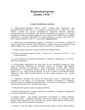Regulamin programu „Punkty z POL ” I.POSTANOWIENIA OGÓLNE 1.1. Organizatorem programu „Punkty z POL”, zwanego dalej „Programem”, jest International Paper Polska Sp. z o.o. z siedzibą w Krakowie, przy ul. Lubicz 23, 31-503 Kraków, wpisana do rejestru przedsiębiorców Krajowego Rejestru Sądowego prowadzonego przez Sąd Rejonowy dla Krakowa Śródmieścia w Krakowie, XI Wydział Gospodarczy Krajowego Rejestru Sądowego, pod numerem KRS 0000053310, o kapitale zakładowym w wysokości 500 000,00 zł w pełni wpłaconym, o numerze NIP 599-27-07690, o numerze REGON 211067311, zwana dalej "Organizatorem". 1.2. Organizator jest przyrzekającym nagrodę w rozumieniu art. 919 kodeksu cywilnego. W imieniu organizatora Nagrody zostaną zakupione i wydane (wręczone, przekazane) przez Spółkę TheBrave Sp. z o.o., z siedzibą w Warszawie 00-478, Al. Ujazdowskie 24/12. 1.3. Program organizowany jest na terytorium Rzeczypospolitej Polskiej. 1.4. Program prowadzony będzie od dnia 17 lutego 2016 r. do dnia 31.12.2016 r. ( Czas trwania programu ) 1.5. Celem Programu jest promocja Organizatora i produktów znajdujących się w ofercie handlowej Organizatora. 1.6. Zamierzeniem Organizatora ani celem akcji nie jest utrudnianie dostępu do rynku innym podmiotom oferującym do sprzedaży wyroby lub produkty odpowiadające rodzajowo wyrobom lub produktom z oferty Organizatora (zwanym dalej: "Innymi Podmiotami"), w szczególności warunki udziału w Programie oraz warunki zdobywania nagród nie są w żaden sposób uzależnione od liczby wyrobów lub produktów Innych Podmiotów, które kupił Uczestnik zarówno w czasie trwania Programu, jak i po jego zakończeniu. 1.7. Organizator zastrzega sobie prawo do dokonywania zmian w Regulaminie, pod warunkiem że nie wpływa to na pogorszenie warunków uczestnictwa w Programie. Wszelkie zmiany w Regulaminie będą ogłaszane z 14-dniowym wyprzedzeniem na Stronie Internetowej Programu oraz w siedzibie Organizatora. 1.8. Dla potrzeb Programu przyjęto następujące definicje: a) Formularz Rejestracyjny - formularz zgłoszenia uczestnictwa w Programie, udostępniony na Stronie Internetowej Programu . b) Katalog Nagród – lista Nagród oferowanych Uczestnikom w ramach Programu, zawierająca nazwy i fotografie elementów rzeczowych Nagród oraz wskazanie liczby Punktów, jakimi dysponować musi Uczestnik, aby otrzymać daną Nagrodę, zamieszczona i aktualizowana na Stronie Internetowej Programu. c) Nagroda – towar lub usługa, na którą Uczestnik będzie mógł wymienić zdobyte Punkty, wskazana w Katalogu Nagród, o Wartości Punktowej wskazanej w Katalogu Nagród. d) Punkty – punkty przyznawane Uczestnikom Programu na zasadach określonych Regulaminem. e) Regulamin – niniejszy regulamin Programu „Punkty z POL”. f) Strona Internetowa Programu - serwis internetowy o adresie www.punktyzpol.pl. g) Uczestnik – osoba fizyczna prowadząca działalność gospodarczą, osoba prawna lub jednostka organizacyjna niebędąca osobą prawną, której ustawa przyznaje zdolność prawną, mająca miejsce zamieszkania lub siedzibę na terytorium Rzeczypospolitej Polskiej, spełniająca warunki przewidziane Regulaminem, która zgłosiła swój udział w Programie na warunkach określonych Regulaminem. h) Wartość Punktowa - liczba Punktów zebranych w Programie, którymi musi dysponować i które musi wymienić Uczestnik, aby otrzymać daną Nagrodę, wskazaną w Katalogu Nagród. i) Produkty – wyroby lub produkty Organizatora przeznaczone do sprzedaży detalicznej wskazane w Regulaminie. II. UCZESTNICY 2.1. Program przeznaczony jest dla: a) osób fizycznych, mających pełną zdolność do czynności prawnych, mających miejsce zamieszkania na terytorium Rzeczypospolitej Polskiej, prowadzących działalność gospodarczą na terytorium Rzeczypospolitej Polskiej, w ramach której korzystają z Produktów Organizatora, b) osób prawnych mających siedzibę na terytorium Rzeczypospolitej Polskiej, które na terytorium Rzeczypospolitej Polskiej prowadzą działalność gospodarczą, w ramach której korzystają z Produktów Organizatora, c) jednostek organizacyjnych niebędących osobami prawnymi, którym ustawa przyznaje zdolność prawną, mających siedzibę na terytorium Rzeczpospolitej Polskiej, które na terytorium Rzeczypospolitej Polskiej prowadzą działalność gospodarczą, w ramach której korzystają z Produktów Organizatora. 2.2. Uczestnikiem Programu może zostać tylko podmiot spełniający jeden z warunków wskazanych w punkcie 2.1. 2.3. Podanie danych, w tym danych osobowych, związanych z Programem jest dobrowolne, ale niezbędne do wzięcia udziału w Programie. 2.4. W Programie nie mogą brać udziału pracownicy Organizatora oraz podmiotów działających na zlecenie Organizatora w zakresie obsługi Programu, a także członkowie rodzin wymienionych osób. Przez członków rodziny rozumie się: wstępnych, zstępnych, rodzeństwo, małżonków, małżonków rodzeństwa, rodziców małżonków, kuzynów i osoby pozostające w stosunku przysposobienia. 2.5. W Programie nie mogą brać udziału podmioty powiązane kapitałowo lub osobowo z oficjalnymi dystrybutorami produktów Organizatora (których lista znajduje się w załączniku nr 1 do niniejszego regulaminu). 3 III. PRZYSTĄPIENIE DO PROGRAMU 3.1. Osoba spełniająca jeden z warunków opisanych w pkt 2.1., z zastrzeżeniem pkt. 2.4 i 2.5., może przystąpić do Programu, w sposób określony w pkt. 3.2 i 3.3. . 3.2. Aby wziąć udział w Programie, należy w Czasie trwania Programu. wypełnić Formularz Rejestracyjny dostępny na Stronie Internetowej Programu. Przystąpienie do Programu następuje poprzez wypełnienie i zatwierdzenie Formularza Rejestracyjnego umieszczonego na Stronie Internetowej Programu zgodnie z instrukcjami zawartymi na tej Stronie, przesłanie na adres Organizatora : Aleje Jerozolimskie 65/79, Warszawa, a następnie potwierdzenie przystąpienia zgodnie z pk