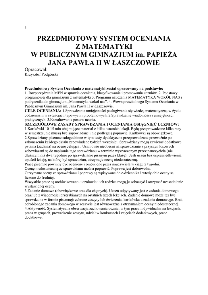 1 PRZEDMIOTOWY SYSTEM OCENIANIA Z MATEMATYKI W PUBLICZNYM GIMNAZJUM im. PAPIEŻA JANA PAWŁA II W ŁASZCZOWIE Opracował: Krzysztof Podgórski Przedmiotowy System Oceniania z matematyki został opracowany na podstawie: 1. Rozporządzenia MEN w sprawie oceniania, klasyfikowania i promowania uczniów. 2. Podstawy programowej dla gimnazjum z matematyki 3. Programu nauczania MATEMATYKA WOKÓŁ NAS i podręcznika do gimnazjum „Matematyka wokół nas”. 4. Wewnątrzszkolnego Systemu Oceniania w Publicznym Gimnazjum im. Jana Pawła II w Łaszczowie. CELE OCENIANIA: 1.Sprawdzanie umiejętności posługiwania się wiedzą matematyczną w życiu codziennym w sytuacjach typowych i problemowych. 2.Sprawdzanie wiadomości i umiejętności praktycznych. 3.Kształtowanie postaw ucznia. SZCZEGÓŁOWE ZASADY SPRAWDZANIA I OCENIANIA OSIĄGNIĘĆ UCZNIÓW: 1.Kartkówki 10-15 min obejmujące materiał z kilku ostatnich lekcji. Będą przeprowadzane kilka razy w semestrze, nie muszą być zapowiadane i nie podlegają poprawie. Kartkówki są obowiązkowe. 2.Sprawdziany pisemne całogodzinne w tym testy dydaktyczne przeprowadzane przeważnie po zakończeniu każdego działu zapowiadane tydzień wcześniej. Sprawdziany mogą zawierać dodatkowe pytania (zadania) na ocenę celującą . Uczniowie nieobecni na sprawdzianie z przyczyn losowych zobowiązani są do napisania tego sprawdzianu w terminie wyznaczonym przez nauczyciela (nie dłuższym niż dwa tygodnie po sprawdzianie pisanym przez klasę). Jeśli uczeń bez usprawiedliwienia opuścił lekcję, na której był sprawdzian, otrzymuje ocenę niedostateczną. Prace pisemne powinny być ocenione i omówione przez nauczyciela w ciągu 2 tygodni. Ocenę niedostateczną ze sprawdzianu można poprawić. Poprawa jest dobrowolna. Otrzymane oceny ze sprawdzianu i poprawy są wpisywane do e-dziennika i wtedy obie oceny są liczone do średniej. Wszystkie prace są archiwizowane- uczniowie i ich rodzice mogą je zobaczyć i otrzymać uzasadnienie wystawionej oceny. 3.Zadanie domowe (obowiązkowe oraz dla chętnych). Uczeń odpytywany jest z zadania domowego oraz/lub z wiadomości przerabianych na ostatnich trzech lekcjach. Zadanie domowe może tez być sprawdzone w formie pisemnej: zebrane zeszyty lub ćwiczenia, kartkówka z zadania domowego. Brak odrobionego zadania domowego w zeszycie jest równoważne z otrzymaniem oceny niedostatecznej. 4.Aktywność. Systematyczna obserwacja zachowania ucznia, w tym praca indywidualna na lekcjach, praca w grupach, prowadzenie zeszytu, udział w konkursach i zajęciach dodatkowych, prace dodatkowe. 6. Bieżące oceny z prac pisemnych wystawiane są na podstawie progów procentowych: 0% - 32% niedostateczny 33% - 52% dopuszczający 53% -69% dostateczny 70% - 84% dobry 85% - 94% bardzo dobry 95% - 100% celujący 7. Uczeń zobowiązany jest do posiadania podręcznika i prowadzenia zeszytu przedmiotowego. Oceny wystawiane przez nauczyciela są jawne. SPOSÓB INFORMOWANIA UCZNIÓW: Na pierwszej godzinie lekcyjnej nauczyciel zapoznaje uczniów z PSO. Wymagania na poszczególne oceny udostępnione są wszystkim uczniom na stronie szkoły. Oceny cząstkowe są jawne, oparte o opracowane kryteria. Sprawdziany i inne prace pisemne są przechowywane w szkole do końca danego roku szkolnego. ZASADY WYSTAWIANIA OCENY ZA I PÓŁROCZE I KOŃCOWOROCZNEJ; Ocena wystawiana jest na podstawie średniej ważonej z ocen cząstkowych: Średnia 1-1,5 - ocena niedostateczna Średnia 1,51-2,5 - ocena dopuszczająca Średnia 2,51-3,5 - ocena dostateczna Średnia 3,51-4,5 - ocena dobra Średnia 4,51-5,5 - ocena bardzo dobra Średnia 5,51-6 - ocena celująca Wagi przypisane poszczególnym kategoriom oceniania: Sprawdzian - waga oceny 3 Kartkówka/odpowiedź - waga oceny Aktywność - waga oceny 1 Zadanie domowe - waga oceny 1 SPOSOBY KORYGOWANIA NIEPOWODZEŃ SZKOLNYCH I PODNOSZENIA OSIĄGNIĘĆ UCZNIÓW: 1.Możliwość poprawy oceny ze sprawdzianu w przypadku oceny niedostatecznej. 2.Uczeń może być zwolniony ze sprawdzianu, kartkówki lub odpowiedzi ustnej w wyjątkowych sytuacjach losowych. 3.Istnieje możliwość konsultacji z nauczycielem w przypadku, gdy uczeń zgłosi chęć uzupełnienia braków z przedmiotu. Wymagania ogólne na poszczególne stopnie szkolne Uczeń otrzymuje ocenę: - dopuszczającą, gdy: pracuje na lekcji i w domu na miarę swoich możliwości, uczestniczy w zajęciach dodatkowych (konsultacjach) w terminach ustalonych z nauczycielem, z pomocą nauczyciela wykonuje proste zadania, opanował wiadomości i umiejętności na poziomie wymagań koniecznych w stopniu, który pozwoli mu świadomie uczestniczyć w lekcjach matematyki i kontynuować naukę w klasie programowo wyższej; - dostateczną, gdy: pracuje na lekcji i w domu na miarę swoich możliwości, odrabia zadania domowe, zadane prace wykonuje sumiennie i oddaje w wyznaczonym terminie, opanował wiadomości i umiejętności na poziomie wymagań podstawowych w stopniu, który pozwoli mu rozwiązywać (również z pomocą nauczyciela) zadania o stosunkowo niewielkim stopniu trudności, związane z życiem codziennym i środowiskiem ucznia; - dobrą, gdy: aktywnie pracuje na lekcji i w domu, systematycznie odrabia zadania domowe, zadane prace wykonuje sumiennie i oddaje w wyznaczonym terminie, opanował wiadomości i umiejętności na poziomie wymagań rozszerzających w stopniu, który umożliwi sprawne i samodzielne posługiwanie się nabytą wiedzą i umiejętnościami przy rozwiązywaniu zadań typowych; - bardzo dobrą, gdy: aktywnie pracuje na lekcji wykazując się umiejętnością rozwiązywania problemów, uzasadniania i prezentowania własnych rozwiązań, systematycznie odrabia zadania domowe, rozwiązując również zadania dodatkowe, zadane prace oddaje w terminie, do ich opracowania wykorzystuje informacje z różnych źródeł, prezentuje je w ciekawej formie, sprawnie posługuje się językiem matematycznym, bierze udział w konkursach matematycznych, opano
