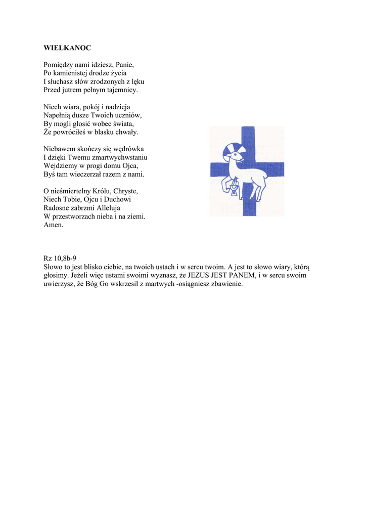 WIELKANOC Pomiędzy nami idziesz, Panie, Po kamienistej drodze życia I słuchasz słów zrodzonych z lęku Przed jutrem pełnym tajemnicy. Niech wiara, pokój i nadzieja Napełnią dusze Twoich uczniów, By mogli głosić wobec świata, Że powróciłeś w blasku chwały. Niebawem skończy się wędrówka I dzięki Twemu zmartwychwstaniu Wejdziemy w progi domu Ojca, Byś tam wieczerzał razem z nami. O nieśmiertelny Królu, Chryste, Niech Tobie, Ojcu i Duchowi Radosne zabrzmi Alleluja W przestworzach nieba i na ziemi. Amen. Rz 10,8b-9 Słowo to jest blisko ciebie, na twoich ustach i w sercu twoim. A jest to słowo wiary, którą głosimy. Jeżeli więc ustami swoimi wyznasz, że JEZUS JEST PANEM, i w sercu swoim uwierzysz, że Bóg Go wskrzesił z martwych -osiągniesz zbawienie. "Kto pozostaje w Chrystusie, jest nowym stworzeniem " Ks. Wiesław Coraz jaśniejsze słońce wyrywa świat z zimowego letargu. Skończył się czas milczenia skowronka. W przydomowych ogródkach zmartwychwstają kwiaty. Pośpiech odradzającego się życia raduje oczy i rozwesela duszę. Mija zmęczenie wywołane krajobrazem szarości. Wiosna przemienia świat jakby w nowe stworzenie. Wiosna to znaczy życie po śmierci, to przedziwny obraz nadziei dla stóp naszych rozpaczliwie błądzących po drogach ziemi, w której prochy minionych pokoleń niespokojnie czekają. Na życie czekają, bo na śmierć nie zgadza się nic, co umiera, nawet samobójca. Tenże wybierając bowiem śmierć, nie widzi w niej celu, lecz jedynie sposób ominięcia jakiejś trudności, która wydaje się mu nie do pokonania. Celem życia jest życie, a nie umieranie. Śmierć pod żadnym względem nie pasuje do życia, jest jego tragicznym brakiem i drapieżnym wrogiem. Śmierć -jak mówi Biblia "weszła przez zawiść diabła", który przy pomocy kłamstwa odwrócił człowieka od posłuszeństwa Bogu. W Księdze Rodzaju czytamy, że szatan snując swą wizję wielkości człowieka zaproponował mu, by sam decydował o tym, co ma być złe a co dobre. Miał być wtedy "jak Bóg", a stał się potworem. Tak dzieje się z człowiekiem, gdy porzuca przykazania Boże, a idzie za głosem diabła. Szatan bowiem przynosi takie dobro, co wywołuje potworność i wiedzie do śmierci. Z tą biblijną prawdą doświadczaną w życiu kojarzy się fabuła sztuki scenicznej Friedricha Durrenmatta zatytułowanej "Wizyta starszej pani". Autor opowiada jak to do pewnego miasteczka, które popadło w biedę przybyła bardzo bogata dama przywożąc ogromną sumę pieniędzy, którą zamierzała podzielić pomiędzy jego mieszkańców. Jednakże postawiła im warunek, aby zabili wskazanego przez nią pewnego człowieka. Nikt jednak nie chciał na to przystać, gdyż jak oznajmiono, ceniono sobie prawość. Owa bogata dama postanowiła zamieszkać w tym mieście do,; czasu, aż ktoś zmieni zdanie. Od tego dnia zaczęło coś zmieniać się w życiu jego mieszkańców. Zaczęli kupować nowe samochody, ubrania i domy. Nie byłoby w tym jeszcze nic dziwnego, gdyby nie to, że wszystko kupowali na kredyt, jakby mieli cichą nadzieje, że znajdzie się ktoś, kto spełni postawiony warunek. Człowiek, na którego został wydany wyrok śmierci, na wskutek przeżywanych lęków, doznał ataku serca i zmarł. Często jawią się nam propozycje takiego dobra, które rodzi potworność i śmierć. Wystarczy tu wspomnieć choćby prawo do aborcji - jako sposób na wolność, czy eutanazję - jako sposób na cierpienie i starość, czy narkotyki - jako sposób na szczęście, czy pokemonów pluszowych zabójców jako bezstresowy sposób na wychowanie dziecka. Jakże zupełnie inne dobro przynosi nam Chrystus. Uczy miłości, która " jest cierpliwa, nie szuka poklasku, nie unosi się pychą, nie dopuszcza się bezwstydu, nie szuka swego, nie unosi się gniewem, nie pamięta złego, nie cieszy się z niesprawiedliwości, lecz współweseli się z prawdą". A przez krzyż swój i zmartwychwstanie przynosi łaskę dar nowego życia. Jest ona wodą, kto ją pije, nigdy pragnąć nie będzie; jest ona chlebem, kto go spożywa, nigdy łaknąć nie będzie. W sakramentach jest jej źródło, a źródło to jest w Kościele. Każdy, kto czerpie z tego źródła, pozostaje w Chrystusie. "Kto pozostaje w Chrystusie, jest nowym stworzeniem" ze śmierci bowiem przechodzi do życia. Msze święte w Parafii p.w. Polikarpa Biskupa Męczennika W Parafii p.w. św. Polikarpa Biskupa Męczennika odprawiane będą msze św. w Kaplicy przy ul.Wodnika począwszy od Niedzieli Zmartwychwstania Pańskiego w godzinach: 8.30 10.00 dla dzieci 12.00 suma 18.00 Wierzyć sercem, świadczyć życiem DROGA DO CHRYSTUSA ABA Chrześcijanin wierzy, aby zrozumieć lecz także jest wezwany, by zrozumieć, aby wierzyć. Inaczej mówiąc jesteśmy wezwani do intelektualnego utwierdzania swojej wiary. Doskonałym, choć z niezrozumiałych powodów niestety mało wykorzystywanym źródłem intelektualnej podbudowy wiary są dokumenty kościelne a przede wszystkim niezwykle bogate dokumenty nauczania papieskiego listy apostolskie, encykliki, adhortacje apostolskie czy katechezy. Wydany z okazji zakończenia Roku Jubileuszowego 2000 list apostolski NOVO MILLENNIO INEUNTE przynosi kolejną "naukę" papieską. Pierwsza część listu to przypomnienie najbardziej charakterystycznych uroczystości jubileuszowych głównie w Rzymie chociaż nie tylko, gdyż Papież wraca również myślą do swojej pielgrzymki do Ziemi Świętej. Papież w końcowej części listu pisze : Teraz powinniśmy spojrzeć w przyszłość, "wypłynąć na głębię" - przed Kościołem otwiera się nowy etap drogi, rozbrzmiewa w naszych sercach echo słów, jakimi pewnego dnia Jezus, skończywszy przemawiać do tłumów z łodzi Szymona wezwał Apostoła "aby wypłynął na głębię, na połów ryb. Piotr i jego pierwsi towarzysze zaufali słowu Chrystusa i zarzucili sieci. Skoro to uczynili, zagarnęli (...) wielkie mnóstwo ryb" (