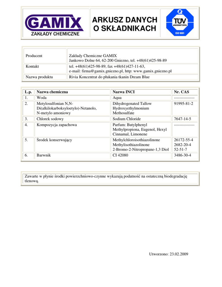 ARKUSZ DANYCH O SKŁADNIKACH ZAKŁADY CHEMICZNE Producent Kontakt Nazwa produktu L.p. 1. 2. Zakłady Chemiczne GAMIX Jankowo Dolne 64, 62-200 Gniezno, tel. +48(61)425-98-89 tel. +48(61)425-98-89, fax +48(61)427-11-63, e-mail: [email protected], http: www.gamix.gniezno.pl Rivia Koncentrat do płukania tkanin Dream Blue 3. 4. Nazwa chemiczna Woda Metylosulfonian N,NDi(alkilokarboksyloetylo)-Netanolo, N-metylo amoniowy Chlorek sodowy Kompozycja zapachowa 5. Środek konserwujący 6. Barwnik Nazwa INCI Aqua Dihydrogenated Tallow Hydroxyethylmonium Methosulfate Sodium Chloride Parfum: Butylphenyl Methylpropiona, Eugenol, Hexyl Cinnamal, Limonene Methylchloroisothiazolinone Methylisothiazolinone 2-Bromo-2-Nitropropane-1,3 Diol CI 42080 Nr. CAS --------------91995-81-2 7647-14-5 --------------- 26172-55-4 2682-20-4 52-51-7 3486-30-4 Zawarte w płynie środki powierzchniowo-czynne wykazują podatność na ostateczną biodegradację tlenową. Utworzono: 23.02.2009