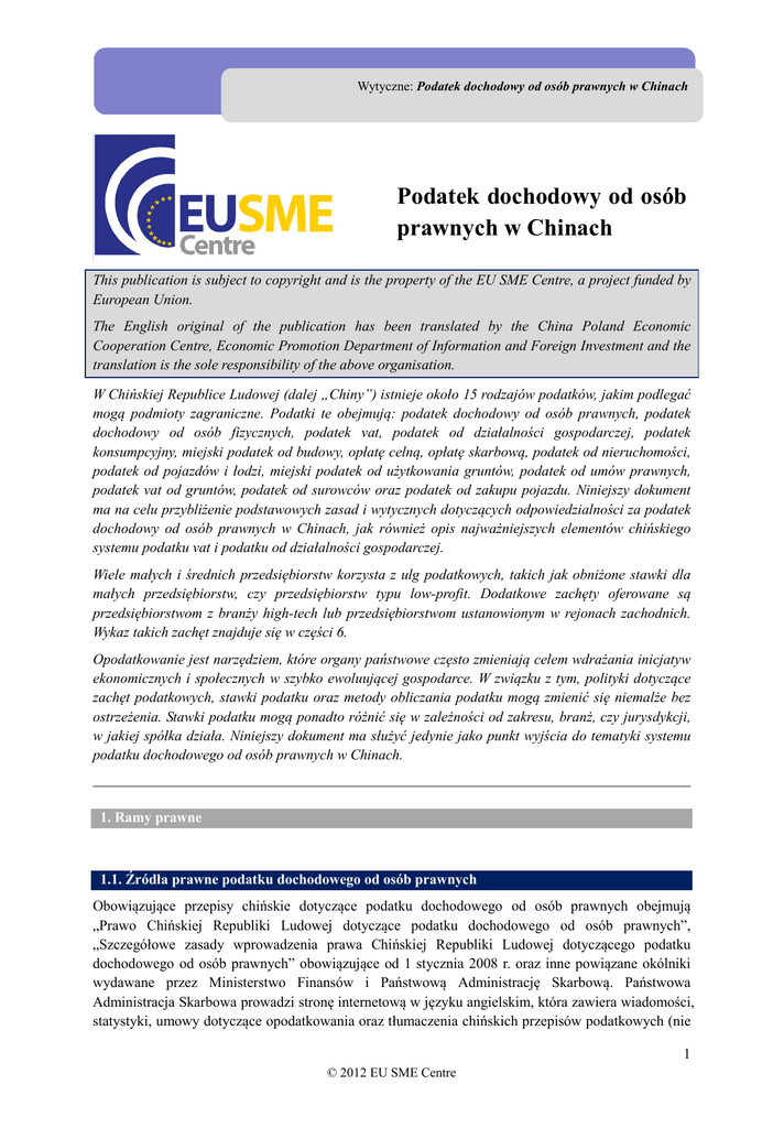 Wytyczne: Podatek dochodowy od osób prawnych w Chinach Podatek dochodowy od osób prawnych w Chinach This publication is subject to copyright and is the property of the EU SME Centre, a project funded by European Union. The English original of the publication has been translated by the China Poland Economic Cooperation Centre, Economic Promotion Department of Information and Foreign Investment and the translation is the sole responsibility of the above organisation. W Chińskiej Republice Ludowej (dalej „Chiny”) istnieje około 15 rodzajów podatków, jakim podlegać mogą podmioty zagraniczne. Podatki te obejmują: podatek dochodowy od osób prawnych, podatek dochodowy od osób fizycznych, podatek vat, podatek od działalności gospodarczej, podatek konsumpcyjny, miejski podatek od budowy, opłatę celną, opłatę skarbową, podatek od nieruchomości, podatek od pojazdów i łodzi, miejski podatek od użytkowania gruntów, podatek od umów prawnych, podatek vat od gruntów, podatek od surowców oraz podatek od zakupu pojazdu. Niniejszy dokument ma na celu przybliżenie podstawowych zasad i wytycznych dotyczących odpowiedzialności za podatek dochodowy od osób prawnych w Chinach, jak również opis najważniejszych elementów chińskiego systemu podatku vat i podatku od działalności gospodarczej. Wiele małych i średnich przedsiębiorstw korzysta z ulg podatkowych, takich jak obniżone stawki dla małych przedsiębiorstw, czy przedsiębiorstw typu low-profit. Dodatkowe zachęty oferowane są przedsiębiorstwom z branży high-tech lub przedsiębiorstwom ustanowionym w rejonach zachodnich. Wykaz takich zachęt znajduje się w części 6. Opodatkowanie jest narzędziem, które organy państwowe często zmieniają celem wdrażania inicjatyw ekonomicznych i społecznych w szybko ewoluującej gospodarce. W związku z tym, polityki dotyczące zachęt podatkowych, stawki podatku oraz metody obliczania podatku mogą zmienić się niemalże bez ostrzeżenia. Stawki podatku mogą ponadto różnić się w zależności od zakresu, branż, czy jurysdykcji, w jakiej spółka działa. Niniejszy dokument ma służyć jedynie jako punkt wyjścia do tematyki systemu podatku dochodowego od osób prawnych w Chinach. 1. Ramy prawne 1.1. Źródła prawne podatku dochodowego od osób prawnych Obowiązujące przepisy chińskie dotyczące podatku dochodowego od osób prawnych obejmują „Prawo Chińskiej Republiki Ludowej dotyczące podatku dochodowego od osób prawnych”, „Szczegółowe zasady wprowadzenia prawa Chińskiej Republiki Ludowej dotyczącego podatku dochodowego od osób prawnych” obowiązujące od 1 stycznia 2008 r. oraz inne powiązane okólniki wydawane przez Ministerstwo Finansów i Państwową Administrację Skarbową. Państwowa Administracja Skarbowa prowadzi stronę internetową w języku angielskim, która zawiera wiadomości, statystyki, umowy dotyczące opodatkowania oraz tłumaczenia chińskich przepisów podatkowych (nie 1 © 2012 EU SME Centre Wytyczne: Podatek dochodowy od osób prawnych w Chinach gwarantuje się jednak kompleksowości ani aktualności tych informacji i należy je zweryfikować we własnym zakresie). 1.2. Płatnicy podatku dochodowego od osób prawnych Zgodnie z chińskim prawem dotyczącym podatku dochodowego od osób prawnych, wszelkie przedsiębiorstwa lub organizacje, które uzyskały dochód w Chinach, inne niż przedsiębiorstwa będące w pełni własnością kapitału prywatnego lub przedsiębiorstwa partnerskie, podlegają podatkowi dochodowemu od osób prawnych. Płatnicy podatku dochodowego od osób prawnych dzielą się na dwie osobne grupy: przedsiębiorstwa krajowe i przedsiębiorstwa zagraniczne. Przedsiębiorstwo krajowe jest definiowane jako przedsiębiorstwo, które: a) zostało prawomocnie ustanowione w Chinach; lub b) przedsiębiorstwo, które zostało ustanowione zgodnie z przepisami jurysdykcji zagranicznej, lecz którego faktyczna instytucja zarządzająca znajduje się w Chinach. W tym przypadku, faktyczna „instytucja zarządzająca” odnosi się do instytucji odpowiedzialnej w sposób zasadniczy i całościowy za zarządzanie i kontrolę nad produkcją, operacjami, personelem, finansami oraz aktywami przedsiębiorstwa. Przedsiębiorstwo zagraniczne jest definiowane jako przedsiębiorstwo, które: a) zostało prawomocnie ustanowione zgodnie z przepisami jurysdykcji zagranicznej i posiada swój faktyczny zarząd poza Chinami, lecz posiada swoje instytucje lub zarząd założony w Chinach, lub b) przedsiębiorstwa, które posiadają dochód pochodzący z Chin bez zakładania jakiejkolwiek formalnej chińskiej instytucji lub placówki. 1.3. Dochód podlegający podatkowi dochodowemu od osób prawnych Przedsiębiorstwa krajowe podlegają podatkowi dochodowemu od osób prawnych dla swoich dochodów uzyskanych globalnie. Przedsiębiorstwa zagraniczne podlegają natomiast jedynie podatkowi dochodowemu od osób prawnych dla dochodu pochodzącego z Chin oraz dochodu pochodzącego spoza Chin, lecz związanego z instytucjami lub placówkami w Chinach. Na przykład przedsiębiorstwo chińskie będące w całości własnością kapitału zagranicznego kwalifikuje się jako przedsiębiorstwo krajowe. Wszelki dochód, w tym dochód zagraniczny, podlega podatkowi dochodowemu od osób prawnych w Chinach. Rodzaje dochodów pochodzących z Chin obejmują między innymi: a) dochód ze sprzedaży dla transakcji zrealizowanych w Chinach; b) dochód z usług wyświadczonych w Chinach; c) dochód z cesji nieruchomości zlokalizowanych w Chinach; d) dochód z cesji ruchomości, w sytuacji gdy cedent był zlokalizowany w Chinach; e) dochód z dywidend uzyskany z przedsiębiorstw zlokalizowanych w Chinach, oraz f) dochód z odsetek, dochód z wynajmu lub dochód z tantiem uzyskany z przedsiębiorstw zlokalizowanych w Chinach lub osób zamieszkałych w Chinach. 1.4. Obowiązujące stawki podatku dochodowego od osób prawnych Standardowa stawka podatku do