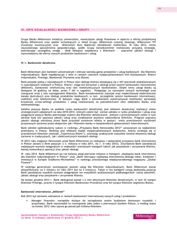 19 IV. OPIS DZIAŁALNOŚCI BIZNESOWEJ GRUPY Grupa Banku Millennium świadczy uniwersalne, nowoczesne usługi finansowe w oparciu o ofertę produktową Banku Millennium oraz spółek wchodzących w skład Grupy: Millennium Leasing (leasing), Millennium TFI (fundusze inwestycyjne) oraz Millennium Dom Maklerski (działalność maklerska). W roku 2012, mimo zauważalnego spowolnienia gospodarczego, spółki Grupy konsekwentnie realizowały przyjętą strategię, poświęcając szczególną uwagę - obok bieżącej współpracy z Klientami - poprawie jakości obsługi i wprowadzeniu do oferty nowych produktów bankowych i usług. IV.1. Bankowość detaliczna Bank Millennium jest bankiem uniwersalnym i oferuje szeroką gamę produktów i usług bankowych dla Klientów indywidualnych. Bank współpracuje z nimi w ramach czterech wyspecjalizowanych linii biznesowych: Klienci Indywidualni, Prestige, Bankowość Prywatna oraz Biznes. Bank posiada jedną z największych w Polsce sieci obsługi Klienta składającą się z 447 placówek zlokalizowanych w największych miastach w Polsce. Klienci mogą też korzystać z obsługi przez system bankowości internetowej (Millenet), bankowość telefoniczną oraz sieć wielofunkcyjnych bankomatów. Dzięki temu usługi Banku są dostępne 24 godziny na dobę, przez 7 dni w tygodniu. Podążając za rozwojem nowych technologii oraz rosnącymi wraz z nim wymaganiami Klientów, Bank konsekwentnie rozwijał oraz modernizował elektroniczne kanały dystrybucji oraz obsługi produktów bankowych, w tym szczególnie system bankowości internetowej, mobilnej oraz telefonicznej. W dalszym ciągu Bank z powodzeniem wykorzystywał możliwości sprzedaży krzyżowej (cross-selling) produktów i usług realizowanej za pośrednictwem sieci oddziałów Banku oraz telemarketingu. Solidna pozycja Banku na polskim rynku bankowości detalicznej jest efektem skutecznej realizacji celów strategicznych założonych na lata 2010-2012, których celem był wzrost udziału w rynku produktów i usług oraz osiągnięcie pozycji Banku pierwszego wyboru dla Klientów detalicznych. Jednym z priorytetowych celów w tym okresie była też poprawa jakości usług oraz zwiększenie poziomu zadowolenia Klientów. Program poprawy jakości obsługi wdrożony przez Bank przyniósł wymierne efekty w postaci wielu prestiżowych wyróżnień przyznanych zarówno przez ekspertów jak i Klientów banku w bezpośrednich głosowaniach internetowych. Bank odniósł spektakularny sukces w rankingu „Przyjazny Bank Newsweeka 2012” uznawanym za najbardziej prestiżowy w Polsce. Ranking jest efektem badań wyspecjalizowanych audytorów, którzy wcielają się w prawdziwych Klientów (metoda „Tajemniczy Klient”), oceniając praktycznie wszystkie istotne elementy obsługi zarówno w tradycyjnych, jak i elektronicznych kanałach obsługi. W 2012 roku magazyn Newsweek uznał Bank Millennium za najlepszy i najbardziej przyjazny bank internetowy w Polsce (awans o dwie pozycje: z 3. miejsca w roku 2011, na 1. w roku 2012). Zwycięstwo Bank zawdzięcza najlepszym ocenom osiągniętym w większości ocenianych kategorii takich jak pozyskanie i utrzymanie Klienta, kanały komunikacji operacji oraz jakość obsługi. W roku 2012 Bank Millennium po raz kolejny zajął pierwsze miejsce w kategorii „Najlepszy bank internetowy dla klientów indywidualnych w Polsce” oraz „Bank oferujący najlepszą internetową obsługę lokat, kredytów i inwestycji w Europie Środkowo-Wschodniej” w rankingu prestiżowego międzynarodowego magazynu „Global Finance”. W rankingu generalnym oceniającym poziom usług dla Klientów indywidualnych, Bank Millennium został sklasyfikowany na 2 miejscu (w roku 2011 był na 3 miejscu). Także w tej kategorii swoją doskonałą pozycję Bank zawdzięcza wysokim ocenom osiągniętym we wszystkich analizowanych podkategoriach: cechy placówki, jakość obsługi oraz pozyskanie i utrzymanie Klienta. Na koniec grudnia 2012 r. Bank obsługiwał ponad 1,2 mln aktywnych Klientów detalicznych, w tym 32 tysiące Klientów Prestige, prawie 2 tysiące Klientów Bankowości Prywatnej oraz 64 tysiące Klientów segmentu Biznes. Bankowość Internetowa „Millenet” Rok 2012 był okresem wdrożenia w ramach bankowości internetowej nowych usług i produktów: Manager finansów: narzędzie służące do zarządzania swoim budżetem domowym (wydatki i przychody). Bank wprowadził to rozwiązanie jako jeden z pierwszych banków Polsce, a według stanu na koniec 2012 roku używa go ponad pół miliona Klientów. Sprawozdanie Zarządu z działalności Grupy Kapitałowej Banku Millennium za okres 12 miesięcy zakończony 31 grudnia 2012 r. 20 Przelewy natychmiastowe: umożliwiają one dokonywanie przelewów zewnętrznych w trybie natychmiastowym. Bank Millennium był jednym z pierwszych banków, które wprowadziły tę usługę i pierwszym, który wprowadził ją dla wszystkich Klientów - indywidualnych i biznesowych. Oprócz udostępniania nowych produktów i funkcjonalności w ramach bankowości internetowej, systematycznie prowadzone są prace nad poprawą funkcjonalności strony internetowej. Zmiany i ulepszenia w tym zakresie są wprowadzane na podstawie testów z użytkownikami (eye-tracker), ankiet, a także otrzymywanych od Klientów komentarzy i sugestii. Przykładem takiej zmiany, dokonanej w 2012 roku, jest modyfikacja wyglądu strony głównej po zalogowaniu. Oprócz zmian graficznych, Klienci mają możliwość personalizowania zawartości strony. Liczba zarejestrowanych Klientów Millenet na koniec grudnia 2012 roku wynosiła 1 434 tys., co stanowi wzrost o 16% rok do roku. Wskaźnik wykorzystania bankowości internetowej (mierzony liczbą klientów „Millenet” z przynajmniej jednym przelewem w ciągu miesiąca) rośnie z roku na rok. W roku 2012 wzrósł on o 25%. Indywidualni Klienci w Millenet wykonują 96,5% wszystkich przelewów zewnętrznych (na rachunki w innych bankac