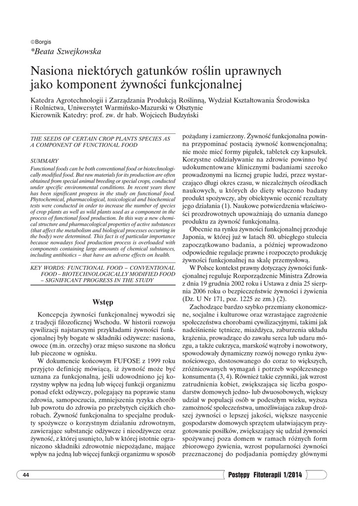 Borgis *Beata Szwejkowska Nasiona niektórych gatunków roślin uprawnych jako komponent żywności funkcjonalnej Katedra Agrotechnologii i Zarządzania Produkcją Roślinną, Wydział Kształtowania Środowiska i Rolnictwa, Uniwersytet Warmińsko-Mazurski w Olsztynie Kierownik Katedry: prof. zw. dr hab. Wojciech Budzyński THE SEEDS OF CERTAIN CROP PLANTS SPECIES AS A COMPONENT OF FUNCTIONAL FOOD SUMMARY Functional foods can be both conventional food or biotechnologically modified food. But raw materials for its production are often obtained from special animal breeding or special crops, conducted under specific environmental conditions. In recent years there has been significant progress in the study on functional food. Phytochemical, pharmacological, toxicological and biochemical tests were conducted in order to increase the number of species of crop plants as well as wild plants used as a component in the process of functional food production. In this way a new chemical structure and pharmacological properties of active substances (that affect the metabolism and biological processes occurring in the body) were determined. This fact is of particular importance because nowadays food production process is overloaded with components containing large amounts of chemical substances, including antibiotics – that have an adverse effects on health. KEY WORDS: FUNCTIONAL FOOD – CONVENTIONAL FOOD – BIOTECHNOLOGICALLY MODIFIED FOOD – SIGNIFICANT PROGRESS IN THE STUDY Wstęp Koncepcja żywności funkcjonalnej wywodzi się z tradycji filozoficznej Wschodu. W historii rozwoju cywilizacji najstarszymi przykładami żywności funkcjonalnej były bogate w składniki odżywcze: nasiona, owoce (m.in. orzechy) oraz mięso suszone na słońcu lub pieczone w ognisku. W dokumencie końcowym FUFOSE z 1999 roku przyjęto definicję mówiącą, iż żywność może być uznana za funkcjonalną, jeśli udowodniono jej korzystny wpływ na jedną lub więcej funkcji organizmu ponad efekt odżywczy, polegający na poprawie stanu zdrowia, samopoczucia, zmniejszenia ryzyka chorób lub powrotu do zdrowia po przebytych ciężkich chorobach. Żywność funkcjonalna to specjalne produkty spożywcze o korzystnym działaniu zdrowotnym, zawierające substancje odżywcze i nieodżywcze oraz żywność, z której usunięto, lub w której istotnie ograniczono składniki zdrowotnie niepożądane, mające wpływ na jedną lub więcej funkcji organizmu w sposób 44 pożądany i zamierzony. Żywność funkcjonalna powinna przypominać postacią żywność konwencjonalną; nie może mieć formy pigułek, tabletek czy kapsułek. Korzystne oddziaływanie na zdrowie powinno być udokumentowane klinicznymi badaniami szeroko prowadzonymi na licznej grupie ludzi, przez wystarczająco długi okres czasu, w niezależnych ośrodkach naukowych, u których do diety włączono badany produkt spożywczy, aby obiektywnie ocenić rezultaty jego działania (1). Naukowe potwierdzenia właściwości prozdrowotnych upoważniają do uznania danego produktu za żywność funkcjonalną. Obecnie na rynku żywności funkcjonalnej przoduje Japonia, w której już w latach 80. ubiegłego stulecia zapoczątkowano badania, a później wprowadzono odpowiednie regulacje prawne i rozpoczęto produkcję żywności funkcjonalnej na skalę przemysłową. W Polsce kontekst prawny dotyczący żywności funkcjonalnej reguluje Rozporządzenie Ministra Zdrowia z dnia 19 grudnia 2002 roku i Ustawa z dnia 25 sierpnia 2006 roku o bezpieczeństwie żywności i żywienia (Dz. U Nr 171, poz. 1225 ze zm.) (2). Zachodzące bardzo szybko przemiany ekonomiczne, socjalne i kulturowe oraz wzrastające zagrożenie społeczeństwa chorobami cywilizacyjnymi, takimi jak nadciśnienie tętnicze, miażdżyca, zaburzenia układu krążenia, prowadzące do zawału serca lub udaru mózgu, a także cukrzyca, marskość wątroby i nowotwory, spowodowały dynamiczny rozwój nowego rynku żywnościowego, dostosowanego do coraz to większych, zróżnicowanych wymagań i potrzeb współczesnego konsumenta (3, 4). Również takie czynniki, jak wzrost zatrudnienia kobiet, zwiększająca się liczba gospodarstw domowych jedno- lub dwuosobowych, większy udział w populacji osób w podeszłym wieku, wyższa zamożność społeczeństwa, umożliwiająca zakup droższej żywności o lepszej jakości, większe nasycenie gospodarstw domowych sprzętem ułatwiającym przygotowanie posiłków, zwiększający się udział żywności spożywanej poza domem w ramach różnych form zbiorowego żywienia, wzrost popularności żywności przeznaczonej do podjadania pomiędzy głównymi Postępy Fitoterapii 1/2014 Nasiona niektórych gatunków roślin uprawnych jako komponent żywności funkcjonalnej posiłkami – tzw. przekąsek, częstsze podróże związane ze zmianą sposobu spędzania wolnego czasu oraz dużą ruchliwością zawodową, powodują większy popyt konsumentów na żywność gotową, produkowaną metodami przemysłowymi, przeznaczoną do bezpośredniego spożycia lub po krótkiej obróbce termicznej. Sprzyjają też poznawaniu potraw pochodzących z innych obszarów kulturowych. Nie bez znaczenia jest także wzrost świadomości zdrowotnej konsumentów, to jest dążenie do utrzymania dobrego stanu zdrowia i spowolnienia procesów starzenia się (4, 5). Aby zapobiec niebezpiecznym chorobom i niewłaściwym nawykom żywieniowym poszukuje się skutecznych metod przeciwdziałania. W krajach wysoko rozwiniętych żywność funkcjonalna reprezentowana jest więc przez liczne produkty otrzymywane powszechnie, które spełniają oczekiwania konsumentów, a rynek żywności funkcjonalnej rozwija się szybciej, niż pozostały rynek żywnościowy. Powstają wyspecjalizowane konsorcja i firmy współpracujące z ośrodkami naukowymi w celu projektowania i wdrażania do produkcji nowych rodzajów żywności funkcjonalnej. Wielkie kompanie przemysłu spożywczego i farmaceutycznego przygotowują glo