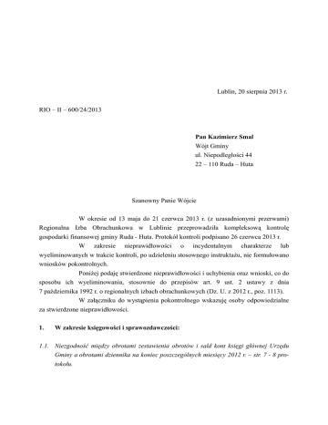 Lublin, 20 sierpnia 2013 r. RIO – II – 600/24/2013 Pan Kazimierz Smal Wójt Gminy ul. Niepodległości 44 22 – 110 Ruda – Huta Szanowny Panie Wójcie W okresie od 13 maja do 21 czerwca 2013 r. (z uzasadnionymi przerwami) Regionalna Izba Obrachunkowa w Lublinie przeprowadziła kompleksową kontrolę gospodarki finansowej gminy Ruda - Huta. Protokół kontroli podpisano 26 czerwca 2013 r. W zakresie nieprawidłowości o incydentalnym charakterze lub wyeliminowanych w trakcie kontroli, po udzieleniu stosownego instruktażu, nie formułowano wniosków pokontrolnych. Poniżej podaję stwierdzone nieprawidłowości i uchybienia oraz wnioski, co do sposobu ich wyeliminowania, stosownie do przepisów art. 9 ust. 2 ustawy z dnia 7 października 1992 r. o regionalnych izbach obrachunkowych (Dz. U. z 2012 r., poz. 1113). W załączniku do wystąpienia pokontrolnego wskazuję osoby odpowiedzialne za stwierdzone nieprawidłowości. 1. W zakresie księgowości i sprawozdawczości: 1.1. Niezgodność między obrotami zestawienia obrotów i sald kont księgi głównej Urzędu Gminy a obrotami dziennika na koniec poszczególnych miesięcy 2012 r. – str. 7 - 8 protokołu. 2 Zapewnić zgodność obrotów zestawienia obrotów i sald kont księgi głównej z obrotami dziennika, stosownie do przepisów art. 18 ust. 1 ustawy z dnia 29 września 1994 r. o rachunkowości (Dz. U. z 2013 r., poz. 330 z późn. zm.). 1.2. Dokonywanie zapisów na szczegółowych kontach podatników podatku od środków transportowych oraz w ewidencji analitycznej prowadzonej do konta 221 -2 „Należności z tytułu dochodów budżetowych – mienie”, bez wskazania rodzaju i numeru identyfikacyjnego dowodu księgowego, będącego podstawą zapisu – str. 13 protokołu. Zapisów w księgach rachunkowych dokonywać ze wskazaniem rodzaju i numeru identyfikacyjnego dowodu księgowego, stanowiącego podstawę zapisu, stosownie do przepisów art. 23 ust. 2 pkt 2 ustawy o rachunkowości. 1.3. Nieujęcie - przez Urząd Gminy - w deklaracji na podatek od nieruchomości na 2012 r. gruntów komunalnych oznaczonych symbolem „dr” (niebędących gruntami zajętymi pod pasy drogowe dróg publicznych), a w konsekwencji niewykazanie w sprawozdaniu Rb-PDP za 2012 r. skutków obniżenia górnych stawek oraz skutków udzielonych ulg i zwolnień w tym podatku (odpowiednio w kwocie co najmniej: 72.480 zł i 31.408 zł). Niezłożenie deklaracji na podatek od środków transportowych na 2012 r. przez Urząd Gminy, mimo posiadania pojazdu zwolnionego z podatku uchwałą Rady Gminy, a w konsekwencji niewykazanie - w sprawozdaniu Rb-PDP za 2012 r. - skutków obniżenia górnych stawek oraz skutków udzielonych ulg i zwolnień w tym podatku (odpowiednio w kwocie: 552,20 zł i 1.750 zł). Bezpodstawne złożenie przez Urząd Gminy deklaracji na podatek rolny, w której wykazano – jako zwolnione z tego podatku – nierozdysponowane gminne użytki rolne i w rezultacie wykazanie - w sprawozdaniu Rb-PDP za 2012 r. - skutków obniżenia górnej stawki oraz skutków udzielonych ulg i zwolnień w podatku rolnym dla tych gruntów (odpowiednio w kwocie: 1.167,70 zł i 3.905,33 zł) - str. 21 – 26, 33 protokołu. W deklaracji na podatek od nieruchomości wykazywać prawidłową powierzchnię gruntów komunalnych, zwolnionych z podatku od nieruchomości uchwałą Rady Gminy, mając na uwadze przepisy art. 6 ust. 10 i art. 3 ust. 1 pkt 1 ustawy z dnia 12 stycznia 1991 r. o podatkach i opłatach lokalnych (Dz. U. z 2010 r. Nr 95, poz. 613 z późn. zm.), w tym uwzględniać powierzchnię gruntów komunalnych oznaczonych w ewidencji geodezyjnej symbolem „dr” (drogi), niebędących gruntami zajętymi pod pasy drogowe dróg publicznych, w związku z art. 2 ust. 3 pkt 4 cytowanej ustawy i postanowieniami § 1 pkt 1 uchwały Nr XXXVIII/192/2010 Rady Gminy Ruda - Huta z dnia 28 stycznia 2010 r. w sprawie wprowadzenia zwolnień od podatku od nieruchomości na terenie Gminy Ruda - Huta. Prawidłowe sporządzenie deklaracji na podatek od nieruchomości umożliwi 3 rzetelne wykazanie danych w sprawozdaniu Rb-PDP „Roczne sprawozdanie z wykonania dochodów podatkowych gminy” w zakresie kwot stanowiących rzeczywiste skutki obniżenia górnych stawek podatków oraz udzielonych przez gminę ulg i zwolnień, stosownie do przepisów § 3 ust. 1 pkt 9 i 10 w związku z § 7 ust. 3 „Instrukcji sporządzania sprawozdań budżetowych w zakresie budżetów jednostek samorządu terytorialnego”, stanowiącej załącznik Nr 39 do rozporządzenia Ministra Finansów z dnia 3 lutego 2010 r. w sprawie sprawozdawczości budżetowej (Dz. U. Nr 20, poz. 103). Składać deklarację na podatek od środków transportowych, w związku z posiadaniem środka transportowego zwolnionego z tego podatku uchwałą Rady Gminy, mając na uwadze przepisy art. 9 ust. 1 i ust. 6 w związku z art. 8 ustawy o podatkach i opłatach lokalnych, a kwoty skutków obniżenia górnych stawek oraz skutków zwolnienia w tym podatku wykazać w sprawozdaniu Rb-PDP, sporządzonym w roku, w którym złożono deklaracje. Przestrzegać zasady wyrażonej w przepisach art. 3a pkt 2 w związku z art. 3 ust. 1 pkt 4 ustawy z dnia 15 listopada 1984 r. o podatku rolnym (Dz. U. z 2006 r. Nr 136, poz. 969 z późn. zm.), zgodnie z którą obowiązek podatkowy w podatku rolnym nie dotyczy gmin, co oznacza, że składanie przez Urząd Gminy deklaracji na podatek rolny oraz obliczanie skutków obniżenia górnej stawki oraz skutków udzielonych ulg i zwolnień w podatku rolnym dla użytków rolnych, stanowiących własność gminy, a niebędących w posiadaniu innych podmiotów, pozbawione jest podstaw prawnych. Kwotę niewłaściwie wykazanych skutków obniżenia górnych stawek oraz udzielonych ulg i zwolnień podatkowych w podatku rolnym, od nieruchomości oraz od środków transportowych wykazać, po złożeniu deklaracji (ich korekt), w prawidłowo sporządzonym sprawozdaniu Rb-PDP za rok, w którym złożono