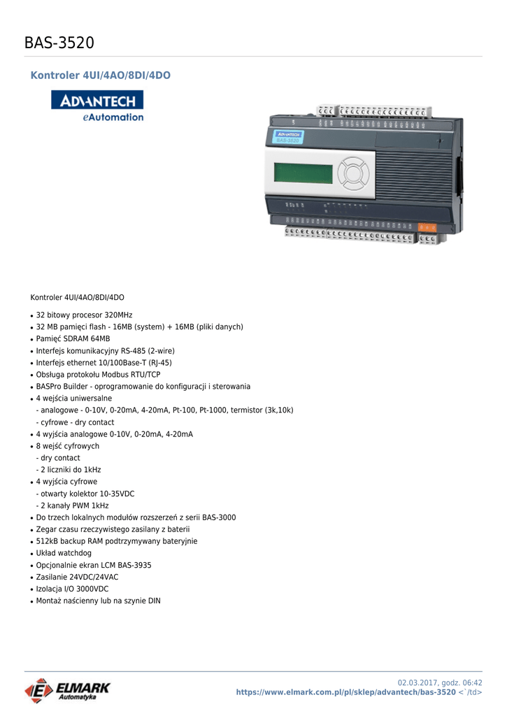 BAS-3520 Kontroler 4UI/4AO/8DI/4DO Kontroler 4UI/4AO/8DI/4DO ● 32 bitowy procesor 320MHz ● 32 MB pamięci flash - 16MB (system) + 16MB (pliki danych) ● Pamięć SDRAM 64MB ● Interfejs komunikacyjny RS-485 (2-wire) ● Interfejs ethernet 10/100Base-T (RJ-45) ● Obsługa protokołu Modbus RTU/TCP ● BASPro Builder - oprogramowanie do konfiguracji i sterowania ● 4 wejścia uniwersalne - analogowe - 0-10V, 0-20mA, 4-20mA, Pt-100, Pt-1000, termistor (3k,10k) - cyfrowe - dry contact ● 4 wyjścia analogowe 0-10V, 0-20mA, 4-20mA ● 8 wejść cyfrowych - dry contact - 2 liczniki do 1kHz ● 4 wyjścia cyfrowe - otwarty kolektor 10-35VDC - 2 kanały PWM 1kHz ● Do trzech lokalnych modułów rozszerzeń z serii BAS-3000 ● Zegar czasu rzeczywistego zasilany z baterii ● 512kB backup RAM podtrzymywany bateryjnie ● Układ watchdog ● Opcjonalnie ekran LCM BAS-3935 ● Zasilanie 24VDC/24VAC ● Izolacja I/O 3000VDC ● Montaż naścienny lub na szynie DIN 02.03.2017, godz. 06:42 https://www.elmark.com.pl/pl/sklep/advantech/bas-3520 <`/td> Pełny opis produktu BAS-3520 to programowalny kontroler firmy Advantech przeznaczony do pracy w automatyce budynków. Jest to niezależny sterownik DDC (Direct Digital Controller) wyposażony w wejścia/wyjścia analogowe i cyfrowe, zabezpieczone optoizolacją do 3000VDC. Wraz z modułem dostarczane jest oprogramowanie BASPro, które w prosty sposób umożliwia tworzenie złożonych układów sterowania klimatyzacji, wentylacji HVAC, oświetlenia, systemów przeciwpożarowych itp. Podczas procesu programowania użytkownik ma do dyspozycji bloki z funkcjami oraz wiele algorytmów logicznych i matematycznych. Każdy kontroler można rozbudować o trzy moduły rozszerzeń z serii BAS (BAS-3018, BAS-3024, BAS-3050 i BAS-3051), dołączanych poprzez magistralę wewnętrzną. Do komunikacji można wykorzystać również interfejsy szeregowy RS-485 oraz Ethernet, obsługujące protokół Modbus RTU/TCP. Opcjonalnie do modułu można dołączyć wyświetlacz LCM-3935 pozwalający na podgląd pomiarów w trybie online. Bezpieczeństwo pracy podnosi także podtrzymywana bateryjnie pamięć wewnętrzna, która zapewnia szybki backup w przypadku nagłego zaniku napięcia. Modele 02.03.2017, godz. 06:42 https://www.elmark.com.pl/pl/sklep/advantech/bas-3520 <`/td>