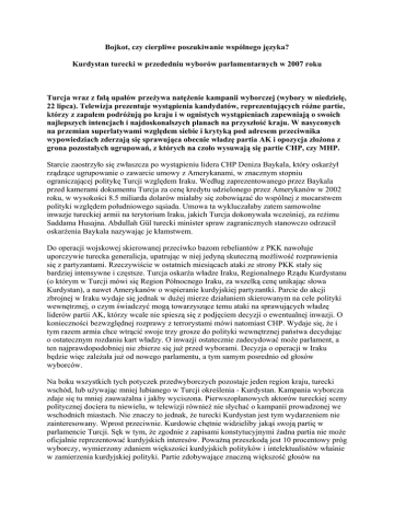 Bojkot, czy cierpliwe poszukiwanie wspólnego języka? Kurdystan turecki w przededniu wyborów parlamentarnych w 2007 roku Turcja wraz z falą upałów przeżywa natężenie kampanii wyborczej (wybory w niedzielę, 22 lipca). Telewizja prezentuje wystąpienia kandydatów, reprezentujących różne partie, którzy z zapałem podróżują po kraju i w ognistych wystąpieniach zapewniają o swoich najlepszych intencjach i najdoskonalszych planach na przyszłość kraju. W nasyconych na przemian superlatywami względem siebie i krytyką pod adresem przeciwnika wypowiedziach zderzają się sprawująca obecnie władzę partia AK i opozycja złożona z grona pozostałych ugrupowań, z których na czoło wysuwają się partie CHP, czy MHP. Starcie zaostrzyło się zwłaszcza po wystąpieniu lidera CHP Deniza Baykala, który oskarżył rządzące ugrupowanie o zawarcie umowy z Amerykanami, w znacznym stopniu ograniczającej politykę Turcji względem Iraku. Według zaprezentowanego przez Baykala przed kamerami dokumentu Turcja za cenę kredytu udzielonego przez Amerykanów w 2002 roku, w wysokości 8.5 miliarda dolarów miałaby się zobowiązać do wspólnej z mocarstwem polityki względem południowego sąsiada. Umowa ta wykluczałaby zatem samowolne inwazje tureckiej armii na terytorium Iraku, jakich Turcja dokonywała wcześniej, za reżimu Saddama Husajna. Abdullah Gül turecki minister spraw zagranicznych stanowczo odrzucił oskarżenia Baykala nazywając je kłamstwem. Do operacji wojskowej skierowanej przeciwko bazom rebeliantów z PKK nawołuje uporczywie turecka generalicja, upatrując w niej jedyną skuteczną możliwość rozprawienia się z partyzantami. Rzeczywiście w ostatnich miesiącach ataki ze strony PKK stały się bardziej intensywne i częstsze. Turcja oskarża władze Iraku, Regionalnego Rządu Kurdystanu (o którym w Turcji mówi się Region Północnego Iraku, za wszelką cenę unikając słowa Kurdystan), a nawet Amerykanów o wspieranie kurdyjskiej partyzantki. Parcie do akcji zbrojnej w Iraku wydaje się jednak w dużej mierze działaniem skierowanym na cele polityki wewnętrznej, o czym świadczyć mogą towarzyszące temu ataki na sprawujących władzę liderów partii AK, którzy wcale nie spieszą się z podjęciem decyzji o ewentualnej inwazji. O konieczności bezwzględnej rozprawy z terrorystami mówi natomiast CHP. Wydaje się, że i tym razem armia chce wtrącić swoje trzy grosze do polityki wewnętrznej państwa decydując o ostatecznym rozdaniu kart władzy. O inwazji ostatecznie zadecydować może parlament, a ten najprawdopodobniej nie zbierze się już przed wyborami. Decyzja o operacji w Iraku będzie więc zależała już od nowego parlamentu, a tym samym posrednio od głosów wyborców. Na boku wszystkich tych potyczek przedwyborczych pozostaje jeden region kraju, turecki wschód, lub używając mniej lubianego w Turcji określenia - Kurdystan. Kampania wyborcza zdaje się tu mniej zauważalna i jakby wyciszona. Pierwszoplanowych aktorów tureckiej sceny politycznej dociera tu niewielu, w telewizji również nie słychać o kampanii prowadzonej we wschodnich miastach. Nie znaczy to jednak, że turecki Kurdystan jest tym wydarzeniem nie zainteresowany. Wprost przeciwnie. Kurdowie chętnie widzieliby jakąś swoją partię w parlamencie Turcji. Sęk w tym, że zgodnie z zapisami konstytucyjnymi żadna partia nie może oficjalnie reprezentować kurdyjskich interesów. Poważną przeszkodą jest 10 procentowy próg wyborczy, wymierzony zdaniem większości kurdyjskich polityków i intelektualistów właśnie w zamierzenia kurdyjskiej polityki. Partie zdobywające znaczną większość głosów na wschodzie Turcji (HADEP, dziś pod nazwą DTP) nie mają szans wejść do parlamentu, gdyż w bilansie ogólnokrajowym nie pokonują 10 procentowej bariery. Odpowiedzią na tą, zdaniem Kurdów niesprawiedliwość, jest wystawienie w wyborach kandydatów niezależnych, których 10 procentowy próg wyborczy nie dotyczy. Zdaniem Naci Kutlaya, Kurda, niezależnego kandydata do tureckiego parlamentu z rejonu Ağrı, do parlamentu ma szansę dostać się w ten sposób około 30-40 kurdyjskich posłów. - Trudno oczywiście liczyć by taka ilość głosów mogła wywrzeć jakiś znaczący wpływ na turecką politykę względem wschodnich prowincji – mówi – niemniej będzie to zawsze szansa na podnoszenie sprzeciwu wobec antykurdyjskich projektów, nawiązywanie dialogu i ożywianie niechcianego tematu pt. problem kurdyjski w Turcji. Zdaniem Kutlaya, z wykształcenia lekarza, autora kilku książek poświęconych kurdyjskiej tożsamości i historii, kurdyjski problem może zostać rozwiązany na drodze postępującego w całym kraju procesu demokratyzacji: - Kurdowie są Turcji potrzebni, bo otwierają jej drogę do rozumienia prawdziwego znaczenia demokracji i praw człowieka. Dlatego też większość Kurdów popiera starania Turcji o członkostwo w Unii Europejskiej. Jednakże demokratyzacja oznaczać może w Turcji bardzo wiele rzeczy, nie zawsze tożsamych z pojęciem demokracji w Europie, dlatego słychać też głosy bardzo sceptyczne wobec udziału Kurdów w wyborach do parlamentu. Ismail Beşikçi – turecki socjolog, od lat z poświęceniem zajmujący się problemami Kurdów twierdzi, że turecki parlament nie jest miejscem, w którym Kurdowie mogliby coś uzyskać, znacznie łatwiej mogą tam zostać kolejny raz oszukani. Na łamach czasopisma Roja Kurd, Beşikçi apeluje o zwiększony i aktywny udział w polityce regionalnej, dbanie o rozwój kurdyjskich organizacji na terenie Kurdystanu, wprowadzenie kurdyjskiego, jako języka powszechnych kontaktów, również w urzędach i miejscach publicznych. Podobnego zdania jest kurdyjski intelektualista z Vanu, Ibrahim Gültepe. Sam zamierza całkowicie zbojkotować wybory, nie oddając głosu na rzecz żadnego kandydata. Jego zdaniem rozwiązanie problemu kurdyjskiego tkwi w nowych uregulowaniach prawnych, z