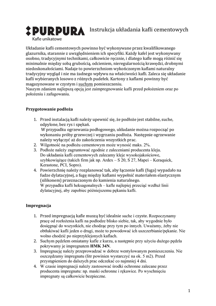 Instrukcja układania kafli cementowych Układanie kafli cementowych powinno być wykonywane przez kwalifikowanego glazurnika, starannie z uwzględnieniem ich specyfiki. Każdy kafel jest wykonywany osobno, tradycyjnymi technikami, całkowicie ręcznie, i dlatego kafle mogą różnić się minimalnie między sobą grubością, odcieniem, nieregularnością krawędzi, drobnymi niedoskonałościami. Nadaje to powierzchniom wykończonym kaflami naturalny tradycyjny wygląd i nie ma żadnego wpływu na właściwości kafli. Zaleca się układanie kafli wybieranych losowo z różnych pudełek. Kartony z kaflami powinny być magazynowane w czystym i suchym pomieszczeniu. Naszym zdaniem najlepszą opcją jest zaimpregnowanie kafli przed położeniem oraz po położeniu i zafugowaniu. Przygotowanie podłoża 1. Przed instalacją kafli należy upewnić się, że podłoże jest stabilne, suche, odpylone, bez rys i spękań. W przypadku ogrzewania podłogowego, układanie można rozpocząć po wykonaniu próby grzewczej i wygrzaniu podłoża. Następnie ogrzewanie należy wyłączyć aż do zakończenia wszystkich prac. 2. Wilgotność na podłożu cementowym może wynosić maks. 2%. 3. Podłoże należy zagruntować zgodnie z zaleceniami producenta kleju. Do układania kafli cementowych zalecamy kleje wysokojakościowe, szybkowiążące (takich firm jak np. Ardex – S 20, S 27, Mapei – Keraquick, Kerastone, PCI, Sopro). 4. Powierzchnię należy rozplanować tak, aby łączenie kafli (fuga) wypadało na fudze dylatacyjnej, a fugę między kaflami wypełnić materiałem elastycznym (silikonem) przeznaczonym do kamienia naturalnego. W przypadku kafli heksagonalnych – kafle najlepiej przeciąć wzdłuż linii dylatacyjnej, aby zapobiec późniejszemu pękaniu kafli. Impregnacja 1. Przed impregnacją kafle muszą być idealnie suche i czyste. Rozpoczynamy pracę od rozłożenia kafli na podłodze blisko siebie, tak, aby wygodnie było dosięgnąć do wszystkich, nie chodząc przy tym po innych. Uważamy, żeby nie obtłukiwać kafli jeden o drugi, może to powodować ich uszczerbianie/pękanie. Nie wolno chodzić po nieprzyklejonych kaflach. 2. Suchym pędzlem omiatamy kafle z kurzu, a następnie przy użyciu dużego pędzla pokrywamy je impregnatem HMK 34N. 3. Impregnację należy przeprowadzać w dobrze wentylowanym pomieszczeniu. Nie oszczędzamy impregnatu (litr powinien wystarczyć na ok. 5 m2). Przed przystąpieniem do dalszych prac odczekać co najmniej 4 dni. 4. W czasie impregnacji należy zastosować środki ochronne zalecane przez producenta impregnatu: np. maski ochronne i rękawice. Po wyschnięciu impregnaty są całkowicie bezpieczne. 1 Układanie 1. Dobrze jest rozpocząć od ułożenia kafli na sucho, podobnie jak w przypadku układania kamienia. W przypadku jednakowego wzoru i koloru kafli, należy je wybierać z różnych pudełek. 2. Kafle należy układać blisko siebie, zachowując minimalne, 1-‐2 mm odstępy. 3. Kafle należy docinać na sucho piłą z diamentową tarczą. 4. Należy stosować kleje do kamienia opisane wcześniej. 5. Klej należy nanieść metodą kombinowaną (Buttering-Floating) grzebieniem 10 mm na podłoże, a tylną stronę kafla przesmarować „na zero” warstwą kontaktową. 6. Kafle należy umieścić dokładnie w odpowiednim miejscu i dociskać dłonią lekko przesuwając w celu rozprowadzenia kleju pod płytką . Nie należy używać gumowego młotka, ponieważ może to spowodować powstanie mikrorys. 7. Nawet najmniejsze zabrudzenia klejem należy niezwłocznie usunąć czystą, wilgotną gąbką. 8. Ostre, nieregularne krawędzie kafla należy KONIECZNIE wyrównać papierem ściernym. Fugowanie 1. Najbezpieczniejsza jest fuga wykonanej z dwóch części cementu pucolanowego lub trasowego (CEM IV/B 32,5) i jednej części piasku kwarcowego z dodatkiem wody. Zaprawa powinna mieć konsystencję jogurtu i powinna być nanoszona na pozamiataną czystą posadzkę. Cement dołączamy do kafli, drobnoziarnisty piasek kwarcowy można kupić w składach budowlanych lub sklepach zoologicznych (podłoże do akwarium). 2. Kafle przed fugowaniem należy zmoczyć gąbką. Następnie fugować po 6-‐8 kafli i na bieżąco myć czystą wodą. Należy przygotować 2 wiadra z wodą do mycia fugi – najpierw zmywać wodą z jednego wiadra, następnie na czysto z drugiego. W razie potrzeby wodę wymieniać. 3. Fugę dobrze jest zmoczyć kilka razy pędzelkiem w ciągu pierwszego dnia, nie dopuszczając do zbyt szybkiego wysuszenia. 4. Ew. zanieczyszczenia należy usunąć gąbką typu Scotch -‐Britte. 5. W przypadku stosowania fug gotowych, należy wybierać fugi cementowe do kamienia naturalnego. Fuga nie może być jednak innego koloru niż szary i KONIECZNIE należy przeprowadzić próbę na zapasowym kaflu, zmyć wodą, poczekać aż kafel wyschnie i jeśli nie będzie śladu, można fugować. 6. Ew. zabrudzenia usunąć preparatem PS87 lub R55 – dostępny na zamówienie - lub delikatnie zetrzeć papierem ściernym na mokro (grubość 150 lub 180). Dodatkowa impregnacja Po kilku dniach, gdy kafle i fugi będą całkowicie suche należy ponownie zaimpregnować całą posadzkę (kafle i fugi). 2 Woskowanie kafli Po całkowitym wyschnięciu impregnatu w suchym pomieszczeniu stosujemy wosk Fila Satin. Wosk nanosimy na czyste kafle w dwóch prostopadłych do siebie cienkich warstwach, zachowując między położeniem jednej i drugiej godzinę odstępu. Następnie po całkowitym wyschnięciu ok godziny posadzkę froterujemy lub lepiej polerujemy delikatną filcową polerką (pad 800). Uwaga: wosku nie stosujemy w „mokrych” pomieszczeniach (np. łazienkach). Zabezpieczanie kafli po wykonaniu Jeśli w pomieszczeniu, w którym zainstalowane są kafle w dalszym ciągu prowadzone są prace budowlane, należy bardzo starannie zabezpieczyć kafle czystymi kartonami, a jeszcze lepiej płytami. Jeśli w pomieszczeniu panuje wilgoć, należy upewnić się, że kart