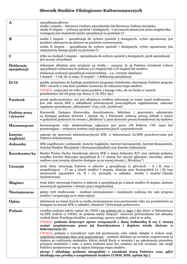 Słownik Studiów Filologiczno-Kulturoznawczych A specjalizacja główna: studia I stopnia – literatura i kultura amerykańska lub literatura i kultura brytyjska; studia II stopnia – wybrana spośród 7 dostępnych, w jej ramach pisana jest praca magisterska; wymagana jest znajomość języka specjalizacji na poziomie C1 B studia I stopnia – specjalizacja do wyboru spośród 3 dostępnych, wybór ograniczony jest językiem zdawanym na maturze na poziomie rozszerzonym; studia II stopnia – specjalizacja do wyboru spośród 7 dostępnych, wybór ograniczony jest znajomością danego języka na poziomie C1 C tylko na studiach I stopnia – specjalizacja do wyboru spośród 3 dostępnych, język specjalizacji jest uczony od podstaw Deklaracja dokument składany przy przyjęciu na studia – oznacza, że są Państwo świadomi wyboru specjalizacji realizowanych podczas 4 (I stopień) lub 2 (II stopień) lat studiów; deklaracja realizacji specjalizacji nauczycielskiej – j.w., terminy składania: I stopień – I rok, do 15 maja; II stopień – z deklaracją specjalizacji specjalizacji ECTS punkty przypisane do każdego przedmiotu programu kształcenia; obowiązuje Państwa program SFK i zawarta w nim ilość punktów konieczna do zaliczenia etapu studiów; UWAGA: ważna jest nie tylko suma punktów z danego roku, ale też liczba w ramach przedmiotów lub ich grup (np. Kursy A i B, PNJ, itp.) Facebook portal społecznościowy, nie jest oficjalnym źródłem informacji na temat zasad studiowania – jest nim strona SFK z zakładkami poświęconymi poszczególnym zagadnieniom; zalecamy regularne sprawdzanie „Aktualności” wraz z ich „Archiwum” Godziny pracy Kierownik, Zastępca Kierownika, Koordynatorzy, Sekretarz i pracownicy sekretariatu są dostępni podczas dyżurów i chętnie się z Państwem zobaczą, proszą jednak o wizyty w godzinach podanych na stronie („Struktura”); poza dyżurami proszę kontaktować się mailowo i dyżurów Harmonogram harmonogram roku akademickiego ogłaszany jest przez JM Rektora UW; musi być przestrzegany – zwłaszcza terminy sesji egzaminacyjnych i poprawkowych Instytut zajmuje się sprawami administracyjnymi SFK; w Sekretariacie IA/SFK przechowywana jest Państwa dokumentacja Anglistyki Jednostka SFK współtworzy 5 jednostek: Instytut Anglistyki, Instytut Germanistyki, Instytut Romanistyki, Instytut Studiów Iberyjskich i Iberoamerykańskich oraz Katedra Italianistyki Koordynator/ka Bardzo Ważna Osoba: koordynuje sprawy SFK w danej Jednostce B/C oraz opiniuje podania; wszelkie kwestie dotyczące specjalizacji B i C muszą być mu/jej zgłaszane; nazwiska, adresy mailowe oraz terminy dyżurów dostępne są na naszej stronie („ Struktura”) Licencjat tytuł, który otrzymują Państwo w zakresie 3 specjalizacji (2 głównych – A i B, oraz 1 uzupełniającej – C) po 4 latach studiów I stopnia, złożeniu prac licencjackich (A i B) oraz stosownych egzaminów (A, B i C); szczegóły w zakładce „Studia I stopnia”/Zasady dyplomowania Magister tytuł, który otrzymują Państwo w zakresie 2 specjalizacji po 2 latach studiów II stopnia, złożeniu stosownych egzaminów i obronie pracy magisterskiej Niestacjonarne płatny tryb studiowania – studenci niestacjonarni i stacjonarni realizują ten sam program studiów i uczęszczają na te same zajęcia Opłaty informacje na temat stawek za studia niestacjonarne oraz powtarzanie roku czy przedmiotów są dostępne na stronie SFK w zakładce „Studenci”/Informacje podstawowe Podanie wszelkie podania należy wpisać do USOS i nie później niż w ciągu 7 dni złożyć w Sekretariacie IA/SFK wydruk (z USOS); do podania należy dołączyć stosowne potwierdzenia lub aktualny wydruk Karty Przebiegu Studiów, a omawiając sprawy osobiście, mieć je ze sobą; UWAGA: podania dotyczące spraw związanych z daną Jednostką B czy C muszą zostać zaopiniowane przez jej Koordynatora i dopiero wtedy złożone w Sekretariacie IA; UWAGA: podania o warunkowy wpis lub powtarzanie roku należy składać w trakcie sesji, najpóźniej ostatniego dnia sesji poprawkowej – podania składane po terminie rozpatrywane są dopiero po rozliczeniu studentów, którzy złożyli Karty w terminie i po zakończeniu procedury przyjęcia studentów I roku, a status studenta musi być ustalony na tyle wcześnie, aby mogli Państwo zarejestrować się na zajęcia kolejnego etapu studiów; pisząc i składając podania niezgodnie z zasadami tracą Państwo czas, gdyż skutkują one prośbą o uzupełnienie braków (USOS, KPS, opinia itp.) Rejestracja rejestracja na zajęcia odbywa się przed rozpoczęciem semestru, jej harmonogram jest podawany na stronach IA oraz SFK: 1. Kursy i przedmioty anglistyczne: rejestrujecie się Państwo przez USOS w terminach podanych dla studentów anglistyki. 2. PNJB I stopień: PNJF – IR/USOS, po otrzymaniu uprawnień od IR; PNJN – IG/USOS, po otrzymaniu uprawnień od IG; PNJH – odgórnie przez ISIiI; w razie problemów z dostępem do rejestracji w IR lub IG, należy skontaktować się z Koorynatorem 3. Kursy specjalizacyjne i seminaria, PNJ II stopień: zgłaszacie się Państwo do docelowych Jednostek. IA nie ma uprawnień do rejestracji Państwa na te przedmioty. 4. Pozostałe przedmioty: zgłaszają Państwo listę wybranych przedmiotów jednej osobie z roku, np. staroście (wzór tabelki: „Studia I stopnia”/Ważne informacje); listy zbiorcze – po jednej dla każdego roku studiów – należy dostarczyć p. Lidii Matuszewskiej do Sekretariatu najpóźniej ostatniego dnia II tury rejestracji w IA; tabelki indywidualne nie będą przyjmowane. 5. II stopień – Filozofia kultury: są Państwo rejestrowani przez Sekretariat SFK. UWAGA: proszeni są Państwo o upewnienie się, że zostali właściwie zarejestrowani: na semestr zimowy – do połowy października, na semestr letni – do początku marca; wszelkie niezgodności prosimy zgłaszać Koordynatorom lub do Se