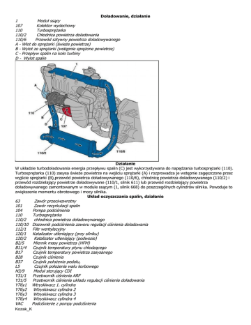 Doładowanie, działanie 1 Moduł ssący 107 Kolektor wydechowy 110 Turbosprężarka 110/2 Chłodnica powietrza doładowania 110/6 Przewód sztywny powietrza doładowywanego A - Wlot do sprężarki (świeże powietrze) B - Wylot ze sprężarki (wstępnie sprężone powietrze) C - Przepływ spalin na koło turbiny D - Wylot spalin Działanie W układzie turbodoładowania energia przepływu spalin (C) jest wykorzystywana do napędzania turbosprężarki (110). Turbosprężarka (110) zasysa świeże powietrze na wejściu sprężarki (A) i rozprowadza je wstępnie zagęszczone przez wyjście sprężarki (B),przewód powietrza doładowywanego (110/6), chłodnicę powietrza doładowywanego (110/2) i przewód rozdzielający powietrze doładowywane (110/1, silnik 611) lub przewód rozdzielający powietrza doładowywanego zamontowanym w module ssącym (1, silnik 668) do poszczególnych cylindrów silnika. Powoduje to zwiększenie momentu obrotowego i mocy silnika. Układ oczyszczania spalin, działanie 63 Zawór przeciwzwrotny 101 Zawór recyrkulacji spalin 104 Pompa podciśnienia 110 Turbosprężarka 110/2 chłodnica powietrza doładowywanego 110/10 Dozownik podciśnienia zaworu regulacji ciśnienia doładowania 112/1 Filtr wentylacyjny 120/1 Katalizator utleniający (przy silniku) 120/2 Katalizator utleniający (podwozie) B2/5 Miernik masy powietrza (HFM) B11/4 Czujnik temperatury płynu chłodzącego B17 Czujnik temperatury powietrza zasysanego B28 Czujnik ciśnienia B37 Czujnik położenia pedału, L5 Czujnik położenia wału korbowego N3/9 Moduł sterujący CDI Y31/1 Przetwornik ciśnienia ARF Y31/5 Przetwornik ciśnienia układu regulacji ciśnienia doładowania Y76y1 Wtryskiwacz 1. cylindra Y76y2 Wtryskiwacz cylindra 2 Y76y3 Wtryskiwacz cylindra 3 Y76y4 Wtryskiwacz cylindra 4 VAC Podciśnienie z pompy podciśnienia Kozak_K OUT ATM Wyjście przetwornika ciśnienia Otwory wentylacyjne do komory podzespołów Układ oczyszczania spalin jest podzielony na następujące układy: Układ recyrkulacji spalin Regulacja ciśnienia doładowania Układ zamykania kanałów ssących Katalizator oksydacyjny Zadaniem układu oczyszczania spalin jest redukcja szkodliwych związków w spalinach: Tlenków azotu (NOx) Węglowodorów (HC) Tlenku węgla (CO) Cząstek stałych (PM) Turbosprężarka 110/10 Dozownik podciśnienia zaworu regulacji ciśnienia doładowania a Klapa obejścia c Obudowa sprężarki d Koło łopatkowe turbosprężarki f Obudowa turbiny g Koło turbiny h Obudowa pośrednia n Oś turbiny A Wlot do sprężarki (świeże powietrze) B Wylot ze sprężarki (wstępnie sprężone powietrze) C Przepływ spalin na koło turbiny D Wylot spalin E Kanał obejściowy H Wejście oleju J Wyjście oleju Kozak_K Działanie Spaliny silnika są prowadzone przez kolektor wydechowy do obudowy turbiny (f) na koło turbiny (g). Energia strumienia spalin (C) wprawia koło turbiny w ruch. Dzięki temu koło sprężarki (d), które jest połączone z kołem turbiny osią turbiny (n), obraca się z taką samą prędkością. Maksymalna prędkość obrotowa może wynosić nawet 180 000/min. Świeże powietrze (A) zasysane przez koło sprężarki jest wstępnie sprężane (B) i doprowadzane do silnika. Ciśnienie doładowania jest regulowane poprzez otwieranie i zamykanie zaworu obejściowego (E). Gdy zawór jest otwarty, powietrze nie jest wstępnie sprężane, silnik pracuje jako silnik wolnossący. Jeśli zawór jest zamknięty, spaliny są doprowadzane na koło turbiny (g). Klapa obejścia (a) jest zasterowywana przez dozownik podciśnienia zaworu regulacji ciśnienia doładowania (110/10). Układ recyrkulacji spalin, działanie 1 Moduł ssący 101 Zawór recyrkulacji spalin 107 Kolektor wydechowy 110/6 Przewód sztywny powietrza doładowywanego B2/5 Miernik masy powietrza (HFM) Kozak_K B28 Y31/1 VAC OUT ATM Czujnik ciśnienia Przetwornik ciśnienia ARF Podciśnienie z pompy podciśnienia Wyjście przetwornika ciśnienia Otwory wentylacyjne do komory podzespołów System recyrkulacji spalin (EGR – od ang. Exhaust Gas Recirculation) – jeden z kilku stosowanych systemów zmniejszenia zanieczyszczeń w spalinach stosowany w nowoczesnych pojazdach z silnikami spalinowymi tłokowymi. Zasada działania układu polega na wprowadzaniu do układu zasilania silnika pewnej ilości spalin. Zastosowanie takiego rozwiązania powoduje: · przyspieszenie odparowania paliwa (poprzez jego podgrzanie) · obniżenie temperatury spalania ubogiej w tlen mieszanki paliwowo-powietrznej · utlenienie pozostałych w spalinach niespalonych węglowodorów (HC) Skutkiem działania układu jest obniżenie emisji tlenków azotu (NOx) – spowodowane obniżeniem temperatury spalania ubogiej w tlen mieszanki oraz obniżenie emisji HC poprzez ich utlenienie. Do optymalnej pracy systemu niezbędne jest odpowiednie dawkowanie ilości spalin dostarczanych do komory spalania, które jest zależne od aktualnego obciążenia silnika (możliwości zubożenia mieszanki). W silnikach o zapłonie samoczynnym dostarcza się do 50%, spalin w wyniku czego temperatura jest ograniczana do 400–450 °C. W celu osiągnięcia zadanych parametrów system współpracuje z układem wtryskowym oraz zapłonowym, a także wykorzystuje odczyty z sond tlenu oraz czujników temperatury. Awarie układów recyrkulacji spalin Do najczęstszych awarii układu należy zablokowanie zaworu, co może być spowodowane nagromadzeniem się nagarów lub nieszczelnością przewodów doprowadzających podciśnienie lub spaliny. Awarie te mogą skutkować uszkodzeniem sondy lambda, zakłóceniami w pracy jednostki napędowej lub dymieniem z układu wydechowego. W systemach OBD układ recyrkulacji spalin należy do klasy B zagrożeń emisyjnych (średnie ryzyko emisyjne). Mogą wystąpić usterki, np. większe obroty na sprzęgle lub tzw. szarpanie podczas jazdy. Działanie Recyrkulacja spalin następuje w zależności od wprowadzonych do pamięci modułu sterującego CDI (N3/9) wart