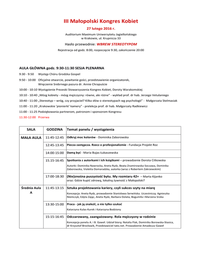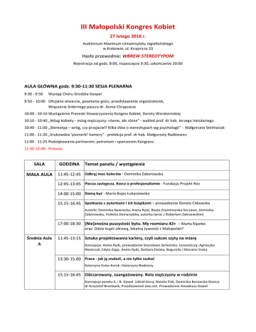 III Małopolski Kongres Kobiet 27 lutego 2016 r. Auditorium Maximum Uniwersytetu Jagiellońskiego w Krakowie, ul. Krupnicza 33 Hasło przewodnie: WBREW STEREOTYPOM Rejestracja od godz. 8:00, rozpoczęcie 9:30, zakończenie 20:00 AULA GŁÓWNA godz. 9:30-11:30 SESJA PLENARNA 9:30 - 9:50 Występ Chóru Grodzka Gospel 9:50 - 10:00 Oficjalne otwarcie, powitanie gości, przedstawienie organizatorek, Wręczenie Srebrnego pazura dr. Annie Chrapuście 10:00 - 10:10 Wystąpienie Prezeski Stowarzyszenia Kongres Kobiet, Doroty Warakomskiej 10:10 - 10:40 „Mózg kobiety - mózg mężczyzny: równe, ale różne” - wykład prof. dr hab. Jerzego Vetulaniego 10:40 - 11:00 „Stereotyp – wróg, czy przyjaciel? Kilka słów o stereotypach wg psychologii” - Małgorzata Stelmasiak 11:00 - 11:20 „Krakowskie 'pionierki' kamery” - prelekcja prof. dr hab. Małgorzaty Radkiewicz 11:00 - 11:25 Podziękowania partnerom, patronom i sponsorom Kongresu 11:30-12:00 Przerwa SALA MAŁA AULA GODZINA Temat panelu / wystąpienia 11:45-12:45 Odkryj moc kolorów - Dominika Zaborowska 12:45-13:45 Piecza zastępcza. Rzecz o profesjonalizmie - Fundacja Projekt Roz 14:00-15:00 Damą być - Maria Bujas Łukaszewska 15.15-16:45 Spotkania z autorkami i ich książkami – prowadzenie Dorota Citkowska Autorki: Dominika Nawrocka, Aneta Rydz, Beata Znamirowska-Soczawa, Dominika Zaborowska, Violetta Domaradzka, autorka (wraz z Robertem Zakrzewskim) 17:00-18:30 (Nie)znośna puszystość bytu. My rozmiaru 42+ – Marta Kijanko oraz: Gdzie kupić zdrową, lokalną żywność z Małopolski? Średnia Aula A 11:45-13:15 Sztuka projektowania kariery, czyli sukces szyty na miarę Koncepcja: Aneta Rydz, prowadzenie Stanisława Serwińska. Uczestniczą: Agnieszka Niemczyk, Edyta Zając, Aneta Rydz, Barbara Dolata, Bogumiła i Marzena Sroka 13:30-15:00 Praca - jak ją znaleźć, a nie tylko szukać Katarzyna Kulas-Kurek i Katarzyna Bodziony 15:15-16:45 Odczarowany, zaangażowany. Rola mężczyzny w rodzinie Koncepcja panelu A. i B. Gaweł. Udział biorą: Natalia Flak, Dominika Borowska-Stasica, dr Krzysztof Brocławik, Przedstawiciel tato.net. Prowadzenie Amadeusz Gaweł 17-18:30 Czy ciąża odmóżdża? Z jakimi stereotypami zmagają się matki Joanna Pawlik, Małgorzata Markiewicz, Lidia Krawczyk, dr hab. Magdalena Heydel, dr Mira Marcinów, Anna Kowalcze-Pawlik. Prowadzi Marta Żłobińska, Fundacja Obywatel Mama Średnia Aula B 11:45-13:15 Po prostu zdrowie W panelu wezmą udział lekarze: dr Zbigniew Darasz, Prof. n.med. Paweł Blecharz, Dominika Dudek, psychiatra, Anna Załubska – dietetyczka; prowadzenie Sylwia Salwińska, autorka koncepcji panelu. 13:30-15:00 Skrywane problemy kobiet. Trudne rozmowy o uzależnieniach Udział biorą: dr n. med. Marcin Migaczewski, Wacław Stengl, Maria Migdał, Urszula Oleksak, Izabela Grzyb, Ewa Grałek. Koncepcja panelu - Katarzyna Zielińska 15:15-16:45 „Ruch głupich kobiet” czyli jak się mówi o feminizmie Udział biorą: dr Anna Pekaniec, dr Samuel Nowak, dr Mateusz Skucha. Moderatorki i autorki panelu: Adrianna Chorąży, Katarzyna Horabik 17:00-18:00 Telemedyczna droga do pełni kobiecości Wykład fundacji Force Feminite Duża Aula A 12:00-13:30 Kobiety – silna płeć Udział biorą Małgorzata Stelmasiak, Maciej Rauer, Daria Skowyra-Rauer, Michał Adamowicz. Panel koncepcji Anny Łyżwy poprowadzi Agnieszka Brodowska 13:45-15:15 Jaka jesteś. O wyrażaniu siebie głosem, gestem, strojem Udział biorą: Agata Bargiel, dr Małgorzata Majewska, Monika Jurczyk, Aneta Pondo 15:30-17:00 Kopciuszek – to przeżytek, czyli jak być bogatą Udział biorą: Dominika Nawrocka, Barbara Pawłowska-Dziadowiec, Aleksandra Budzyńska, Katarzyna Żółty – Martens. Prowadzenie Iwona Sitnik-Kornecka, koncepcja panelu Małgorzata Bednarczyk. 17:15-18:15 Historie niby niepotrzebne - performance HERstory Projekt: Olga Brewka, Sylwia Dyba, Maria Kowalczyk, scenariusze przygotowała Natalia Ossowska. Występują: Beata Śliwińska, Zuzanna Czerniejewska i Anna Tylek 18:20– 18:30 Avatar Centrala Ruchu – zaproszenie do projektu 50+Sport Duża Aula B 12:00-13:30 Baba rządzi na wsi! Koncepcja panelu - Renata Wiss, Barbara Kawa, prowadzenie – Barbara Kawa. Uczestniczą: Aneta Caba, Krystyna Janecka, Maria Łakoma, Małgorzata Małuch, Halina Olejniczak. Gośc specjalny Wicemarszałek Woj. Małopolskiego Wojciech Kozak 13:45-15:15 Kobieta, istota seksualna Panel poprowadzą: dr Zbigniew Liber i Beata Znamirowska-Soczawa. Koncepcja panelu: Beata Znamirowska-Soczawa, Małgorzata Kubik. 15:15-18:45 Przerwa techniczna 19:00 – 20:00 Koncert i zamknięcie Kongresu Pokoik porad 11:30-12:20 Piecza zastępcza - porady - Fundacja Projekt Roz (pomieszczenie przy schodach do biura na lewo od gł. wejścia 12:20-13:20 Ewa Grałek - psycholog, psychoanalityk - porady 13:30 - 14:30 Maciej Rauer Porady trenera personalnego - pomiar wagi, masy mięśniowej, tkanki tłuszczowej, wody oraz określenie wieku metabolicznego wraz z omówieniem wyników 14:30-15:30 Anna Załubska Porady dietetyczki 15:30- 16:30 Dr Marcin Migaczewski Porady specjalisty od nowotworu piersi 16:30-17:30 Izabela Grzyb Porady psychologa 17:30-18:30 Bożena Mąsior – jak przygotować dziecko do przedszkola Foyer parter 9:00- 19:00 Doradca książki Dorota Citkowska Foyer parter 15:15-17:15 Porady stylistyczne - Osa – Osobista Stylistka I p. 11:30-14:00 500+ punkt informacyjny stoisko I p. 11:30-18:45 Stanowisko porady kredytowe Sala seminaryjna 15:30 – 16:30 Porady CV – przynieś - doradzimy, poprawimy Fundacja Infolet-Młodzi w IT