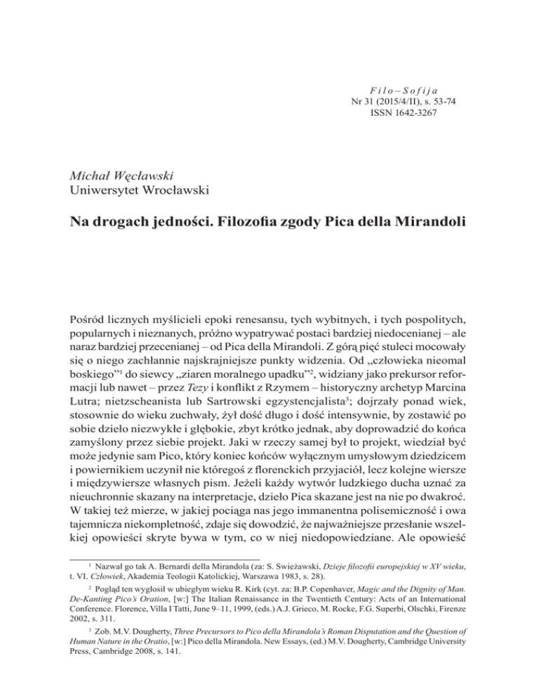Filo– Sofija Nr 31 (2015/4/II), s. 53-74 ISSN 1642-3267 Michał Węcławski Uniwersytet Wrocławski Na drogach jedności. Filozofia zgody Pica della Mirandoli Pośród licznych myślicieli epoki renesansu, tych wybitnych, i tych pospolitych, popularnych i nieznanych, próżno wypatrywać postaci bardziej niedocenianej – ale naraz bardziej przecenianej – od Pica della Mirandoli. Z górą pięć stuleci mocowały się o niego zachłannie najskrajniejsze punkty widzenia. Od „człowieka nieomal boskiego”1 do siewcy „ziaren moralnego upadku”2, widziany jako prekursor reformacji lub nawet – przez Tezy i konflikt z Rzymem – historyczny archetyp Marcina Lutra; nietzscheanista lub Sartrowski egzystencjalista3; dojrzały ponad wiek, stosownie do wieku zuchwały, żył dość długo i dość intensywnie, by zostawić po sobie dzieło niezwykłe i głębokie, zbyt krótko jednak, aby doprowadzić do końca zamyślony przez siebie projekt. Jaki w rzeczy samej był to projekt, wiedział być może jedynie sam Pico, który koniec końców wyłącznym umysłowym dziedzicem i powiernikiem uczynił nie któregoś z florenckich przyjaciół, lecz kolejne wiersze i międzywiersze własnych pism. Jeżeli każdy wytwór ludzkiego ducha uznać za nieuchronnie skazany na interpretacje, dzieło Pica skazane jest na nie po dwakroć. W takiej też mierze, w jakiej pociąga nas jego immanentna polisemiczność i owa tajemnicza niekompletność, zdaje się dowodzić, że najważniejsze przesłanie wszelkiej opowieści skryte bywa w tym, co w niej niedopowiedziane. Ale opowieść 1 Nazwał go tak A. Bernardi della Mirandola (za: S. Swieżawski, Dzieje filozofii europejskiej w XV wieku, t. VI. Człowiek, Akademia Teologii Katolickiej, Warszawa 1983, s. 28). 2 Pogląd ten wygłosił w ubiegłym wieku R. Kirk (cyt. za: B.P. Copenhaver, Magic and the Dignity of Man. De-Kanting Pico’s Oration, [w:] The Italian Renaissance in the Twentieth Century: Acts of an International Conference. Florence, Villa I Tatti, June 9–11, 1999, (eds.) A.J. Grieco, M. Rocke, F.G. Superbi, Olschki, Firenze 2002, s. 311. Zob. M.V. Dougherty, Three Precursors to Pico della Mirandola’s Roman Disputation and the Question of Human Nature in the Oratio, [w:] Pico della Mirandola. New Essays, (ed.) M.V. Dougherty, Cambridge University Press, Cambridge 2008, s. 141. 3 54 Michał Węcławski Pica to z pewnością nie tylko to. Myśl jego, tak zgodliwa i otwarta w sobie samej, to myśl, w której rozmaite stanowiska i tradycje – chrześcijańskie, żydowskie i pogańskie, racjonalizm i mistycyzm – przeplatają się i pragną mówić jednym głosem. Pico niczym wytrawny kompozytor usiłuje je harmonizować i z kombinacji dźwięków wydobywać tylko konsonanse. Pomazany przez los jako princeps Concordiae jeszcze za życia postrzegany był jako zwiastun dobrych wieści, herold pax philosophicae. Florencki poeta Girolamo Benivieni pisał wprost, z charakterystyczną co prawda dla humanistów egzaltacją: „Gdy nadchodzi Pico, wszystkie niesnaski znikają i zaraz pod jego wpływem zjawia się concordia – zgoda”4. Ów naczelny rys zarówno osoby, jak i twórczości Pica wysuwa się na czoło i towarzyszy zawsze, choć raz bardziej, a raz mniej bezpośrednio, wszystkim jego tekstom: od Mowy, Tez i Apologii, przez Commento, aż po Heptaplus oraz De ente et uno5, a nawet tym zapowiadanym, lecz nigdy nieukończonym, jak Teologia poetycka, Traktat o miłości, Komentarz do „Biesiady”, czy Zgoda Platona z Arystotelesem. Pośród bezliku „elementów pogańskich, hebrajskich i chrześcijańskich – powie Frances Yates – Mirandola porusza się z taką pewnością siebie, jak gdyby był w posiadaniu jakiegoś uniwersalnego klucza”6. Jedność i cztery drogi W istocie, sam przyznaje w swojej Apologii, pisanej w odpowiedzi na zarzuty wobec dziewięciuset tez7, że wszystkie jego twierdzenia wiąże zawsze i porządkuje jakieś ukryte spoiwo, którego krytycy zdają się nie dostrzegać8. Spoiwo to jest, jak można domniemywać, czymś więcej niż tylko metodologiczną dyrektywą. U jego podłoża leży rzecz o wiele większej wagi: metafizyczna zasada organizacji wszystkiego, co jest. A są, powiada Pico w Heptaplusie „za starożytnymi”, trzy światy: nadniebiański, niebiański i podksiężycowy. Pierwszy jest królestwem światłości, światem intelektualnych form – duchów czystych, wieczny i niezmienny; nasz świat to królestwo ciemności i zniszczalnej materii, niebiosa są zaś mieszaniną jednego i drugiego. Najwyższy ze światów ma swój symbol w ogniu, przez wzgląd na chwałę swojej światłości oraz wyniesienie ponad resztę9; nasz obrazuje woda, 4 Cyt. za: A. Kuczyńska, Sztuka jako filozofia w kulturze renesansu włoskiego, PWN, Warszawa 1988, s. 253. 5 Nie są to wszystkie, z pewnością jednak najważniejsze z zachowanych dzieł Pica. 6 F. A. Yates, Sztuka pamięci, przeł. W. Radwański, PIW, Warszawa 1977, s. 157. Wypada sprecyzować, że tylko w trzynastu z nich dopatrzono się znamion poglądów groźnych i heretyckich. Wszystkie te inkryminowane tezy przytacza i omawia P. R. Blum, Pico, Theology and the Church, [w:] Pico della Mirandola. New Essays, ed. cit., s. 40-41 i n. 7 8 Zob. G. Kurylewicz, Poznawanie i niepoznawanie istnienia – Giovanni Pico della Mirandola w poszukiwaniu metafizycznej zgodności wszystkiego, co istnieje, Semper, Warszawa 2004, s. 83. Autorka oddaje ów zwrot przez „jakąś ukrytą współzależność”. 9 Na temat symboliki ognia por. Pseudo-Dionizy Aeropagita, Hierarchia niebiańska, XV, 2, [w:] idem, Pisma teologiczne II. Hierarchia niebiańska. Hierarchia kościelna, przeł. M. Dzielska, Znak, Kraków 1999, s. 104-106. Na drogach jedności. Filozofia zgody Pica della Mirandoli 55 wyrażająca zmienność i niestabilność; średni to ogień i woda. Trzeci poruszany jest przez drugi, drugi rządzony przez pierwszy10. Trzy te światy, wzbogacone o świat czwarty 