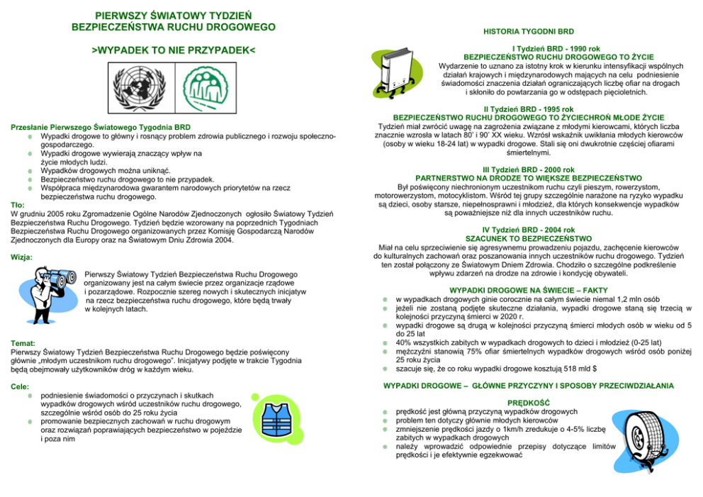 PIERWSZY ŚWIATOWY TYDZIEŃ BEZPIECZEŃSTWA RUCHU DROGOWEGO >WYPADEK TO NIE PRZYPADEK< Przesłanie Pierwszego Światowego Tygodnia BRD Wypadki drogowe to główny i rosnący problem zdrowia publicznego i rozwoju społecznogospodarczego. Wypadki drogowe wywierają znaczący wpływ na życie młodych ludzi. Wypadków drogowych można uniknąć. Bezpieczeństwo ruchu drogowego to nie przypadek. Współpraca międzynarodowa gwarantem narodowych priorytetów na rzecz bezpieczeństwa ruchu drogowego. Tło: W grudniu 2005 roku Zgromadzenie Ogólne Narodów Zjednoczonych ogłosiło Światowy Tydzień Bezpieczeństwa Ruchu Drogowego. Tydzień będzie wzorowany na poprzednich Tygodniach Bezpieczeństwa Ruchu Drogowego organizowanych przez Komisję Gospodarczą Narodów Zjednoczonych dla Europy oraz na Światowym Dniu Zdrowia 2004. Wizja: Pierwszy Światowy Tydzień Bezpieczeństwa Ruchu Drogowego organizowany jest na całym świecie przez organizacje rządowe i pozarządowe. Rozpocznie szereg nowych i skutecznych inicjatyw na rzecz bezpieczeństwa ruchu drogowego, które będą trwały w kolejnych latach. Temat: Pierwszy Światowy Tydzień Bezpieczeństwa Ruchu Drogowego będzie poświęcony głównie „młodym uczestnikom ruchu drogowego”. Inicjatywy podjęte w trakcie Tygodnia będą obejmowały użytkowników dróg w każdym wieku. HISTORIA TYGODNI BRD I Tydzień BRD - 1990 rok BEZPIECZEŃSTWO RUCHU DROGOWEGO TO ŻYCIE Wydarzenie to uznano za istotny krok w kierunku intensyfikacji wspólnych działań krajowych i międzynarodowych mających na celu podniesienie świadomości znaczenia działań ograniczających liczbę ofiar na drogach i skłoniło do powtarzania go w odstępach pięcioletnich. II Tydzień BRD - 1995 rok BEZPIECZEŃSTWO RUCHU DROGOWEGO TO ŻYCIECHROŃ MŁODE ŻYCIE Tydzień miał zwrócić uwagę na zagrożenia związane z młodymi kierowcami, których liczba znacznie wzrosła w latach 80’ i 90’ XX wieku. Wzrósł wskaźnik uwikłania młodych kierowców (osoby w wieku 18-24 lat) w wypadki drogowe. Stali się oni dwukrotnie częściej ofiarami śmiertelnymi. III Tydzień BRD - 2000 rok PARTNERSTWO NA DRODZE TO WIĘKSZE BEZPIECZEŃSTWO Był poświęcony niechronionym uczestnikom ruchu czyli pieszym, rowerzystom, motorowerzystom, motocyklistom. Wśród tej grupy szczególnie narażone na ryzyko wypadku są dzieci, osoby starsze, niepełnosprawni i młodzież, dla których konsekwencje wypadków są poważniejsze niż dla innych uczestników ruchu. IV Tydzień BRD - 2004 rok SZACUNEK TO BEZPIECZEŃSTWO Miał na celu sprzeciwienie się agresywnemu prowadzeniu pojazdu, zachęcenie kierowców do kulturalnych zachowań oraz poszanowania innych uczestników ruchu drogowego. Tydzień ten został połączony ze Światowym Dniem Zdrowia. Chodziło o szczególne podkreślenie wpływu zdarzeń na drodze na zdrowie i kondycję obywateli. WYPADKI DROGOWE NA ŚWIECIE – FAKTY w wypadkach drogowych ginie corocznie na całym świecie niemal 1,2 mln osób jeżeli nie zostaną podjęte skuteczne działania, wypadki drogowe staną się trzecią w kolejności przyczyną śmierci w 2020 r. wypadki drogowe są drugą w kolejności przyczyną śmierci młodych osób w wieku od 5 do 25 lat 40% wszystkich zabitych w wypadkach drogowych to dzieci i młodzież (0-25 lat) mężczyźni stanowią 75% ofiar śmiertelnych wypadków drogowych wśród osób poniżej 25 roku życia szacuje się, że co roku wypadki drogowe kosztują 518 mld $ WYPADKI DROGOWE – GŁÓWNE PRZYCZYNY I SPOSOBY PRZECIWDZIAŁANIA Cele: podniesienie świadomości o przyczynach i skutkach wypadków drogowych wśród uczestników ruchu drogowego, szczególnie wśród osób do 25 roku życia promowanie bezpiecznych zachowań w ruchu drogowym oraz rozwiązań poprawiających bezpieczeństwo w pojeździe i poza nim PRĘDKOŚĆ prędkość jest główną przyczyną wypadków drogowych problem ten dotyczy głównie młodych kierowców zmniejszenie prędkości jazdy o 1km/h zredukuje o 4-5% liczbę zabitych w wypadkach drogowych należy wprowadzić odpowiednie przepisy dotyczące limitów prędkości i je efektywnie egzekwować JAZDA POD WPŁYWEM ALKOHOLU kierowanie pojazdem po spożyciu alkoholu zwiększa prawdopodobieństwo spowodowania wypadku młodzi mężczyźni (18-24 lata) kierujący pojazdem po spożyciu alkoholu są pięć razy częściej sprawcami wypadków niż kierowcy powyżej 30 roku życia obniżenie dopuszczalnych limitów alkoholu we krwi dla młodych niedoświadczonych kierowców może zmniejszyć liczbę wypadków o 4% do 24% PASY BEZPIECZEŃSTWA młodzi kierowcy – mężczyźni zapinają pasy rzadziej niż inne osoby pasy ocaliły więcej osób niż jakiekolwiek inne zabezpieczenie w pojeździe stosowanie pasów zmniejsza ryzyko obrażeń o 40%-50%, a śmierci o 40%-60% w wypadkach drogowych należy wprowadzić i efektywnie egzekwować obowiązkowe zapinanie pasów FOTELIKI I PASY DLA DZIECI foteliki i pasy skutecznie chronią niemowlęta i dzieci przed obrażeniami powstających na skutek wypadków drogowych foteliki i pasy zmniejszają liczbę zabitych niemowląt w wypadkach drogowych o 71% i małych dzieci o 54% należy wprowadzić i efektywnie egzekwować przepisy nakazujące przewożenie dzieci w fotelikach i / lub w pasach KASKI młodzi mężczyźni poruszający się rowerem, motorowerem, motocyklem najrzadziej używają kasków bezpieczeństwa używanie kasku bezpieczeństwa najskuteczniej chroni głowę przed urazami kaski zmniejszają ryzyko i ciężkość obrażeń głowy o około 70% należy wprowadzić i efektownie egzekwować przepisy nakazujące używanie kasków bezpieczeństwa GŁÓWNE WYDARZENIA TYGODNIA NA POZIOMIE ŚWIATOWYM Światowe Zgromadzenie Młodzieży dla Bezpieczeństwa Ruchu Drogowego Odbędzie się w dniach 23-24 kwietnia 2007 r. Wezmą w nim udział młodzi ludzie z całego świata. Na zgromadzeniu zostaną omówione sposoby poprawy bezpieczeństwa ruchu drogowego, w których realizacj