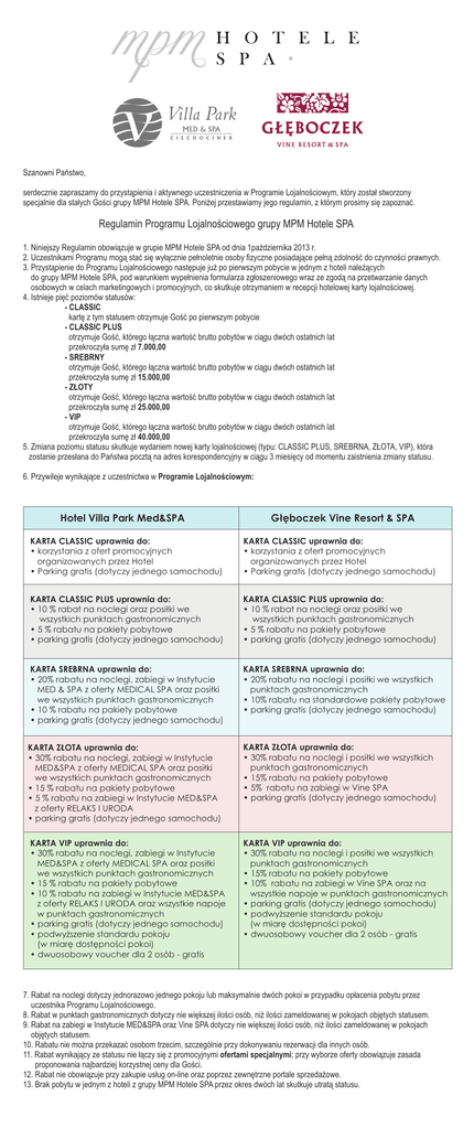 Szanowni Państwo, serdecznie zapraszamy do przystąpienia i aktywnego uczestniczenia w Programie Lojalnościowym, który został stworzony specjalnie dla stałych Gości grupy MPM Hotele SPA. Poniżej przestawiamy jego regulamin, z którym prosimy się zapoznać. Regulamin Programu Lojalnościowego grupy MPM Hotele SPA 1. Niniejszy Regulamin obowiązuje w grupie MPM Hotele SPA od dnia 1października 2013 r. 2. Uczestnikami Programu mogą stać się wyłącznie pełnoletnie osoby fizyczne posiadające pełną zdolność do czynności prawnych. 3. Przystąpienie do Programu Lojalnościowego następuje już po pierwszym pobycie w jednym z hoteli należących do grupy MPM Hotele SPA, pod warunkiem wypełnienia formularza zgłoszeniowego wraz ze zgodą na przetwarzanie danych osobowych w celach marketingowych i promocyjnych, co skutkuje otrzymaniem w recepcji hotelowej karty lojalnościowej. 4. Istnieje pięć poziomów statusów: - CLASSIC kartę z tym statusem otrzymuje Gość po pierwszym pobycie - CLASSIC PLUS otrzymuje Gość, którego łączna wartość brutto pobytów w ciągu dwóch ostatnich lat przekroczyła sumę zł 7.000,00 - SREBRNY otrzymuje Gość, którego łączna wartość brutto pobytów w ciągu dwóch ostatnich lat przekroczyła sumę zł 15.000,00 - ZŁOTY otrzymuje Gość, którego łączna wartość brutto pobytów w ciągu dwóch ostatnich lat przekroczyła sumę zł 25.000,00 - VIP otrzymuje Gość, którego łączna wartość brutto pobytów w ciągu dwóch ostatnich lat przekroczyła sumę zł 40.000,00 5. Zmiana poziomu statusu skutkuje wydaniem nowej karty lojalnościowej (typu: CLASSIC PLUS, SREBRNA, ZŁOTA, VIP), która zostanie przesłana do Państwa pocztą na adres korespondencyjny w ciągu 3 miesięcy od momentu zaistnienia zmiany statusu. 6. Przywileje wynikające z uczestnictwa w Programie Lojalnościowym: Hotel Villa Park Med&SPA Głęboczek Vine Resort & SPA KARTA CLASSIC uprawnia do: • korzystania z ofert promocyjnych organizowanych przez Hotel • Parking gratis (dotyczy jednego samochodu) KARTA CLASSIC uprawnia do: • korzystania z ofert promocyjnych organizowanych przez Hotel • Parking gratis (dotyczy jednego samochodu) KARTA CLASSIC PLUS uprawnia do: • 10 % rabat na noclegi oraz posiłki we wszystkich punktach gastronomicznych • 5 % rabatu na pakiety pobytowe • parking gratis (dotyczy jednego samochodu) KARTA CLASSIC PLUS uprawnia do: • 10 % rabat na noclegi oraz posiłki we wszystkich punktach gastronomicznych • 5 % rabatu na pakiety pobytowe • parking gratis (dotyczy jednego samochodu) KARTA SREBRNA uprawnia do: • 20% rabatu na noclegi, zabiegi w Instytucie MED & SPA z oferty MEDICAL SPA oraz posiłki we wszystkich punktach gastronomicznych • 10 % rabatu na pakiety pobytowe • parking gratis (dotyczy jednego samochodu) KARTA SREBRNA uprawnia do: • 20% rabatu na noclegi i posiłki we wszystkich punktach gastronomicznych • 10% rabatu na standardowe pakiety pobytowe • parking gratis (dotyczy jednego samochodu) KARTA ZŁOTA uprawnia do: • 30% rabatu na noclegi, zabiegi w Instytucie MED&SPA z oferty MEDICAL SPA oraz posiłki we wszystkich punktach gastronomicznych • 15 % rabatu na pakiety pobytowe • 5 % rabatu na zabiegi w Instytucie MED&SPA z oferty RELAKS I URODA • parking gratis (dotyczy jednego samochodu) KARTA ZŁOTA uprawnia do: • 30% rabatu na noclegi i posiłki we wszystkich punktach gastronomicznych • 15% rabatu na pakiety pobytowe • 5% rabatu na zabiegi w Vine SPA • parking gratis (dotyczy jednego samochodu) KARTA VIP uprawnia do: • 30% rabatu na noclegi, zabiegi w Instytucie MED&SPA z oferty MEDICAL SPA oraz posiłki we wszystkich punktach gastronomicznych • 15 % rabatu na pakiety pobytowe • 10 % rabatu na zabiegi w Instytucie MED&SPA z oferty RELAKS I URODA oraz wszystkie napoje w punktach gastronomicznych • parking gratis (dotyczy jednego samochodu) • podwyższenie standardu pokoju (w miarę dostępności pokoi) • dwuosobowy voucher dla 2 osób - gratis KARTA VIP uprawnia do: • 30% rabatu na noclegi i posiłki we wszystkich punktach gastronomicznych • 15% rabatu na pakiety pobytowe • 10% rabatu na zabiegi w Vine SPA oraz na wszystkie napoje w punktach gastronomicznych • parking gratis (dotyczy jednego samochodu) • podwyższenie standardu pokoju (w miarę dostępności pokoi) • dwuosobowy voucher dla 2 osób - gratis 7. Rabat na noclegi dotyczy jednorazowo jednego pokoju lub maksymalnie dwóch pokoi w przypadku opłacenia pobytu przez uczestnika Programu Lojalnościowego. 8. Rabat w punktach gastronomicznych dotyczy nie większej ilości osób, niż ilości zameldowanej w pokojach objętych statusem. 9. Rabat na zabiegi w Instytucie MED&SPA oraz Vine SPA dotyczy nie większej ilości osób, niż ilości zameldowanej w pokojach objętych statusem. 10. Rabatu nie można przekazać osobom trzecim, szczególnie przy dokonywaniu rezerwacji dla innych osób. 11. Rabat wynikający ze statusu nie łączy się z promocyjnymi ofertami specjalnymi; przy wyborze oferty obowiązuje zasada proponowania najbardziej korzystnej ceny dla Gości. 12. Rabat nie obowiązuje przy zakupie usług on-line oraz poprzez zewnętrzne portale sprzedażowe. 13. Brak pobytu w jednym z hoteli z grupy MPM Hotele SPA przez okres dwóch lat skutkuje utratą statusu.