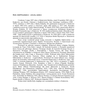 Hyła Adolf Kazimierz – artysta, malarz Urodzony 2 maja 1897 roku w Białej koło Bielska, zmarł 24 grudnia 1965 roku w Krakowie, syn Józefa i Salomei z Szałkiewiczów, brat Antoniego, rzeźbiarza (1908 – 1975), ożeniony w 1929 roku z Marią Zalipską. Do gimnazjum uczęszczał w Krakowie w latach 1903-1912, potem w Chyrowie, gdzie zdał maturę w 1917 roku. Rysunku i malarstwa uczył się u Jacka Malczewskiego. W latach 1918-1920 z przerwami służył w Wojsku Polskim. W 1919 pracował w biurze rysunkowym Kilimkarni Krajowego Związku Przemysłowego w Krakowie. W 1922 studiował historię sztuki i filozofię na UJ. Uczył rysunków gimnazjach w Będzinie w latach 1920-1936; w latach 1936-1939 i 19451948 – zajęć praktycznych w gimnazjach w Krakowie. W 1930 zdał w ASP w Krakowie egzamin na nauczyciela rysunku, a w 1936 w Instytucie Robót Ręcznych w Warszawie egzamin na nauczyciela zajęć praktycznych. Prace swoje wystawiał przed wojną corocznie w Zagłębiu Dąbrowskim i na wystawach organizowanych przez Śląskie Towarzystwo Wystaw w Katowicach oraz Towarzystwa Artystów i Literatów w Sosnowcu, którego był członkiem. Poświęcił się głównie tematyce religijnej. Kopiował obrazy religijne Rafaela, Leonarda da Vinci, Carla Dolci i innych. Do kościoła Jezuitów w Poznaniu namalował Serce Jezusa (do głównego ołtarza) i Świętego Józefa; do kościoła Świętego Krzyża w Warszawie Świętego Józefa z Dzieciątkiem i Świętą Teresę; dla sióstr Duszy Chrystusowej na Prądniku w Krakowie obraz Dusza Chrystusowa; Świętego Hieronima dla księdza prof. Jana Czuja w Warszawie (1946). Wykonał obraz Boże Miłosierdzie według objawień siostry Faustyny. Obraz znajduje się w Sanktuarium Bożego Miłosierdzia w Krakowie – Łagiewnikach. Powtórzył ten temat kilkaset razy, malując obrazy do kościołów całym kraju (m.in. w kościele Kapucynów w Krakowie, sygn. i dat. 1944, i w kościele Kapucynów w Sędziszowie, syg. i dat. 1951) i za granicą: w Anglii, Austrii, Francji, Włoszech, USA, Kanadzie, a także w Afryce (Uganda, Rodezja), Ameryce Południowej (Brazylia), Australii, Azji. Namalował też kilkadziesiąt portretów (m.in. Brata Alberta Chmielowskiego dla sióstr albertynek w Krakowie, Józefa Piłsudskiego, dwa Klementyny Zalipskiej, 1934 i 1950, żony, 1944 dr Włodzimierza Zalipskiego, 1944, prowincjałów kapucyńskich: Kazimierza Niczyńskiego, 1945, Alojzego Wojnara, 1957, Remigiusza Kranca, 1957, Ernesta Łanuchy, 1958, Padle Pio da Pietralcina, Janiny Halskiej, dwa autoportrety) i szereg pejzaży (m.in. Forum Romanum 1931, Kościółek na Obidowej 1934, Zbocze Świnicy z Czarnym Stawem Gąsienicowym 1936, Czarny Dunajec w Witowie 1937, Wąwóz Kraków w Dolinie Kościeliskiej 1947, Pejzaż morski w Orłowie 1947, Wybrzeże Sopockie 1958). Wykaz dzieł Adolfa Hyły znajduje się w posiadaniu rodziny w Krakowie. Źródło: Słownik Artystów Polskich i Obcych w Polsce działających, Wrocław 1979