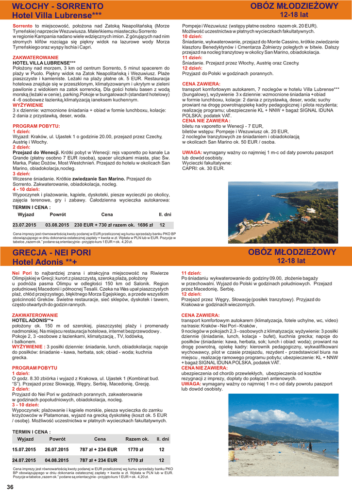 OBÓZ M£ODZIE¯OWY W£OCHY - SORRENTO Hotel Villa Lubrense*** 12-18 lat Sorrento to miejscowoœæ, po³o¿ona nad Zatok¹ Neapolitañsk¹ (Morze Tyrreñskie) naprzeciw Wezuwiusza. Maleñkiemu miasteczku Sorrento w regionie Kampania nadano wiele wdziêcznych imion. Z góruj¹cych nad nim stromych klifów rozci¹ga siê piêkny widok na lazurowe wody Morza Tyrreñskiego oraz wyspy Ischia i Capri. ZAKWATEROWANIE HOTEL VILLA LUBRENSE*** Po³o¿ony nad morzem, 3 km od centrum Sorrento, 5 minut spacerem do pla¿y w Puolo. Piêkny widok na Zatok Neapolitañsk¹ i Wezuwiusz. Pla¿e piaszczyste i kamieniste. Le¿aki na pla¿y p³atne ok. 5 EUR. Restauracja hotelowa znajduje siê w przeszklonym, klimatyzowanym i ukrytym w zieleni pawilonie z widokiem na zatok sorrenck¹. Dla goœci hotelu basen z wod¹ morsk¹ (le¿aki w cenie), parking.Pokoje w bungalowach (standard hotelowy) 4 - 6 osobowe z ³azienk¹, klimatyzacj¹ i aneksem kuchennym. WY¯YWIENIE 3 x dziennie: wzmocnione œniadania + obiad w formie lunchboxu, kolacje: 2 dania z przystawk¹, deser, woda. PROGRAM POBYTU: 1 dzieñ: Wyjazd: Kraków, ul. Ujastek 1 o godzinie 20.00, przejazd przez Czechy, Austriê i W³ochy. 2 dzieñ: Przejazd do Wenecji. Krótki pobyt w Wenecji: rejs vaporetto po kanale La Grande (p³atny osobno 7 EUR /osoba), spacer uliczkami miasta, plac Œw. Marka, Pa³ac Do¿ów, Most Westchnieñ. Przejazd do hotelu w okolicach San Marino, obiadokolacja, nocleg. 3 dzieñ: Wczesne œniadanie. Krótkie zwiedzanie San Marino. Przejazd do Sorrento. Zakwaterowanie, obiadokolacja, nocleg. 4 - 10 dzieñ: Wypoczynek i pla¿owanie, k¹piele, dyskoteki, piesze wycieczki po okolicy, zajêcia terenowe, gry i zabawy. Ca³odzienna wycieczka autokarowa: TERMIN I CENA : Wyjazd Powrót 23.07.2015 03.08.2015 Cena Pompeje i Wezuwiusz (wstêpy p³atne osobno razem ok. 20 EUR). Mo¿liwoœæ uczestnictwa w p³atnych wycieczkach fakultatywnych. 10 dzieñ: Œniadanie, wykwaterowanie, przejazd do Monte Cassino, krótkie zwiedzanie klasztoru Benedyktynów i Cmentarza ¯o³nierzy poleg³ych w bitwie. Dalszy przejazd na nocleg tranzytowy w okolicy San Marino, obiadokolacja. 11 dzieñ: Œniadanie. Przejazd przez W³ochy, Austriê oraz Czechy. 12 dzieñ: Przyjazd do Polski w godzinach porannych. CENA ZAWIERA: transport komfortowym autokarem, 7 noclegów w hotelu Villa Lubrense*** (bungalowy), wy¿ywienie 3 x dziennie: wzmocnione œniadania + obiad w formie lunchboxu, kolacje: 2 dania z przystawk¹, deser, woda; suchy prowiant na drogê powrotn¹opiekê kadry pedagogicznej i pilota rezydenta; realizacjê programu; ubezpieczenie KL + NNW + baga¿ SIGNAL IDUNA POLSKA; podatek VAT. CENA NIE ZAWIERA : biletu na vaporetto w Wenecji - 7 EUR, biletów wstêpu: Pompeje i Wezuwiusz ok. 20 EUR, 2 noclegów tranzytowych ze œniadaniem i obiadokolacj¹ w okolicach San Marino ok. 50 EUR / osoba. UWAGA: wymagany wa¿ny co najmniej 1 m-c od daty powrotu paszport lub dowód osobisty. Wycieczki fakultatywne: CAPRI: ok. 30 EUR. Il. dni 230 EUR + 730 z³ razem ok. 1696 z³ 12 Cena imprezy jest równowartoœci¹ kwoty podanej w EUR przeliczonej wg kursu sprzeda¿y banku PKO BP obowi¹zuj¹cego w dniu dokonania ostatecznej zap³aty + kwota w z³. Wp³ata w PLN lub w EUR. Pozycje w tabelce „razem ok.” podane s¹ orientacyjnie - przyjêto kurs 1 EUR = ok. 4,20 z³. OBÓZ M£ODZIE¯OWY GRECJA - NEI PORI Hotel Adonis **+ 12-18 lat Nei Pori to najbardziej znana i atrakcyjna miejscowoœæ na Riwierze Olimpijskiej w Grecji; kurort z piaszczyst¹, szerok¹ pla¿¹, po³o¿ony u podnó¿a pasma Olimpu w odleg³oœci 150 km od Salonik. Region po³udniowej Macedonii i pó³nocnej Tesalii. Czeka na Was upa³ piaszczystych pla¿, ch³ód przejrzystego, b³êkitnego Morza Egejskiego, a przede wszystkim goœcinnoœæ Greków. Œwietne restauracje, sieæ sklepów, dyskotek i tawern, czêsto otwartych do godzin rannych. 11 dzieñ: Po œniadaniu wykwaterowanie do godziny 09.00, z³o¿enie baga¿y w przechowalni. Wyjazd do Polski w godzinach po³udniowych. Przejazd przez Macedoniê, Serbiê. 12 dzieñ: Przejazd przez Wêgry, S³owacjê (posi³ek tranzytowy). Przyjazd do Krakowa w godzinach wieczornych. ZAKWATEROWANIE HOTEL ADONIS**+ po³o¿ony ok. 150 m od szerokiej, piaszczystej pla¿y i promenady nadmorskiej. Na miejscu restauracja hotelowa, internet bezprzewodowy . Pokoje 2, 3 -osobowe z ³azienkami, klimatyzacj¹ , TV, lodówk¹, i balkonem. WY¯YWIENIE : 3 posi³ki dziennie: œniadanie, lunch, obiadokolacja; napoje do posi³ków: œniadanie - kawa, herbata, sok; obiad - woda; kuchnia grecka. CENA ZAWIERA: transport komfortowym autokarem (klimatyzacja, fotele uchylne, wc, video) na trasie: Kraków - Nei Pori - Kraków , 9 noclegów w pokojach 2,3 - osobowych z klimatyzacja; wy¿ywienie: 3 posi³ki dziennie (œniadanie, lunch, kolacja - bufet), kuchnia grecka; napoje do posi³ków (œniadanie: kawa, herbata, sok; lunch i obiad: woda); prowiant na drogê powrotn¹, opiekê kadry: kierownik pedagogiczny, wykwalifikowani wychowawcy, pilot w czasie przejazdu, rezydent - przedstawiciel biura na miejscu , realizacjê ramowego programu pobytu; ubezpieczenie: KL + NNW + baga¿ SIGNAL IDUNA POLSKA, podatek VAT. CENA NIE ZAWIERA: ubezpieczenia od chorób przewlek³ych, ubezpieczenia od kosztów rezygnacji z imprezy, dop³aty do po³¹czeñ antenowych. UWAGA: wymagany wa¿ny co najmniej 1 m-c od daty powrotu paszport lub dowód osobisty. PROGRAM POBYTU 1 dzieñ: O godz. 8.30 zbiórka i wyjazd z Krakowa, ul. Ujastek 1 (Kombinat bud. “S”). Przejazd przez S³owacjê, Wêgry, Serbiê, Macedoniê, Grecjê. 2 dzieñ: Przyjazd do Nei Pori w godzinach porannych, zakwaterowanie w godzinach popo³udniowych, obiadokolacja, nocleg. 3 - 10 dzieñ: Wypoczynek; pla¿owanie i k¹piele morskie, piesza wycieczka do zamku krzy¿owców w Platamonas, wyjazd na greck¹ dyskotekê (koszt ok. 5 EUR / osobê). Mo¿liwoœæ uczestnictwa w p³atnych wycieczkach fakultatywnych. TERMIN I CENA : Wyjazd Powrót Cena Razem ok. 