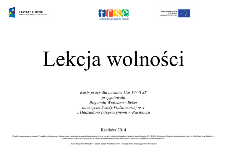 Lekcja wolności Karty pracy dla uczniów klas IV-VI SP przygotowała Bogumiła Wołoszyn - Beker nauczyciel Szkoły Podstawowej nr 1 z Oddziałami Integracyjnymi w Raciborzu Racibórz 2014 Produkt opracowany w ramach Projektu systemowego „Zagraniczna mobilność szkolnej kadry edukacyjnej w ramach projektów instytucjonalnych”, poddziałanie 3.3.1 POKL, Programu Uczenie się przez całe życie, pt:„Be Smart, My Student ! – doskonalenie zawodowe nauczycieli w zakresie rozwoju kompetencji kluczowych ucznia na przykładzie szkół europejskich”. Autor: Bogumiła Wołoszyn – Beker Szkoła Podstawowa nr 1 z Oddziałami Integracyjnymi w Raciborzu KARTA PRACY NR 1 1. Wyznacz z diagramu co trzecią literę, odczytaj i zapisz hasło: (pierwszą literę masz już wyznaczoną) W A C O D Z L U I N K B O F G Ś T W Ć …………………………………………………………………………………………………………………....................................... 2. Wypisz wyrazy (symbole), które kojarzą Ci się z odczytanym hasłem: ……………………………………………………….. …………………………………………….. ………………………………………………………. ……………………………………………………….. …………………………………………….. ………………………………………………………. ……………………………………………………….. ……………………………………………… ……………………………………………………… 3. Pomyśl, jakiego materiału roślinnego użyłbyś/użyłabyś do wykonania wyżej wymienionych symboli w pracy plastycznej: ……………………………………………………….. …………………………………………….. ………………………………………………………. ……………………………………………………….. …………………………………………….. ………………………………………………………. ……………………………………………………….. ……………………………………………… ……………………………………………………… ……………………………………….. ……………………………….. . ……………………………………… Produkt opracowany w ramach Projektu systemowego „Zagraniczna mobilność szkolnej kadry edukacyjnej w ramach projektów instytucjonalnych”, poddziałanie 3.3.1 POKL, Programu Uczenie się przez całe życie, pt:„Be Smart, My Student ! – doskonalenie zawodowe nauczycieli w zakresie rozwoju kompetencji kluczowych ucznia na przykładzie szkół europejskich”. Autor: Bogumiła Wołoszyn – Beker Szkoła Podstawowa nr 1 z Oddziałami Integracyjnymi w Raciborzu KARTA PRACY NR 2 1. Wyznacz z diagramu co trzecią literę, odczytaj i zapisz hasło: (pierwszą literę masz już wyznaczoną) W A C O D Z L U I N K B O F G Ś T W Ć …………………………………………………………………………………………………………………....................................... 2. Pomyśl jakich kolorów użyłbyś/użyłabyś, do namalowania wyżej wymienionego hasła. Narysuj je : Produkt opracowany w ramach Projektu systemowego „Zagraniczna mobilność szkolnej kadry edukacyjnej w ramach projektów instytucjonalnych”, poddziałanie 3.3.1 POKL, Programu Uczenie się przez całe życie, pt:„Be Smart, My Student ! – doskonalenie zawodowe nauczycieli w zakresie rozwoju kompetencji kluczowych ucznia na przykładzie szkół europejskich”. Autor: Bogumiła Wołoszyn – Beker Szkoła Podstawowa nr 1 z Oddziałami Integracyjnymi w Raciborzu KARTA PRACY NR 3 Jesteś wolnym człowiekiem i chcesz sobie zbudować szałas. 1. Pomyśl , jak wykonać budowlę? Narysuj, jak miałaby wyglądać? 2. Oblicz, jakich materiałów roślinnych potrzebujesz? Jak i czym ogrodzisz swój teren? Plan szałasu i ogrodzenia: Potrzebuję.................................................................................................................................................................................................... Produkt opracowany w ramach Projektu systemowego „Zagraniczna mobilność szkolnej kadry edukacyjnej w ramach projektów instytucjonalnych”, poddziałanie 3.3.1 POKL, Programu Uczenie się przez całe życie, pt:„Be Smart, My Student ! – doskonalenie zawodowe nauczycieli w zakresie rozwoju kompetencji kluczowych ucznia na przykładzie szkół europejskich”. Autor: Bogumiła Wołoszyn – Beker Szkoła Podstawowa nr 1 z Oddziałami Integracyjnymi w Raciborzu
