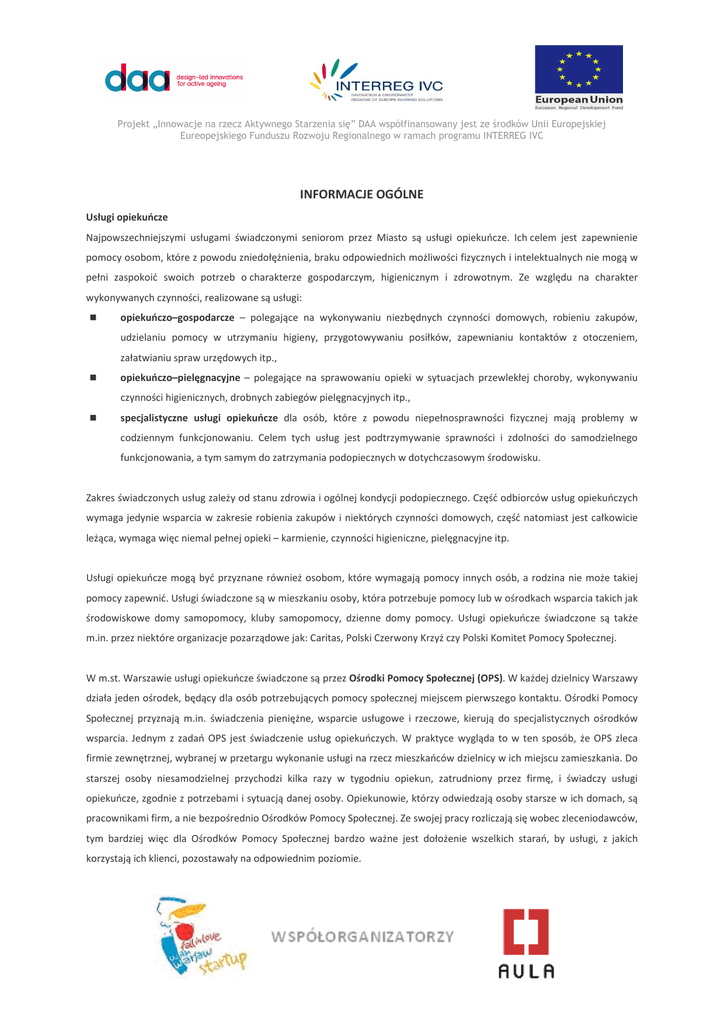 Projekt „Innowacje na rzecz Aktywnego Starzenia się” DAA współfinansowany jest ze środków Unii Europejskiej Eureopejskiego Funduszu Rozwoju Regionalnego w ramach programu INTERREG IVC INFORMACJE OGÓLNE Usługi opiekuńcze Najpowszechniejszymi usługami świadczonymi seniorom przez Miasto są usługi opiekuńcze. Ich celem jest zapewnienie pomocy osobom, które z powodu zniedołężnienia, braku odpowiednich możliwości fizycznych i intelektualnych nie mogą w pełni zaspokoić swoich potrzeb o charakterze gospodarczym, higienicznym i zdrowotnym. Ze względu na charakter wykonywanych czynności, realizowane są usługi: opiekuńczo–gospodarcze – polegające na wykonywaniu niezbędnych czynności domowych, robieniu zakupów, udzielaniu pomocy w utrzymaniu higieny, przygotowywaniu posiłków, zapewnianiu kontaktów z otoczeniem, załatwianiu spraw urzędowych itp., opiekuńczo–pielęgnacyjne – polegające na sprawowaniu opieki w sytuacjach przewlekłej choroby, wykonywaniu czynności higienicznych, drobnych zabiegów pielęgnacyjnych itp., specjalistyczne usługi opiekuńcze dla osób, które z powodu niepełnosprawności fizycznej mają problemy w codziennym funkcjonowaniu. Celem tych usług jest podtrzymywanie sprawności i zdolności do samodzielnego funkcjonowania, a tym samym do zatrzymania podopiecznych w dotychczasowym środowisku. Zakres świadczonych usług zależy od stanu zdrowia i ogólnej kondycji podopiecznego. Część odbiorców usług opiekuńczych wymaga jedynie wsparcia w zakresie robienia zakupów i niektórych czynności domowych, część natomiast jest całkowicie leżąca, wymaga więc niemal pełnej opieki – karmienie, czynności higieniczne, pielęgnacyjne itp. Usługi opiekuńcze mogą być przyznane również osobom, które wymagają pomocy innych osób, a rodzina nie może takiej pomocy zapewnić. Usługi świadczone są w mieszkaniu osoby, która potrzebuje pomocy lub w ośrodkach wsparcia takich jak środowiskowe domy samopomocy, kluby samopomocy, dzienne domy pomocy. Usługi opiekuńcze świadczone są także m.in. przez niektóre organizacje pozarządowe jak: Caritas, Polski Czerwony Krzyż czy Polski Komitet Pomocy Społecznej. W m.st. Warszawie usługi opiekuńcze świadczone są przez Ośrodki Pomocy Społecznej (OPS). W każdej dzielnicy Warszawy działa jeden ośrodek, będący dla osób potrzebujących pomocy społecznej miejscem pierwszego kontaktu. Ośrodki Pomocy Społecznej przyznają m.in. świadczenia pieniężne, wsparcie usługowe i rzeczowe, kierują do specjalistycznych ośrodków wsparcia. Jednym z zadań OPS jest świadczenie usług opiekuńczych. W praktyce wygląda to w ten sposób, że OPS zleca firmie zewnętrznej, wybranej w przetargu wykonanie usługi na rzecz mieszkańców dzielnicy w ich miejscu zamieszkania. Do starszej osoby niesamodzielnej przychodzi kilka razy w tygodniu opiekun, zatrudniony przez firmę, i świadczy usługi opiekuńcze, zgodnie z potrzebami i sytuacją danej osoby. Opiekunowie, którzy odwiedzają osoby starsze w ich domach, są pracownikami firm, a nie bezpośrednio Ośrodków Pomocy Społecznej. Ze swojej pracy rozliczają się wobec zleceniodawców, tym bardziej więc dla Ośrodków Pomocy Społecznej bardzo ważne jest dołożenie wszelkich starań, by usługi, z jakich korzystają ich klienci, pozostawały na odpowiednim poziomie. Projekt „Innowacje na rzecz Aktywnego Starzenia się” DAA współfinansowany jest ze środków Unii Europejskiej Eureopejskiego Funduszu Rozwoju Regionalnego w ramach programu INTERREG IVC Osoby z niepełnosprawnościami mogą skorzystać ze specjalistycznych usług opiekuńczych (SUO). SUO są to usługi dostosowane do szczególnych potrzeb wynikających z rodzaju schorzenia lub niepełnosprawności, świadczone przez osoby ze specjalistycznym przygotowaniem zawodowym. Ośrodek pomocy społecznej, przyznając specjalistyczne usługi opiekuńcze, ustala ich zakres, okres i miejsce świadczenia. Są one skierowane do dorosłych osób z zaburzeniami psychicznymi oraz dzieci z autyzmem i niepełnosprawnością intelektualną. SUO dla dorosłych: SUO dla dorosłych osób z zaburzeniami psychicznymi obejmują uczenie i rozwijanie umiejętności niezbędnych do samodzielnego życia, w tym zwłaszcza: 1) kształtowanie umiejętności zaspokajania podstawowych potrzeb życiowych i umiejętności społecznego funkcjonowania, 2) prowadzenie treningu samoobsługi, gospodarczego i finansowego, 3) motywowanie do aktywności, leczenia i rehabilitacji, 4) specjalistyczne wsparcie i pomoc w życiu w rodzinie. SUO dla dzieci: W ramach SUO dla dzieci ze spektrum autyzmu, niepełnosprawnością intelektualną i innymi zaburzeniami oferowana jest pomoc w zakresie uczenia i rozwijania umiejętności niezbędnych do samodzielnego życia, w tym : 1) poprawa i rozwijanie świadomości własnego ciała poprzez prowadzenie treningów umiejętności samoobsługi w zakresie sygnalizowania potrzeb, samodzielnego jedzenia, mycia się, ubierania się i rozbierania, 2) wspomaganie procesu uczenia się np. poprzez rozwijanie zdolności podczas zabawy, malowania, muzykoterapii, artterapii, itp., 3) trening umiejętności społecznych np. poprzez kształtowanie pozytywnych relacji osoby wspieranej z najbliższymi, z rówieśnikami i innymi osobami dorosłymi, 4) usprawnianie zaburzonych funkcji organizmu np. poprzez wykonywanie prostych i bezpiecznych ćwiczeń prowadzących do lepszej współpracy obu półkul, pracę nad poprawą koncentracji i utrzymywania kontaktu wzrokowego, usprawnianie funkcji słuchowych wzrokowych, naukę alternatywnego (pozawerbalnego) sposobu komunikowania, 5) uzupełnianie procesu terapeutycznego poza miejscem zamieszkania np. poprzez asystowanie w sytuacjach, gdzie jest to niezbędne, w celu zintensyfikowania procesu terapeutycznego. Osoby, które wymagają całodobowej opieki kierowane są do Domów Pomocy Społecznej (DPS). DPS są jednostkami pomocy społec