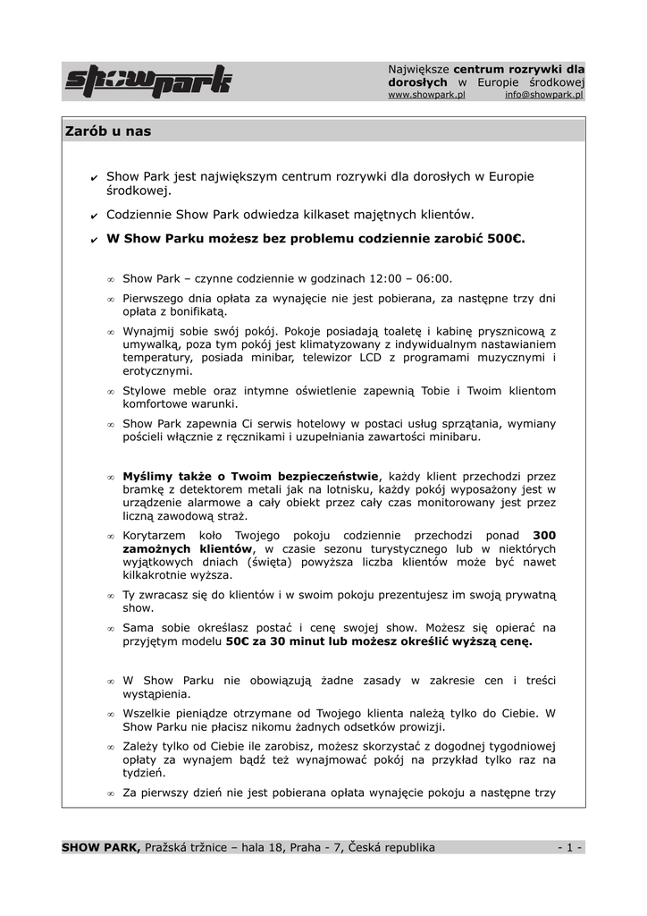 Największe centrum rozrywki dla dorosłych w Europie środkowej www.showpark.pl [email protected] Zarób u nas ✔ Show Park jest największym centrum rozrywki dla dorosłych w Europie środkowej. ✔ Codziennie Show Park odwiedza kilkaset majętnych klientów. ✔ W Show Parku możesz bez problemu codziennie zarobić 500€. • Show Park – czynne codziennie w godzinach 12:00 – 06:00. • Pierwszego dnia opłata za wynajęcie nie jest pobierana, za następne trzy dni opłata z bonifikatą. • Wynajmij sobie swój pokój. Pokoje posiadają toaletę i kabinę prysznicową z umywalką, poza tym pokój jest klimatyzowany z indywidualnym nastawianiem temperatury, posiada minibar, telewizor LCD z programami muzycznymi i erotycznymi. • Stylowe meble oraz intymne oświetlenie zapewnią Tobie i Twoim klientom komfortowe warunki. • Show Park zapewnia Ci serwis hotelowy w postaci usług sprzątania, wymiany pościeli włącznie z ręcznikami i uzupełniania zawartości minibaru. • Myślimy także o Twoim bezpieczeństwie, każdy klient przechodzi przez bramkę z detektorem metali jak na lotnisku, każdy pokój wyposażony jest w urządzenie alarmowe a cały obiekt przez cały czas monitorowany jest przez liczną zawodową straż. • Korytarzem koło Twojego pokoju codziennie przechodzi ponad 300 zamożnych klientów, w czasie sezonu turystycznego lub w niektórych wyjątkowych dniach (święta) powyższa liczba klientów może być nawet kilkakrotnie wyższa. • Ty zwracasz się do klientów i w swoim pokoju prezentujesz im swoją prywatną show. • Sama sobie określasz postać i cenę swojej show. Możesz się opierać na przyjętym modelu 50€ za 30 minut lub możesz określić wyższą cenę. • W Show Parku nie obowiązują żadne zasady w zakresie cen i treści wystąpienia. • Wszelkie pieniądze otrzymane od Twojego klienta należą tylko do Ciebie. W Show Parku nie płacisz nikomu żadnych odsetków prowizji. • Zależy tylko od Ciebie ile zarobisz, możesz skorzystać z dogodnej tygodniowej opłaty za wynajem bądź też wynajmować pokój na przykład tylko raz na tydzień. • Za pierwszy dzień nie jest pobierana opłata wynajęcie pokoju a następne trzy SHOW PARK, Pražská tržnice – hala 18, Praha - 7, Česká republika -1- Największe centrum rozrywki dla dorosłych w Europie środkowej www.showpark.pl [email protected] dni opłata jest z bonifikatą. • Nikomu nie płacisz żadnych odsetek! W Show Parku opłacasz tylko wynajem pokoju, wszystkie pieniądze za show od klientów należą tylko do Ciebie. • Cennik wynajmu – będzie Cię obowiązywał aż po wyczerpaniu wszystkich zniżek i bonifikat! • Cena wynajmu za pół dnia 85€ - 12:00 – 22:00. • Cena całodziennego wynajmu 130€ - 12:00 – 06:00. • Cena tygodniowego wynajmu 700€ – 7 dowolnych następujących po sobie dni w ramach dwóch tygodni kalendarzowych. Rozrywka ✔ Praga jest najbardziej rozrywkowym miastem Europy. ✔ Wszystkie światowe modne marki mają w Pradze swoje butiki. ✔ Niepowtarzalna atmosfera sto wieżowej matki miast. • W przypadku, że praca w Show Parku nie będzie Ci odpowiadać nie musisz mieć obaw. Praga oferuje niezliczoną liczbę okazji do zarobku. • Tą najprostszą i jednocześnie dobrze płatną możliwością dla atrakcyjnych dziewcząt jest praca jako modelki. • Show Park bezpośrednio współpracuje z agencją przyjmującą modelki. Wszystko możesz załatwić przy rezerwacji! • Setki butików ze światowymi modnymi markami, najnowocześniejsze centra handlowe i galerie. • Z pewnością chodzenie na zakupy będzie przyjemnością, ponieważ barwność oferty jest niewiarygodna. • Restauracje i bary z najlepszymi specjałami kulinarnymi i koktajlami serwowanymi przez najsympatyczniejszych barmanów, wieczorki i imprezy, które nigdy się nie kończą. • Słynne praskie kluby jak np. MECCA lub RADOST FX przedstawią Ci najlepszych światowych didżejów. • Multipleksy, klasyczne kina, teatry, sceny musicalowe, opera, muzea, galerie. Sama nie będziesz wiedzieć dokąd wpierw pójść. Bowiem Praga jest najbardziej kulturalnym miastem Europy. • Ze względu na swoją niepowtarzalną atmosferę Pragę co roku odwiedza około 4 milionów turystów. Większość młodych Czechów mówi po angielsku, starsze pokolenie (ze względu na historyczne powiązania z blokiem wschodnim) mówi SHOW PARK, Pražská tržnice – hala 18, Praha - 7, Česká republika -2- Największe centrum rozrywki dla dorosłych w Europie środkowej www.showpark.pl [email protected] po rosyjsku. Transport i zakwaterowanie ✔ Praga jest łatwo osiągalna na wiele sposobów. ✔ Możesz sobie zarezerwować połączenie lotnicze, pociągiem lub autobusem. ✔ W Pradze istnieje duży wybór różnego rodzaju zakwaterowania, od pięciogwiazdkowych hoteli po hotele turystyczne bądź możliwość wynajęcia własnego apartamentu. ✔ Wszystko można załatwić aż po przyjeździe, lub zarezerwować sobie zakwaterowanie już teraz on-line! • Bilet lotniczy do Pragi i z powrotem można kupić już za 66€. • Bilet kolejowy do Pragi kosztuje już 20€. • Lot do Pragi trwa około 55 minut. W tym wypadku chodzi o komfortowy i bardziej kosztowny sposób podróżowania. • Podróż do Pragi pociągiem trwa około 9 godzin, jest wygodna i przyjemna zapewniając wiele przeżyć z podróży. • Jazda do Pragi autobusem trwa około 13 godzin. • www.expedia.com – rezerwacja biletów lotniczych – język angielski • www.kayak.com - rezerwacja biletów lotniczych - język angielski • www.letuska.com - rezerwacja biletów lotniczych - język angielski • www.polrail.com - połączenia kolejowe - język angielski • www.idos.cz - czeskie połączenia kolejowe i autobusowe - język czeski • W Pradze można zarezerwować dowolny typ zakwaterowania. • Praga dysponuje ogromną liczbą hoteli i prywatnych stancji, rezerwacja jest bardzo prosta. • Zakwaterowanie mo