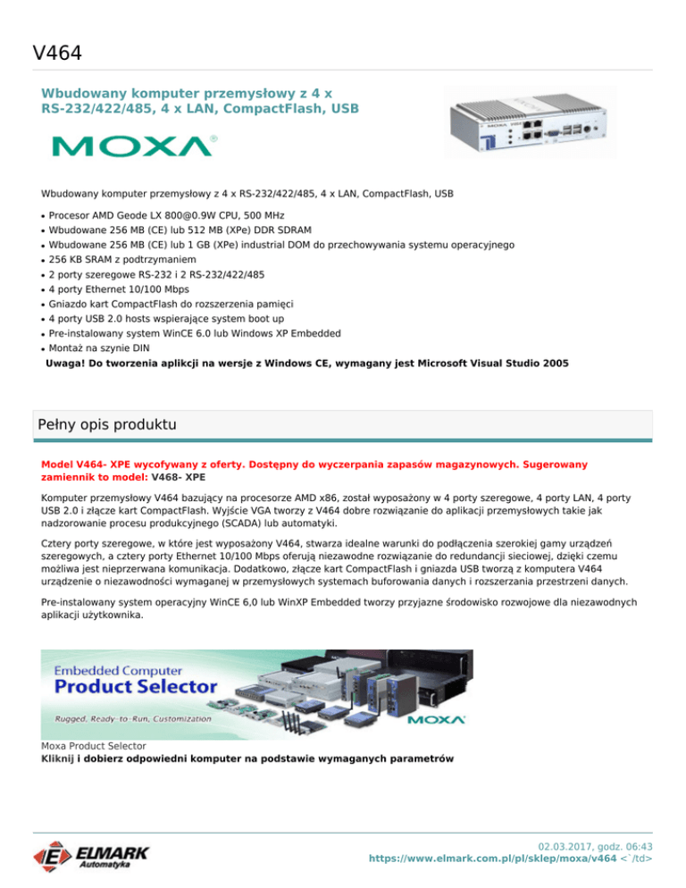 V464 Wbudowany komputer przemysłowy z 4 x RS-232/422/485, 4 x LAN, CompactFlash, USB Wbudowany komputer przemysłowy z 4 x RS-232/422/485, 4 x LAN, CompactFlash, USB ● Procesor AMD Geode LX [email protected] CPU, 500 MHz ● Wbudowane 256 MB (CE) lub 512 MB (XPe) DDR SDRAM ● Wbudowane 256 MB (CE) lub 1 GB (XPe) industrial DOM do przechowywania systemu operacyjnego ● 256 KB SRAM z podtrzymaniem ● 2 porty szeregowe RS-232 i 2 RS-232/422/485 ● 4 porty Ethernet 10/100 Mbps ● Gniazdo kart CompactFlash do rozszerzenia pamięci ● 4 porty USB 2.0 hosts wspierające system boot up ● Pre-instalowany system WinCE 6.0 lub Windows XP Embedded ● Montaż na szynie DIN Uwaga! Do tworzenia aplikcji na wersje z Windows CE, wymagany jest Microsoft Visual Studio 2005 Pełny opis produktu Model V464- XPE wycofywany z oferty. Dostępny do wyczerpania zapasów magazynowych. Sugerowany zamiennik to model: V468- XPE Komputer przemysłowy V464 bazujący na procesorze AMD x86, został wyposażony w 4 porty szeregowe, 4 porty LAN, 4 porty USB 2.0 i złącze kart CompactFlash. Wyjście VGA tworzy z V464 dobre rozwiązanie do aplikacji przemysłowych takie jak nadzorowanie procesu produkcyjnego (SCADA) lub automatyki. Cztery porty szeregowe, w które jest wyposażony V464, stwarza idealne warunki do podłączenia szerokiej gamy urządzeń szeregowych, a cztery porty Ethernet 10/100 Mbps oferują niezawodne rozwiązanie do redundancji sieciowej, dzięki czemu możliwa jest nieprzerwana komunikacja. Dodatkowo, złącze kart CompactFlash i gniazda USB tworzą z komputera V464 urządzenie o niezawodności wymaganej w przemysłowych systemach buforowania danych i rozszerzania przestrzeni danych. Pre-instalowany system operacyjny WinCE 6,0 lub WinXP Embedded tworzy przyjazne środowisko rozwojowe dla niezawodnych aplikacji użytkownika. Moxa Product Selector Kliknij i dobierz odpowiedni komputer na podstawie wymaganych parametrów 02.03.2017, godz. 06:43 https://www.elmark.com.pl/pl/sklep/moxa/v464 <`/td> Specyfikacja techniczna ● System Procesor AMD Geode LX [email protected] z 128K L2 Cache, 500 MHz System operacyjny (pre-instalowany) Windows CE 6.0/Xpe FSB 400 MHz System Chipset AMD CS5536 Magistrala rozszerzeń PC/104-Plus BIOS 4 Mb Flash BIOS, wspierający Plug & Play, APM 1.2, ACPI 1.0 Pamięć systemowa Gniazdo SO-DIMM 200-pin z wbudowanym 256 MB (CE) lub 512 MB (XPe) DDR, wspierające DDR400 do 1 GB USB 4 porty USB 2.0 host, złącze typu A, wspierające system boot up Audio AC97 Klawiatura/Mysz 1 złącze PS/2 wspierające połączenie klawiatury i myszy poprzez kabel typu Y ● Wyświetlanie Kontroler graficzny Zintegrowany z CPU kontroler grafiki 2D Wyjście Interfejs CRT ● Przechowywanie danych Wbudowane 256 MB (CE) lub 1 GB (XPe) industrial DOM Rozszerzenie Dostępne drugie złącze kart CompactFlash ● LAN Ethernet 4 porty 10/100 Mbps z autodetekcją Izolacja Wbudowana izolacja magnetyczna 1,5 kV Kontroler Realtek RTL8100CL ● Interfejs szeregowy Standardy szeregowe 2 x RS-232, 2 x RS-232/422/485, wybierane programowo 02.03.2017, godz. 06:43 https://www.elmark.com.pl/pl/sklep/moxa/v464 <`/td> Liczba portów 4 Typ podłączenia DB9 Zabezpieczenie ESD 15 kV dla wszystkich sygnałów ● Parametry komunikacji szeregowej Bity danych 5, 6, 7, 8 Bity stopu 1, 1.5, 2 Parzystość None, Even, Odd, Space, Mark Kontrola przepływu RTS/CTS, XON/XOFF, ADDC (automatic data direction control) dla RS-485 Prędkość transmisji 50 bps do 921,6 kbps (wsparcie dla niestandardowych prędkości transmisji - więcej w instrukcji użytkownika) ● Charakterystyka mechaniczna Obudowa Aluminum, EPIC form factor Waga 1,32 kg Wymiary 223 x 120.5 x 57 mm Mocowanie Szyna DIN, na ścianę ● Zasilanie Napięcie zasilania ● 9 to 36 VDC Spełnione normy Bezpieczeństwo UL/cUL (UL60950-1, CSA C22.2 No. 60950-1-03), LVD, CCC (GB4943) EMC CE (EN55022 Class A, EN61000-3-2 Class A, EN61000-3-3, EN55024), FCC (Part 15 Subpart B, CISPR 22 Class A), CCC (GB9254, GB 17625.1) Dyrektywy RoHS, WEEE ● Inne funkcje Alarmowanie Wbudowany buzzer oraz zegar czasu rzeczywistego (RTC) z baterią podtrzymującą 02.03.2017, godz. 06:43 https://www.elmark.com.pl/pl/sklep/moxa/v464 <`/td> Wyzwalanie automatycznego restartu ● Wbudowany watchdog timer (WDT) Specyfikacja oprogramowania Windows XP Embedded Protokoły DHCP, IPv4, DNS, IPsec, HTTP, TCP, UDP, ICMP, IGMP, ARP, TAPI, TSP, SNMP, NTP, ICS, PPP, CHAP, EAP, SNTP, Telnet, SNTP, FTP, SMTP, PPPoE, PPTP, NetBIOS System plików NTFS Programy użytkowe Windows command shell, Telnet, ftp, web-based administration manager, Wireless Zero Configuration Wspierane usługi Telnet Server: Allows users to connect to Telnet servers from remote computers. IIS Web Server: Allows you to create and manage Web sites. Terminal Server: Microsoft Terminal Server client application (mstsc.exe). COM+ Services: The next evolution of Microsoft Component Object Model (COM) and Microsoft Transaction Server (MTS). Computer Browser Service: Computer browsing functionality exposed by Windows through Microsoft Networking. Allows a client machine to browse its network neighborhood for available computers, exposing file and print sharing services. Disk Management Services: Support for disk and volume management operations. The component implements a Component Object Model (COM) interface that can be used to query and configure disks and volumes, both basic and dynamic. The component also monitors disk arrivals and removals and other changes in the storage subsystem. Remote Registry Service: Enables remote users to modify registry settings on this computer. Środowisko deweloperskie Microsoft .Net Framework 2.0 with service pack 2 (CLR and the .NET Framework class library) Active Directory Service Interface (ADSI) Core Active Template Library (ATL),ASP.NET 2.0 Certificate Request Client & Certificate Autoenrollment (CLR and the .NET Framework class library) COM APIs Common Control Libraries Common File Dialogs D