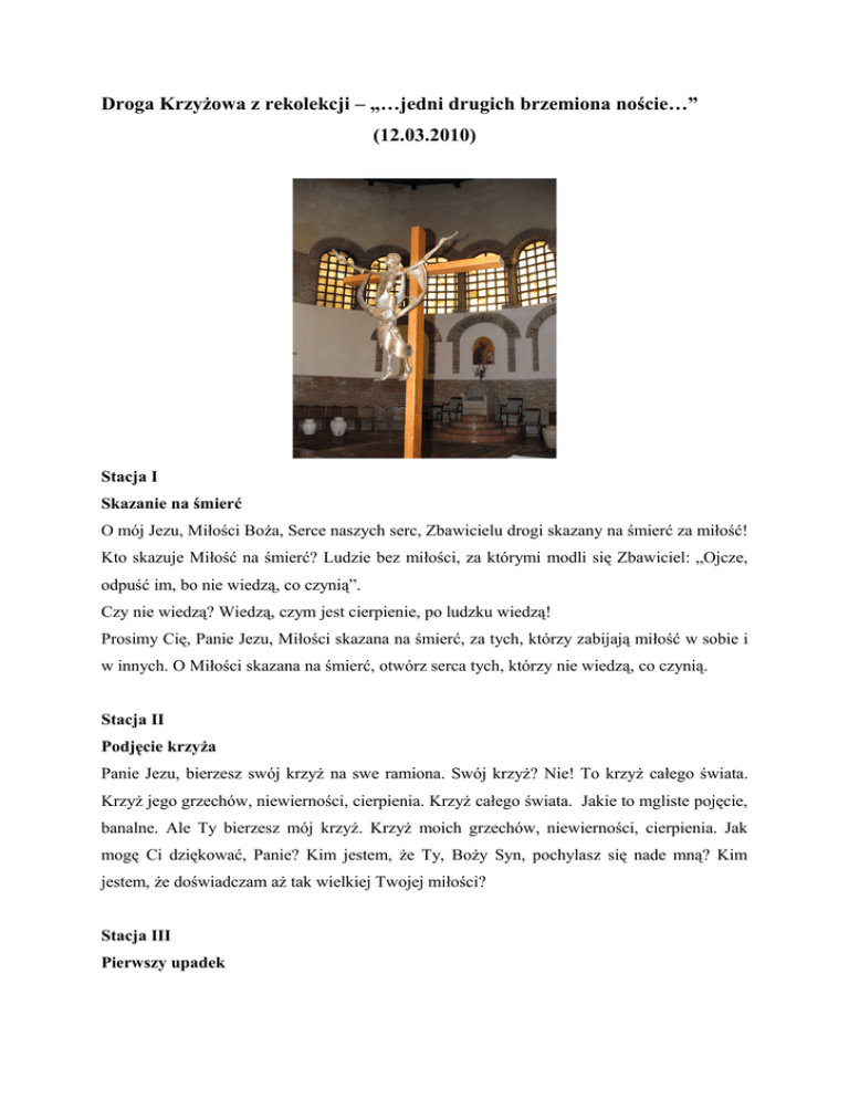 Droga Krzyżowa z rekolekcji – „…jedni drugich brzemiona noście…” (12.03.2010) Stacja I Skazanie na śmierć O mój Jezu, Miłości Boża, Serce naszych serc, Zbawicielu drogi skazany na śmierć za miłość! Kto skazuje Miłość na śmierć? Ludzie bez miłości, za którymi modli się Zbawiciel: „Ojcze, odpuść im, bo nie wiedzą, co czynią”. Czy nie wiedzą? Wiedzą, czym jest cierpienie, po ludzku wiedzą! Prosimy Cię, Panie Jezu, Miłości skazana na śmierć, za tych, którzy zabijają miłość w sobie i w innych. O Miłości skazana na śmierć, otwórz serca tych, którzy nie wiedzą, co czynią. Stacja II Podjęcie krzyża Panie Jezu, bierzesz swój krzyż na swe ramiona. Swój krzyż? Nie! To krzyż całego świata. Krzyż jego grzechów, niewierności, cierpienia. Krzyż całego świata. Jakie to mgliste pojęcie, banalne. Ale Ty bierzesz mój krzyż. Krzyż moich grzechów, niewierności, cierpienia. Jak mogę Ci dziękować, Panie? Kim jestem, że Ty, Boży Syn, pochylasz się nade mną? Kim jestem, że doświadczam aż tak wielkiej Twojej miłości? Stacja III Pierwszy upadek Zmęczenie, cierpienie, opuszczenie, trud drogi, ciężar krzyża spowodowały, Jezu, Twój pierwszy upadek. A jak zaważyły na nim nasze pierwsze potknięcia i upadki, często otwierające drogę złych nawyków, nałogów? Jak nasze odwrócenie się od Ciebie, Panie? Jezu, daj siłę, abyśmy nie trwali w grzechu, lecz zawsze powstawali z upadku do życia z Tobą! Pomóż pokonać zniechęcenie wywołane naszą samotnością! Pozwól nam ulżyć opuszczeniu i osamotnieniu naszych bliźnich! Stacja IV Matka Bolesna Bolesne było dla Jezusa spotkanie z Matką. Bolesne, gdyż wiedział, jak bardzo cierpi za każdym razem, kiedy Go bito i znieważano. Cierpienie Maryi było również cierpieniem Jezusa i dlatego w Swojej miłości do Syna stała się również naszą Współodkupicielką. Panie Jezu, przebacz nam, że nieraz unikaliśmy spotkań z Tobą, a często były one bardzo powierzchowne. Daj nam łaskę spotykania Ciebie i Twojej Matki w każdej sytuacji naszego życia, w chwilach cierpień i słabości i gdy krzyż nasz staje się ciężki i uciążliwy, gdy czujemy, że po ludzku wyczerpują się nasze siły. Matko Bolesna, polecamy Ci wszystkich odrzuconych, wzgardzonych, cierpiących. Wspomagaj i prowadź ich. Matko Chrystusowa, ukój ból wszystkich matek po stracie swoich dzieci, obejmij Swoją matczyną miłością kobiety noszące pod sercem poczęte życie, wspomagaj wszystkie matki czuwające i współcierpiące przy łóżkach swoich chorych dzieci. Pocieszycielko Strapionych, naucz nas patrzeć na każdego człowieka potrzebującego pomocy współczującymi oczami Twojego Syna. Daj nam gorące serca, abyśmy nigdy nie przechodzili obok nich obojętnie. Ucieczko Grzesznych, weź nas mocno w Swoje ramiona w godzinie naszego konania i oddaj Swojemu Synowi. Stacja V Wymuszona pomoc Rozważając tę stację zatrzymajmy się przy niezwykłym spotkaniu człowieka z człowiekiem. Jeden, zmęczony po dniu pracy, wraca do domu. Pewnie czeka na niego żona, synowie, posiłek, odpoczynek. Drugi – zmęczony, wycieńczony po biczowaniu, z koroną cierniową na głowie, niosący krzyż na Golgotę. Pewnie czeka na Niego wino zaprawione mirrą, gwoździe, odarcie z szat, śmierć. Szymon przyjmuje nakaz żołnierzy i pomaga nieść krzyż Jezusowi. Czy Szymon dostrzegł w tym Człowieku Jezusa – Syna Bożego? Nie wiem. A czy ja dostrzegam w drugim człowieku Jezusa – Syna Bożego? Czy potrafię zrezygnować z własnych przyjemności, aby pomóc bliźniemu? Stacja VI Weronika Czterdziestostopniowy upał, Jezus otoczony kordonem żołnierzy i ten wrzeszczący tłum. Mogli wrzeszczeć. W obliczu prawa Jezus był poza marginesem. Można Go opluwać, rzucać kamieniami i wyzwiskami. Wszystko zgodnie z prawem. A Weronika? Skąd się tam znalazła ta delikatna, krucha dziewczyna? Może tylko tamtędy przechodziła, tak, przypadkiem. Wystarczyła jej sekunda, może dwie, nie było więcej czasu, aby ściągnąć chustę i otrzeć twarz Człowiekowi. Twarz tak szpetną, że nie przypominała ludzkiego wyglądu. Tylko ona ujrzała piękno. Liczyła na nagrodę? Nie. Mogli ją tylko wyśmiać i tygodniami pokazywać palcami. Jak często brakuje nam jednej sekundy i nie pada słowo, które powinno zabrzmieć w naszych ustach. Ile zaniedbanego dobra, bo przegapiliśmy sytuację, która już się nigdy nie powtórzy. Nie da się wszystkiego przemyśleć, przekalkulować, zaplanować. Codziennie ucieka nam tyle dobra. Bo sekunda to dla nas za mało na podjęcie decyzji, aby otworzyć usta, żeby podać komuś dłoń i otrzymać niespostrzeżenie, niezauważalnie odbicie Zbawiciela w samym centrum duszy. Panie Jezu, daj nam Ducha mądrości do podejmowania szybkich decyzji wszędzie tam, gdzie zaskoczy nas trudna sytuacja. Prosimy Cię o otwarte oczy, abyśmy nie zaniedbywali dobra w codziennej gonitwie między obowiązkami dnia codziennego. Stacja VII Drugi upadek Mimo ogromnej miłości do mnie, do niej, do niego – tej miłości, ze względu na którą podjąłeś drogę Krzyża, ciężar zła, któremu tak często ulegamy, wydaje się być nie do uniesienia i zwyczajnie, po ludzku przygniata… Upadasz ponownie. I może w takim momencie, kiedy siły wyczerpane, wolałbyś zawrócić, nie męczyć się, nie pokonywać tego trudu dalej…? Lecz nie, Ty, drogi Jezu, na początku tej Drogi zdecydowałeś wypełnić wolę Ojca do końca, bezwarunkowo. Bo przecież ja czy ona, czy on jesteśmy dla Ciebie zbyt cenni, ważniejsi niż możemy to pojąć. Ty wiedziałeś, że niezależnie od tego, jak ciężko będzie, jak wiele upadków, ta Droga jest jedyną, która prowadzi do życia dla każdego z nas. Panie! Dodaj odwagi, żebyśmy my za Twoim przykładem nie cofali się przed noszeniem swoich krzyży i w razie potrzeby – krzyży innych ludzi, pomimo tego, iż w taką drogę wpisane są