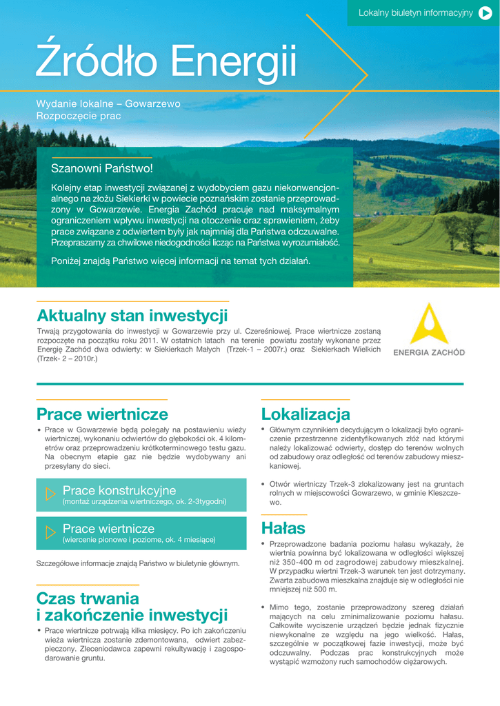 Lokalny biuletyn informacyjny Źródło Energii Wydanie lokalne – Gowarzewo Rozpoczęcie prac Szanowni Państwo! Kolejny etap inwestycji związanej z wydobyciem gazu niekonwencjonalnego na złożu Siekierki w powiecie poznańskim zostanie przeprowadzony w Gowarzewie. Energia Zachód pracuje nad maksymalnym ograniczeniem wpływu inwestycji na otoczenie oraz sprawieniem, żeby prace związane z odwiertem były jak najmniej dla Państwa odczuwalne. Przepraszamy za chwilowe niedogodności licząc na Państwa wyrozumiałość. Poniżej znajdą Państwo więcej informacji na temat tych działań. Aktualny stan inwestycji Trwają przygotowania do inwestycji w Gowarzewie przy ul. Czereśniowej. Prace wiertnicze zostaną rozpoczęte na początku roku 2011. W ostatnich latach na terenie powiatu zostały wykonane przez Energię Zachód dwa odwierty: w Siekierkach Małych (Trzek-1 – 2007r.) oraz Siekierkach Wielkich (Trzek- 2 – 2010r.) Prace wiertnicze Prace w Gowarzewie będą polegały na postawieniu wieży wiertniczej, wykonaniu odwiertów do głębokości ok. 4 kilometrów oraz przeprowadzeniu krótkoterminowego testu gazu. Na obecnym etapie gaz nie będzie wydobywany ani przesyłany do sieci. Prace konstrukcyjne (montaż urządzenia wiertniczego, ok. 2-3tygodni) Prace wiertnicze (wiercenie pionowe i poziome, ok. 4 miesiące) Szczegółowe informacje znajdą Państwo w biuletynie głównym. Czas trwania i zakończenie inwestycji Prace wiertnicze potrwają kilka miesięcy. Po ich zakończeniu wieża wiertnicza zostanie zdemontowana, odwiert zabezpieczony. Zleceniodawca zapewni rekultywację i zagospodarowanie gruntu. Lokalizacja Głównym czynnikiem decydującym o lokalizacji było ograniczenie przestrzenne zidentyfikowanych złóż nad którymi należy lokalizować odwierty, dostęp do terenów wolnych od zabudowy oraz odległość od terenów zabudowy mieszkaniowej. Otwór wiertniczy Trzek-3 zlokalizowany jest na gruntach rolnych w miejscowości Gowarzewo, w gminie Kleszczewo. Hałas Przeprowadzone badania poziomu hałasu wykazały, że wiertnia powinna być lokalizowana w odległości większej niż 350-400 m od zagrodowej zabudowy mieszkalnej. W przypadku wiertni Trzek-3 warunek ten jest dotrzymany. Zwarta zabudowa mieszkalna znajduje się w odległości nie mniejszej niż 500 m. Mimo tego, zostanie przeprowadzony szereg działań mających na celu zminimalizowanie poziomu hałasu. Całkowite wyciszenie urządzeń będzie jednak fizycznie niewykonalne ze względu na jego wielkość. Hałas, szczególnie w początkowej fazie inwestycji, może być odczuwalny. Podczas prac konstrukcyjnych może wystąpić wzmożony ruch samochodów ciężarowych. Lokalny biuletyn informacyjny Spągowiec czerwony Kolejny etap Szczelinowanie Zabieg techniczny polegający na wywołaniu w odwiercie wysokiego ciśnienia w celu rozwarcia istniejących lub powstawania nowych szczelin. Do otworu pompuje się pod dużym ciśnieniem wodę zmieszaną z piaskiem. Szczelinowanie wykonywane jest w celu zwiększenia przypływu gazu. Więcej informacji dotyczących tego etapu otrzymają Państwo w kolejnym numerze biuletynu. Wieża wiertnicza Ważne tematy Bezpieczeństwo i środowisko naturalne Odpady Wszystkie prace prowadzone przy otworze Trzek-3 będą prowadzone zgodnie z zasadami ochrony zdrowia, bezpieczeństwa i ochrony środowiska. Zasadniczym kryterium wyboru podwykonawców były doskonale rozwinięte przez firmy systemy bezpieczeństwa, ochrony zdrowia i środowiska. Woda Dla potrzeb wiertni wymagana jest niewielka ilość wody, średnio ok. 30 m3/d, która używana będzie do celów pitnych o ile będzie odpowiedniej jakości, socjalno - bytowych załogi oraz dla potrzeb technologicznych wiercenia. Planuje się wykonanie przyłączenia do lokalnej sieci wodociągowej. Wszystkie odpady zarówno socjalne jak i przemysłowe będą gromadzone w szczelnych zbiornikach i odbierane przez specjalistyczną firmę w celach utylizacji. Odpady nie będą gromadzone na terenie wiertni. Oświetlenie Prace na wiertni ze względów bezpieczeństwa i specyfiki projektu są prowadzone w trybie 24 godzinnym. Zgodnie z normami BHP praca w nocy wymaga odpowiedniego oświetlenia. Budynki Pozwolenie na przeprowadzenie wiercenia zostało zatwierdzone przez Urząd Górniczy, gwarantując bezpieczeństwo budynków i ludzi w nich mieszkających. Słownik Korzyści dla gminy W przypadku uruchomienia produkcji opłaty eksplatacyjne zasilą gminny budżet. Obecnie jest to 28 tysięcy PLN za 10mln m3 wydobytego gazu. Zasoby złoża Siekierki szacowane są na ok. 10 mld m3. Wieża wiertnicza (maszt wiertniczy) - jest to wieża zbudowana z metalowych kratownic, o wysokości do kilkudziesięciu metrów, służąca do wprowadzania przewodu wiertniczego do otworu wiertniczego. Energia Zachód finansuje przebudowę infrastruktury wodociągowej w Tulcach, która pozwoli zabezpieczyć dostawy wody dla mieszkańców Gowarzewa. Tight gas (inaczej gaz zamknięty) - rodzaj gazu ziemnego występuje w skałach o niskiej przepuszczalności. Tight gas w złożu Siekierki znajduje się w piaskowcu - spągowcu czerwonym, który dzięki porom skalnym jest dobrymi zbiornikiem dla złóż gazu ziemnego. Do wydobycia tego gazu niezbędne są zaawansowane technologie. Infolinia dostępna jest od poniedziałku do piątku, w godzinach od 8.00 do 18.00. Koszt połączenia jest zgodny z cennikiem operatora.
