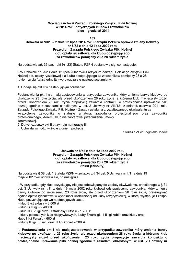 Wyciąg z uchwał Zarządu Polskiego Związku Piłki Nożnej w 2014 roku dotyczących klubów i zawodników lipiec – grudzień 2014 132 Uchwała nr VII/132 z dnia 22 lipca 2014 roku Zarządu PZPN w sprawie zmiany Uchwały nr 8/52 z dnia 12 lipca 2002 roku Prezydium Zarządu Polskiego Związku Piłki Nożnej dot. opłaty ryczałtowej dla klubu odstępującego za zawodników pomiędzy 23 a 28 rokiem życia Na podstawie art. 36 par.1 pkt 9) i 23) Statutu PZPN postanawia się, co następuje: I. W Uchwale nr 8/52 z dnia 12 lipca 2002 roku Prezydium Zarządu Polskiego Związku Piłki Nożnej dot. opłaty ryczałtowej dla klubu odstępującego za zawodników pomiędzy 23 a 28 rokiem życia (tekst jednolity) wprowadza się następujące zmiany: 1. Dodaje się pkt II w następującym brzmieniu: Postanowienia pkt I nie mają zastosowania w przypadku zawodnika który zmienia barwy klubowe po ukończeniu 23 roku życia, ale przed ukończeniem 28 roku życia, a któremu klub macierzysty złożył przed ukończeniem 23 roku życia propozycję zawarcia kontraktu o profesjonalne uprawianie piłki nożnej zgodnie z zasadami określonymi w ust. 2 Uchwały nr VIII/121 z dnia 16 czerwca 2011 roku Zarządu Polskiego Związku Piłki Nożnej - Zasady ustalania zryczałtowanego ekwiwalentu za wyszkolenie zawodnika o statusie amatora, zawodnika profesjonalnego oraz zawodnika profesjonalnego, któremu klub nie zaoferował przedłużenia umowy kontraktowej. 2. Dotychczasowy pkt II otrzymuje numerację III. II. Uchwała wchodzi w życie z dniem podjęcia. Prezes PZPN Zbigniew Boniek Uchwała nr 8/52 z dnia 12 lipca 2002 roku Prezydium Zarządu Polskiego Związku Piłki Nożnej dot. opłaty ryczałtowej dla klubu odstępującego za zawodników pomiędzy 23 a 28 rokiem życia (tekst jednolity) Na podstawie § 38 ust. 1 Statutu PZPN w związku z § 34 ust. 5 Uchwały nr II/11 z dnia 19 maja 2002 roku uchwala się, co następuje: I. W przypadku gdy klub pozyskujący nie jest zobowiązany do zapłaty ekwiwalentu, określonego w § 34 ust. 3 Uchwały nr II/11 z dnia 19 maja 2002 roku klubowi odstępującemu zawodnika, który zmienia barwy klubowe po ukończeniu 23 roku życia, ale przed ukończeniem 28 roku życia, przysługiwać będzie opłata ryczałtowa w wysokości uzależnionej od klasy rozgrywkowej, w której występuje I zespół klubu pozyskującego wg następujących zasad: - klub Ekstraklasy – 3.000 zł - klub I i II ligi - 2.400 zł - klub III i IV ligi oraz Ekstraklasy Futsalu - 1.200 zł - kluby pozostałych klas rozgrywkowych, kluby Ekstraligi, I i II ligi kobiet oraz kluby oraz kluby I ligi Fulsalu - 600 zł - kluby II ligi Futsalu oraz III ligi kobiet – 300 zł II. Postanowienia pkt I nie mają zastosowania w przypadku zawodnika który zmienia barwy klubowe po ukończeniu 23 roku życia, ale przed ukończeniem 28 roku życia, a któremu klub macierzysty złożył przed ukończeniem 23 roku życia propozycję zawarcia kontraktu o profesjonalne uprawianie piłki nożnej zgodnie z zasadami określonymi w ust. 2 Uchwały nr VIII/121 z dnia 16 czerwca 2011 roku Zarządu Polskiego Związku Piłki Nożnej - Zasady ustalania zryczałtowanego ekwiwalentu za wyszkolenie zawodnika o statusie amatora, zawodnika profesjonalnego oraz zawodnika profesjonalnego, któremu klub nie zaoferował przedłużenia umowy kontraktowej. III. Uchwała wchodzi w życie z dniem podjęcia. Prezes PZPN 133 Uchwała nr VII/133 z dnia 22 lipca 2014 roku Zarządu PZPN w sprawie zmiany Uchwały nr III/39 z dnia 14 lipca 2006 roku Zarządu PZPN w sprawie statusu zawodników występujących w polskich klubach piłkarskich oraz zasad zmian przynależności klubowej Na podstawie art. 36 par.1 pkt 9) i 23) Statutu PZPN postanawia się, co następuje: I. W Uchwale nr III/39 z dnia 14 lipca 2006 roku Zarządu PZPN w sprawie statusu zawodników występujących w polskich klubach piłkarskich oraz zasad zmian przynależności klubowej wprowadza się następujące zmiany: 1. § 34 ust. 3 pkt 1 otrzymuje nowe następujące brzmienie: który nie ukończył 23 roku życia, bez względu na jego status, z zastrzeżeniem postanowień pkt 2. 2. § 34 ust. 3 pkt 2 otrzymuje nowe następujące brzmienie: który zmienia barwy klubowe po ukończeniu 23 roku życia, ale przed ukończeniem 28 roku życia i któremu klub macierzysty złożył przed ukończeniem 23 roku życia propozycję zawarcia kontraktu o profesjonalne uprawianie piłki nożnej zgodnie z zasadami określonymi w ust. 2 Uchwały nr VIII/121 z dnia 16 czerwca 2011 roku Zarządu Polskiego Związku Piłki Nożnej - Zasady ustalania zryczałtowanego ekwiwalentu za wyszkolenie zawodnika o statusie amatora, zawodnika profesjonalnego oraz zawodnika profesjonalnego, któremu klub nie zaoferował przedłużenia umowy kontraktowej. 3. Dotychczasowy § 34 ust. 3 pkt 2 otrzymuje numerację § 34 ust. 3 pkt 3 4. § 34 ust. 4 pkt 1 otrzymuje nowe następujące brzmienie: który zmienia barwy klubowe po ukończeniu 23 roku życia po wygaśnięciu kontraktu z upływem jego terminu, z zastrzeżeniem postanowień ust 3 pkt 2 II Uchwała wchodzi w życie z dniem podjęcia. Prezes PZPN Zbigniew Boniek 139 Uchwała nr VIII/139 z dnia 13 sierpnia 2014 roku Zarządu Polskiego Związku Piłki Nożnej w sprawie określenia uprawnień trenerskich koniecznych do prowadzenia zespołów I ligi kobiet w sezonie 2014/2015 Na podstawie art. 36 § 1 pkt 9) Statutu PZPN, postanawia się, co następuje: I. Ustala się, iż w sezonie 2014/2015 szkoleniowiec prowadzący zespół I ligi kobiet musi posiadać co najmniej licencję trenera UEFA B. II. Niniejsza Uchwała wchodzi w życie z dniem podjęcia. Prezes PZPN Zbigniew Boniek 140 Uchwała nr VIII/140 z dnia 13 sierpnia 2014 roku Zarządu Polskiego Związku Piłki Nożnej w sprawie zmian w Uchwale nr III/39 z dnia 14 lipca 2006 roku Zarządu PZPN dot. statusu zawodników występujących w klubach piłkarskich oraz zasad zmian przynależności klubowej Na podstawie art. 36 