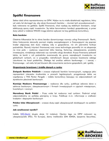 Spółki finansowe Sektor dość silnie reprezentowany na GPW. Wpływ na to miała działalność regulatora, który od wielu lat domagał się, aby akcje kluczowych banków – również tych prywatyzowanych były notowane na giełdzie. Spółki finansowe, choć wydają się stabilnym biznesem, wciąż elektryzują sporą część inwestorów. Są także barometrem kondycji gospodarczej, a przez duży udział w indeksie WIG20 mogą istotnie wpływać na losy giełdowej koniunktury. Rola banków Ostatnie kilkanaście lat to okres bardzo dynamicznego rozwoju usług finansowych. Banki, które historycznie stanowiły pomost między oszczędzającymi a finansującymi się poprzez kredyt odgrywają dziś dużo większą rolę w gospodarce, niż ich pierwotna funkcja pośrednika. Rozwój inżynierii finansowej oraz nowe technologie pozwoliły im na ekspansje na inne pola – wystarczy wspomnieć tylko leasing, factoring, ubezpieczenia, produkty inwestycyjne, windykację należności czy rozmaite usługi doradcze. Kryzys finansowy pokazał także, że banki z roli pośrednika awansowały do grona największych inwestorów na globalnych rynkach, co w przypadku nietrafionych decyzji oznacza kosztowne zabiegi ratunkowe na koszt podatnika. Dlatego też analiza sektora bankowego – i szerzej – finansowego - od wielu lat jest kluczem dla zrozumienia zarówno gospodarki, jak i giełdy. Organizacje branżowe i źródła danych o rynku Związek Banków Polskich – zrzesza większość banków komercyjnych, występuje jako reprezentant interesów środowiska w pracach legislacyjnych, przygotowuje także we współpracy z TNS Pentor Pengab – indeks koniunktury bazujący na odpowiedziach od dyrektorów placówek bankowych. Komisja Nadzoru Finansowego – nadzorca dla rynku, publikuje zebrane dane o sektorze bankowym, ubezpieczeniowym i firmach inwestycyjnych w ujęciach miesięcznym, kwartalnym i rocznym Narodowy Bank Polski – Przez wiele lat nadzorca nad rynkiem. Podmiot wciąż odpowiedzialny za politykę pieniężną w kraju. Publikuje m.in. informacje o wielkości kredytów i depozytów bankowych Polska Izba Ubezpieczeń – zrzesza dużą część ubezpieczycieli działających na polskim rynku Jak analizować wyniki? Indeks WIG-Banki skupia akcje 14 instytucji. Oprócz tego na GPW notowani są ubezpieczyciele (PZU, TU Europa), domy maklerskie (DM IDMSA, Ipopema Securities), towarzystwa funduszy inwestycyjnych (Quercus, Idea), a także coraz liczniej reprezentowana branża obrotu wierzytelnościami. Poszczególne segmenty sektora finansów wiele różni. Punktem wyjścia jest więc dla nas segment bankowy, historycznie najdłużej obecny na GPW. Zazwyczaj banki w swoich grupach kapitałowych mają też zarówno TFI, jak i brokerów. Kluczowa dla nich działalność podstawowa – a zatem usługi bankowości komercyjnej. To ta masowa działalność stanowi o sile tych instytucji i pozwala generować gigantyczne w porównaniu z innym i branżami wyniki finansowe. W 2011 r. wszystkie banki zarobiły rekordowe 15,7 mld zł. Warto jednak pamiętać, że aktywa tych instytucji to niemal 1,3 bln zł. W tym kontekście łatwiej zrozumieć, skąd w bankach tak wysokie zyski. W przypadku firm finansowych nie należy jednak zachwycać się wysokimi wynikami netto i odpornością na błędy popełniane przez zachodnie instytucje. Kluczem do zrozumienia bankowego biznesu jest zdolność banków do finansowania akcji kredytowej depozytami. W 2011 r. niedobór depozytów względem kredytów w całej branży sięgnął 66 mld zł. Wypracowywane zyski tylko w niewielkiej części są w stanie „zasypać” tę lukę. Część instytucji których strategicznym inwestorem jest zagraniczna grupa do tej pory pozyskiwała środki na rozwój od centrali. W kontekście światowego kryzysu na rynkach finansowych dalsze finansowanie stoi jednak pod znakiem zapytania. Inną metodą jest zdobywanie depozytów od gospodarstw domowych i firm. To jednak wymaga oferowania coraz wyższego oprocentowania, co prowadzi do zmniejszenia zysku. Inną metodą jest finansowanie się na polskim rynku międzybankowym, ale to także nie jest proste w razie spadku zaufania do sektora. Ostatnim sposobem jest sięganie banków do emisji akcji lub obligacji (w tym obligacji podporządkowanych, które z racji na specyficzne warunki emisje mogą powiększyć kapitały własne spółek). Banki, które nie mają problemu z domknięciem bilansu w razie zawirowań na rynku uznawane są z reguły za bardziej bezpieczne. W przypadku Polski cieniem na całym sektorze kładzie się także niedopasowanie krótkich okresów lokat (zwykle kilkumiesięcznych) do udzielanych na długi czas kredytów. Innym zmartwieniem analityków i inwestorów jest utrzymująca się duża liczba mieszkaniowych kredytów walutowych, pochodzących jeszcze z boomu lat 2007-2008. Osłabienie złotego względem franka i euro oznacza automatyczny wzrost wartości realnej takich kredytów i jednocześnie grozi tym, że część klientów nie da już rady spłacać rat. Na innego rodzaju zagrożenie wystawiają się banki zaangażowane mocno w finansowanie przedsiębiorstw. Kłopoty dużych kredytobiorców mogą zachwiać wynikami nawet dużej grupy bankowej. Widząc możliwą niewypłacalność banki zwykle wpierw tworzą rezerwy na złe kredyty które pomniejszają zysk. W miarę poprawy sytuacji rezerwy mogą być rozwiązywane. W analogiczny sposób działa sektor ubezpieczeniowy, na GPW reprezentowany silnie przez lidera branży – PZU. Tam zamiast depozytów mówimy o przypisanej składce (czyli wpłatach klientów). W dużej części są one wykorzystywane na odszkodowania wypłacane posiadaczom polis. Różnica stanowi tzw. wynik techniczny, do którego dochodzą dochody z inwestowania niewypłaconych środków. Tak dochodzi się do wyniku netto towarzystwa ubezpieczeniowego. Nieco inaczej wygląda biznes obrotu wierzytelnościami. Firmy te skupują z rynku (często od