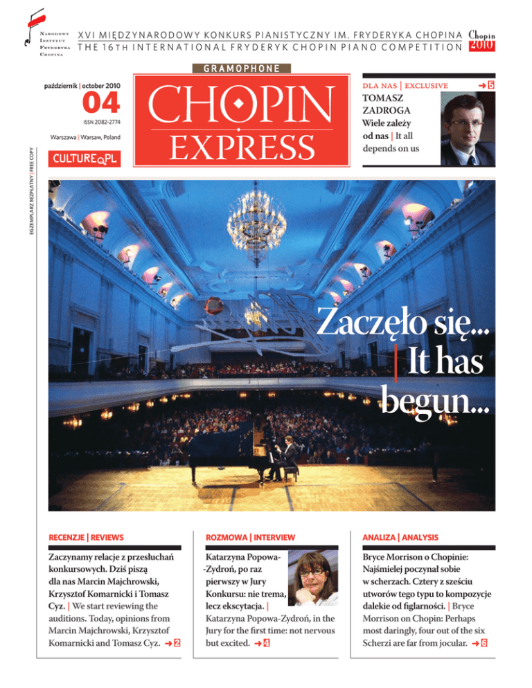 X V I M i ę d z y n a r o d o w y Ko n k u r s P i a n i s t yc z n y im . F r y d e r y k a C h o pi n a t h e 1 6 t h I n t e r n a t i o n a l F r y d e r y k C h o pi n P i a n o C o mp e t i t i o n dla nas | exclusive tomasz zadroga Wiele zależy od nas | It all depends on us 04 październik | october 2010 issn 2082-2774 egzemplarz bezpłatny | free copy Warszawa | Warsaw, Poland >5 Zaczęło się... | It has begun... recenzje | reviews Zaczynamy relacje z przesłuchań konkursowych. Dziś piszą dla nas Marcin Majchrowski, Krzysztof Komarnicki i Tomasz Cyz. | We start reviewing the auditions. Today, opinions from Marcin Majchrowski, Krzysztof Komarnicki and Tomasz Cyz. > 2 rozmowa | interview Katarzyna Popowa-Zydroń, po raz pierwszy w Jury Konkursu: nie trema, lecz ekscytacja. | Katarzyna Popowa-Zydroń, in the Jury for the first time: not nervous but excited. > 4 analiza | analysis Bryce Morrison o Chopinie: Najśmielej poczynał sobie w scherzach. Cztery z sześciu utworów tego typu to kompozycje dalekie od figlarności. | Bryce Morrison on Chopin: Perhaps most daringly, four out of the six Scherzi are far from jocular. > 6 chopin express recenzje | reviews I etap – kolejność uczestników | 1st stage auditions order środa, 6 października | Wednesday, 6 October ČČ 10.00, Mamikon Nakhapetov, Georgia ČČ 10.30, Julian Zhi Chao Jia, China ČČ 11.00, Kaoru Jitsukawa, Japan ČČ 11.30, Denis Evstuhin, Russia ČČ 12.00 – 12.30 PRZERWA | INTERMISSION ČČ 12.30, Sung-Jae Kim, Republic of Korea ČČ 13.00, Lusine Khachatryan, Armenia ff 13.30, Eric Zuber, USA ČČ 14.00, Shota Miyazaki, Japan ČČ 17.00, Madoka Fukami, Japan ČČ 17.30, Mei-Ting Sun, USA Miroslav Kultyshev, Rosja. Zagrał wczoraj jako piąty | Miroslav Kultyshev, Russia. He was the fifth candidate to perform yesterday Nerwowy początek ff 18.00, Jacek Kortus, Poland ČČ 18.30, Vladimir Matusevich, Russia ČČ 19.00 – 19.30 PRZERWA | INTERMISSION ČČ 19.30, Ilya Rashkovskiy, Russia ff 20.00, Junna Iwasaki, Japan ČČ 20.30, Yulianna Avdeeva, Russia ff 21.00, Marcin Koziak, Poland technologia | technology chopin express P oranne przesłuchania pierwszego dnia można określić przede wszystkim jako nerwowe. W grze młodych pianistów czuć onieśmielenie, spięcie, jakąś mechaniczność; skupiają się głównie na tym, by nie zgubić żadnej nuty, ze szkodą dla tzw. wrażenia artystycznego. Z ósemki występujących zapisuję na razie trzy nazwiska: Rosjanina Miroslava Kultysheva, Hiszpanki Marianny Prjevalskayej i Kanadyjczyka Leonarda Gilberta (w tej kolejności). Kultyshev błysnął dojrzałością i subtelnością, zwłaszcza w Balladzie f-moll; Prjevalskaya –pewnością i siłą; Gilbert – talentem narracyjnym (w tej samej balladzie) i zrozumieniem dramaturgii formy. Nelson Freire powiedział w wywiadzie: „Trzeba umiejętnie odmierzać przerwy między nutami”. Właśnie… Głośnym, niestety, bohaterem, jest publiczność, która na razie głosuje kaszlem. Mam propozycję: kaszlmy w przerwach między występami kolejnych uczestników, nie między utworami. Pomożecie? h Opening jitters T he morning sessions of the first day are best described as jittery. The young pianists sounded tentative, tense, and a little mechanical. They focused mainly on not missing a single note to the detriment of artistic expression. Out of the eight performers, for now, I wrote down three names: Russian Miroslav Kultyshev, Spain’s Marianna Prjevalskaya and Canadian Leonard Gilbert (in that order). Kultyshev shone with maturity and subtlety, especially in Ballade No. 4 in F minor, Prjevalskaya showed confidence and force, and Gilbert has narrative talent and understanding of the form’s dramaturgy in the same Ballade. As Nelson Freire said in his interview, “You have to measure the time between notes skilfully”. Precisely… The audience is an unfortunately vociferous performer, voting with coughs. I have a suggestion: let’s cough between performers, not between pieces. Will you help? h — Tomasz Cyz, www.dwutygodnik.com Oscar Wilde | Gdy gram Chopina, czuję się, jakbym żałował za grzechy, których nie popełniłem, i opłakiwał cudze tragedie. | After playing Chopin, I feel as if I had been weeping over sins that I had never committed, and mourning over tragedies that were not my own. 2 | XVI Międzynarodowy Konkurs Pianistyczny im. Fryderyka Chopina | dzień czwarty | 4 października 2010 r. chopin express Muzyczne puzzle M Daniil Trifonov, Rosja | Russia Piano i forte J uż program I etapu odkrywa wszystkie aspekty fortepianowego kunsztu. Etiudy – biegłość techniczną, nokturny – muzykalność i wrażliwość na barwę, a ballady, scherza, Fantazja f-moll (albo Barkarola) – zrozumienie wielkiej, romantycznej formy. W popołudniowej turze wczorajszych przesłuchań żaden z pianistów nie sprostał tym wszystkim wymaganiom. Daniilowi Trifonowowi należy się uznanie za odwagę – zagrał na fortepianie firmy Fazioli, po raz pierwszy dostępnym dla uczestników Konkursu Chopinowskiego. Podziwu godne w jego grze było piano, ale zabrakło prawdziwego forte. W grze Australijczyka Jaysona Gillhama – przeciwnie; jego gra była efektowna, pełna potęgi i siły. Najbardziej przekonująco wypadł w Etiudzie a-moll op. 10 nr 2, ale już Scherzo E-dur wykonał zbyt szybko, nerwowo i forsownie. Urocza i zdolna 17-latka Anke Pan z Niemiec bardzo dobrze zagrała dwie z wybranych etiud, ale uduchowiona Etiuda cis-moll op. 25 nr 7 (wykonana zamiast nokturnu) – okazała się dla młodziutkiej pianistki zbyt trudna. Cóż, Chopin nie pisał łatwych utworów. h iałem poczucie, że występujący wczoraj pianiści byli w większości dostawcami dźwięków, z których słuchacz miał sam poskładać arcydzieła Chopina, niczym puzzle. Na zebranych w Filharmonii Narodowej wrażenie zrobił Miroslav Kultyshev, jednak ja, mając otwarte nuty, dostrzegłem, że gra bez poszanowania tekstu kompozy