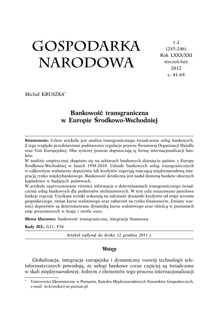 GOSPODARKA NARODOWA 1-2 (245-246) Rok LXXX/XXI styczeń-luty 2012 s. 41-64 Michał KRUSZKA* Bankowość transgraniczna w Europie Środkowo-Wschodniej Streszczenie: Celem artykułu jest analiza transgranicznego świadczenia usług bankowych. Z tego względu przedstawiono podstawowe regulacje prawne Światowej Organizacji Handlu oraz Unii Europejskiej. Oba systemy prawne dopuszczają tę formę internacjonalizacji banków. W analizie empirycznej skupiono się na sektorach bankowych dziesięciu państw z Europy Środkowo-Wschodniej w latach 1998-2010. Udziały bankowych usług transgranicznych w całkowitym wolumenie depozytów lub kredytów sugerują znaczącą międzynarodową integrację rynku międzybankowego. Bankowość detaliczna jest nadal domeną banków obecnych kapitałowo w badanych państwach. W artykule zaprezentowano również informacje o determinantach transgranicznego świadczenia usług bankowych dla podmiotów niefinansowych. W tym celu oszacowano panelowe funkcje regresji. Uzyskane wyniki wskazują na zależność dynamiki kredytów od stopy wzrostu gospodarczego, zmian kursu walutowego oraz zaburzeń na rynku finansowym. Zmiany wartości depozytów są determinowane dynamiką kursu walutowego oraz różnicą w poziomach stóp procentowych w kraju i strefie euro. Słowa kluczowe: bankowość transgraniczna, integracja finansowa Kody JEL: G21, F36 Artykuł wpłynął do druku 12 grudnia 2011 r. Wstęp Globalizacja, integracja europejska i dynamiczny rozwój technologii teleinformatycznych powodują, że usługi bankowe coraz częściej są świadczone w skali międzynarodowej. Jednym z elementów tego procesu internacjonalizacji * Uniwersytet Ekonomiczny w Poznaniu, Katedra Międzynarodowych Stosunków Gospodarczych, e-mail: [email protected] 42 GOSPODARKA NARODOWA Nr 1-2/2012 jest bankowość transgraniczna, tj. oferowanie usług przez bank zagraniczny bez kapitałowego zaangażowania w kraju usługobiorcy. W niniejszej pracy określono udział usług transgranicznych w operacjach bankowych realizowanych w Europie Środkowo-Wschodniej. Przeprowadzono także analizę ekonometryczną nakierowaną na wskazanie podstawowych determinant zmian wolumenu usług bankowych dostarczanych przez podmioty działające bez uprzedniej zagranicznej inwestycji bezpośredniej. Prawne podstawy bankowości transgranicznej Regulacje Światowej Organizacji Handlu Globalnymi regulacjami dotyczącymi międzynarodowego świadczenia usług, w tym także usług finansowych, są przepisy ustanowione przez Światową Organizację Handlu (World Trade Organization – WTO). Ten podmiot prawa międzynarodowego został powołany na podstawie Porozumienia WTO (WTO Agreement)1, które weszło w życie 1 stycznia 1995 r. Porozumienie WTO, oprócz umowy założycielskiej, zawiera cztery załączniki. Wśród nich znajduje się również Układ ogólny w sprawie handlu usługami (GATS)2. Załączniki do Porozumienia WTO są obligatoryjne dla członków Światowej Organizacji Handlu3. Odstępstwa od tej reguły są nieliczne i dokładnie wymienione w tekście każdego aneksu. Od momentu wejścia w życie GATS, tj. od 1 stycznia 1995 r., obowiązują uzgodnione przez społeczność światową powszechnie wiążące regulacje dotyczące handlu usługami. Oznacza to, że każdy członek WTO (według stanu z czerwca 2011 r. jest ich 153) zobowiązany jest do ich przestrzegania. Kluczowe znaczenie dla GATS ma określenie jego przedmiotowego zastosowania. GATS nie definiuje terminu „usługa”, pozostawiając to zagadnienie w sferze zainteresowania ekonomistów akademickich. Zakres obowiązywania GATS jest dookreślony w bardzo specyficzny sposób, mianowicie na mocy art. I ust. 1 i 2 stwierdza się, że GATS odnosi się do międzynarodowego handlu usługami, który pojawia się wówczas, gdy usługa jest świadczona: 1) z terytorium jednego państwa na terytorium innego kraju; 2) na terytorium jednego członka WTO dla usługobiorcy z innego państwa; 3) przez obecność handlową na terytorium danego państwa członkowskiego usługodawcy pochodzącego z innego kraju należącego do WTO; 4) przez obecność zagranicznych osób fizycznych świadczących usługi na terytorium innego sygnatariusza GATS. 1 2 3 Pełna nazwa to Porozumienie ustanawiające Światową Organizację Handlu (WTO), sporządzone w Marrakeszu dnia 15 kwietnia 1994 r., Dz.U. z 1995 r. Nr 98, poz. 483. Polski przekład znajduje się w załączniku do Dz.U. z 1998 r. Nr 34, poz. 195. Przepisy przytaczane w dalszej części niniejszej pracy będą czerpane z tego źródła. Art. II ust. 2 Porozumienia WTO. Zob. także Blackhurst [1998]. 43 Michał Kruszka, Bankowość transgraniczna w Europie Środkowo-Wschodniej Poszczególne sposoby są bardzo często określane jako: 1) usługa transgraniczna; 2) konsumpcja za granicą; 3) obecność handlowa i 4) obecność osób fizycznych. Ich istotę ilustruje rysunek 1. W świetle regulacji GATS za konstytutywny dla międzynarodowego świadczenia usług należy uznać fakt, że konsument usługi i podmiot gospodarujący (w rozumieniu ostatecznego odbiorcy płatności) nie są rezydentami tego samego kraju. W przeciwnym wypadku przepisy WTO nie mają zastosowania. Powracając do norm GATS, zaznaczyć należy, że w przypadku usługi transgranicznej nie ma potrzeby przemieszczania się ani nabywcy, ani usługodawcy. Wystarczy ich kontakt za pomocą środków komunikacji pośredniej. Jeśli dzięki temu następuje zmiana stanu nabywcy, to mamy do czynienia z usługą w rozumieniu efektu działalności ekonomicznej. Przykładem może być założenie internetowego konta bankowego w zagranicznym banku czy porada inwestycyjna udzielona przez telefon [Claessens, 2006], [Wunsch-Vincent, 2006]. Rysunek 1 Sposoby świadczenia usług w handlu międzynarodowym w świetle GATS Granica Państwo A Państwo B GATS-1: usługa transgraniczna usługa Usługodawca z B Usługobiorca z A GATS-2: konsumpcja za granicą Usługobi