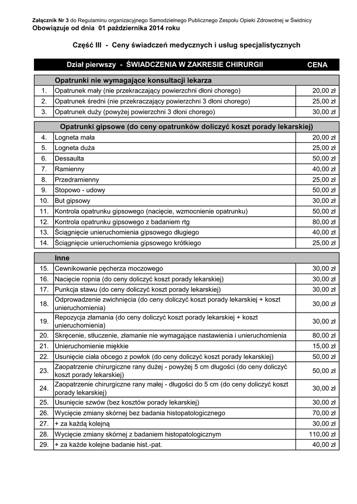 Załącznik Nr 3 do Regulaminu organizacyjnego Samodzielnego Publicznego Zespołu Opieki Zdrowotnej w Świdnicy Obowiązuje od dnia 01 października 2014 roku Część III - Ceny świadczeń medycznych i usług specjalistycznych Dział pierwszy - ŚWIADCZENIA W ZAKRESIE CHIRURGII CENA Opatrunki nie wymagające konsultacji lekarza 1. Opatrunek mały (nie przekraczający powierzchni dłoni chorego) 20,00 zł 2. Opatrunek średni (nie przekraczający powierzchni 3 dłoni chorego) 25,00 zł 3. Opatrunek duży (powyżej powierzchni 3 dłoni chorego) 30,00 zł Opatrunki gipsowe (do ceny opatrunków doliczyć koszt porady lekarskiej) 4. Logneta mała 20,00 zł 5. Logneta duża 25,00 zł 6. Dessaulta 50,00 zł 7. Ramienny 40,00 zł 8. Przedramienny 25,00 zł 9. Stopowo - udowy 50,00 zł 10. But gipsowy 30,00 zł 11. Kontrola opatrunku gipsowego (nacięcie, wzmocnienie opatrunku) 50,00 zł 12. Kontrola opatrunku gipsowego z badaniem rtg 80,00 zł 13. Ściągnięcie unieruchomienia gipsowego długiego 40,00 zł 14. Ściągnięcie unieruchomienia gipsowego krótkiego 25,00 zł Inne 15. Cewnikowanie pęcherza moczowego 30,00 zł 16. Nacięcie ropnia (do ceny doliczyć koszt porady lekarskiej) 30,00 zł 17. Punkcja stawu (do ceny doliczyć koszt porady lekarskiej) 30,00 zł Odprowadzenie zwichnięcia (do ceny doliczyć koszt porady lekarskiej + koszt unieruchomienia) Repozycja złamania (do ceny doliczyć koszt porady lekarskiej + koszt 19. unieruchomienia) 18. 30,00 zł 30,00 zł 20. Skręcenie, stłuczenie, złamanie nie wymagające nastawienia i unieruchomienia 80,00 zł 21. Unieruchomienie miękkie 15,00 zł 22. Usunięcie ciała obcego z powłok (do ceny doliczyć koszt porady lekarskiej) 50,00 zł Zaopatrzenie chirurgiczne rany dużej - powyżej 5 cm długości (do ceny doliczyć koszt porady lekarskiej) Zaopatrzenie chirurgiczne rany małej - długości do 5 cm (do ceny doliczyć koszt 24. porady lekarskiej) 23. 50,00 zł 30,00 zł 25. Usunięcie szwów (bez kosztów porady lekarskiej) 30,00 zł 26. Wycięcie zmiany skórnej bez badania histopatologicznego 70,00 zł 27. + za każdą kolejną 30,00 zł 28. Wycięcie zmiany skórnej z badaniem histopatologicznym 29. + za każde kolejne badanie hist.-pat. 110,00 zł 40,00 zł Załącznik Nr 3 do Regulaminu organizacyjnego Samodzielnego Publicznego Zespołu Opieki Zdrowotnej w Świdnicy Obowiązuje od dnia 01 października 2014 roku Dział pierwszy - ŚWIADCZENIA W ZAKRESIE CHIRURGII 30. Pobranie materiału na posiew 31. Pomiar cukru we krwi glukometrem Dział drugi - ŚWIADCZENIA W ZAKRESIE GINEKOLOGII CENA 10,00 zł 8,00 zł CENA 32. Abrazja ( 1 preparat ) 300,00 zł 33. Elektrokoagulacja 250,00 zł 34. Elektrokonizacja 350,00 zł 35. Kontrola po zabiegach elektrokoagulacji 50,00 zł 36. KTG 20,00 zł 37. Obdukcja (badanie ginegologiczne, zaświadczenie, dodatkowe badania - wymaz na obecność plemników) 120,00 zł 38. Pobranie czystości pochwy 30,00 zł 39. Pobranie rozmazu cytologicznego pierwszy raz 30,00 zł 40. Pobranie wymazu z pochwy na posiew bakteriologiczny 30,00 zł 41. Posiew na GO 30,00 zł 42. Posiew na TF(rzęsistek) i CANDIDA (grzyby) 30,00 zł 43. Przygotowanie do badania histopatologicznego 44. Punkcja cienkoigłowa sutka wraz z badaniem cytologicznym preparatu biopsyjnego 5,00 zł 140,00 zł 45. Zasypka (z kwasu bornego, z Pabiamidu ) 15,00 zł 46. Zdjęcie szwów brzuch 50,00 zł 47. Zdjęcie szwów krocze 50,00 zł 48. Zmiana opatrunku 40,00 zł 49. Poród rodzinny 50,00 zł 50. USG ciąży I trymestr 60,00 zł 51. USG ciąży II i III trymestr 60,00 zł 52. USG narządów rodnych EV 70,00 zł 53. USG sutka 60,00 zł 54. Badanie kolposkopowe 75,00 zł 55. Badanie kolposkopowe z pobraniem wycinków Dział trzeci - ŚWIADCZENIA W ZAKRESIE LARYNGOLOGII 56. Audiometria (tonalna lub inne) 235,00 zł CENA 30,00 zł 57. Badanie słuchu/czynności przedsionka - inne 200,00 zł 58. Ezofagoskopia 180,00 zł 59. Katateryzacja trąbki słuchowej 35,00 zł 60. Nacięcie ropnia okołomigdałkowego 70,00 zł 61. Płukanie ucha 50,00 zł 62. Podcięcie wędzidełka 60,00 zł 63. Próby błędnikowe 50,00 zł Załącznik Nr 3 do Regulaminu organizacyjnego Samodzielnego Publicznego Zespołu Opieki Zdrowotnej w Świdnicy Obowiązuje od dnia 01 października 2014 roku Dział trzeci - ŚWIADCZENIA W ZAKRESIE LARYNGOLOGII 64. Przedmuchanie trąbki słuchowej Politzera 65. Punkcja zatoki szczękowej CENA 15,00 zł 115,00 zł 66. Szycie chirurgiczne rany w zakresie twarzy 50,00 zł 67. Tamponada przednia nosa 75,00 zł 68. Toaleta ucha 25,00 zł 69. Tympanometria 40,00 zł 70. Usunięcie brodawki z jamy ustnej, gardła 100,00 zł 71. Usunięcie ciała obcego z ucha 60,00 zł 72. Usunięcie ciała obcego z gardła 60,00 zł 73. Usunięcie ciała obcego z krtani 80,00 zł 74. Usunięcie ciała obcego z nosa 60,00 zł 75. Usunięcie zmiany skórnej z zakresu głowy, szyi 100,00 zł 76. Videoendoskopia (krtani lub noso-gardła) 100,00 zł 77. Operacja migdałków bocznych i migdałka gardłowego w znieczuleniu ogólnym 1 900,00 zł 78. Operacja skrzywionej przegrody nosa w znieczuleniu miejscowym 2 000,00 zł 79. Operacja migdałka gardłowego w znieczuleniu miejscowym 1 000,00 zł 80. Operacja migdałków bocznych w znieczuleniu miejscowym 1 300,00 zł 81. Badanie BERA do 4 roku życia 714,00 zł 82. Badanie BERA powyżej 4 roku życia 969,00 zł 83. Znieczulenie do badań diagnostycznych dzieci 255,00 zł 84. Wycięcie polipa nosa w znieczuleniu miejscowym 85. Zamknięte nastawienie złamania nosa w znieczuleniu miejscowym 86. Wycięcie zmiany zatoki szczękowej z dostępu Caldwell Lu`ca 87. Opinia biegłego lekarza 88. Inne wycięcie lub zniszczenie zmiany lub tkanki krtani w znieczuleniu ogólnym Dział czwarty - ŚWIADCZENIA W ZAKRESIE OKULISTYKI 89. Angiografia fluoroscencyjna 1 600,00 zł 459,00 zł 2 800,00 zł 100,00 zł 1 900,00 zł CENA 170,00 zł 90. Kopia dokumentacji medycznej - wynik badania angiografii fluoroscencyjnej 30,00 zł 91. B