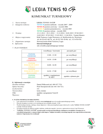 KOMUNIKAT TURNIEJOWY 1. 2. Nazwa turnieju: Kategoria wiekowa: 3. Terminy: 4. Miejsce rozgrywania: 5. Organizator turnieju: 6. Zgłoszenia: LEGIA TENNIS 10 CUP TENIS 10 poziom niebieski – rocznik 2007 - 2009 TENIS 10 poziom czerwony – rocznik 2006 TENIS 10 poziom pomarańczowy – rocznik 2005 TENIS 10 poziom zielony – rocznik 2004 22.11.2014 / 29.11.2014 / 13.12.2014 / 10.01.2015 / 07.02.2015 / 14.02.2015 / 07.03.2015 / 21.03.2015 / 11.04.2014 - Turniej Masters Klub Tenisowy Legia Warszawa, ul. Myśliwiecka 4a, Warszawa. tel. (0-22) 621-60-74; tel. (0-22) 745-10-90; tel.: 513-470-470; Stowarzyszenie Klub Tenisowy Legia [email protected] (do czwartku poprzedzającego turniej) 7. PLAN TURNIEJU: weryfikacja / losowanie początek gier POZIOM NIEBIESKI 13:00 - 13:30 po weryfikacji POZIOM CZERWONY 14:30 - 15:00 po weryfikacji POZIOM POMARAŃCZOWY (chłopcy) 16:00 - 16:30 po weryfikacji POZIOM POMARAŃCZOWY (dziewczynki) 16:30 - 17:00 po weryfikacji POZIOM ZIELONY zgodnie z regulaminem W-MZT zgodnie z planem gier 8. Informacje o turnieju: Dyrektor turnieju : Sędzia Naczelny: Liczba kortów: Nawierzchnia: Piłki: Wpisowe: Daniel Półkoszek (tel. 604 437 733) Piotr Sierzputowski (tel. 661 326 721) 4-6 korty ziemne zgodnie z programem Tenis10 60zł 9. WAŻNE INFORMACJE DODATKOWE: • Listy zgłoszonych zawodników na stronie www.tenislegia.pl oraz od czwartku poprzedzającego turniej. • Plan gier dostępny na stronie www.tenislegia.pl oraz od piątku od godz. 12:00. • Wyniki każdego turnieju, rankingi, relacje zdjęciowe i video poszczególnych grup wiekowych w cyklu "LEGIA TENNIS 10 CUP" w każdy wtorek po turnieju. • W każdym turnieju do zdobycia medale, dyplomy, atrakcyjne nagrody rzeczowe, zaproszenia na mecze Legii Warszawa. • "LEGIA TENNIS 10 CUP" przeprowadzi wewnętrzną klasyfikację rankingową zawodników startujących we wszystkich kategoriach w ramach całego cyklu imprez. Najlepsi zawodnicy otrzymają nagrody oraz zaproszenia na letni obóz tenisowy! Zapraszamy do rywalizacji!