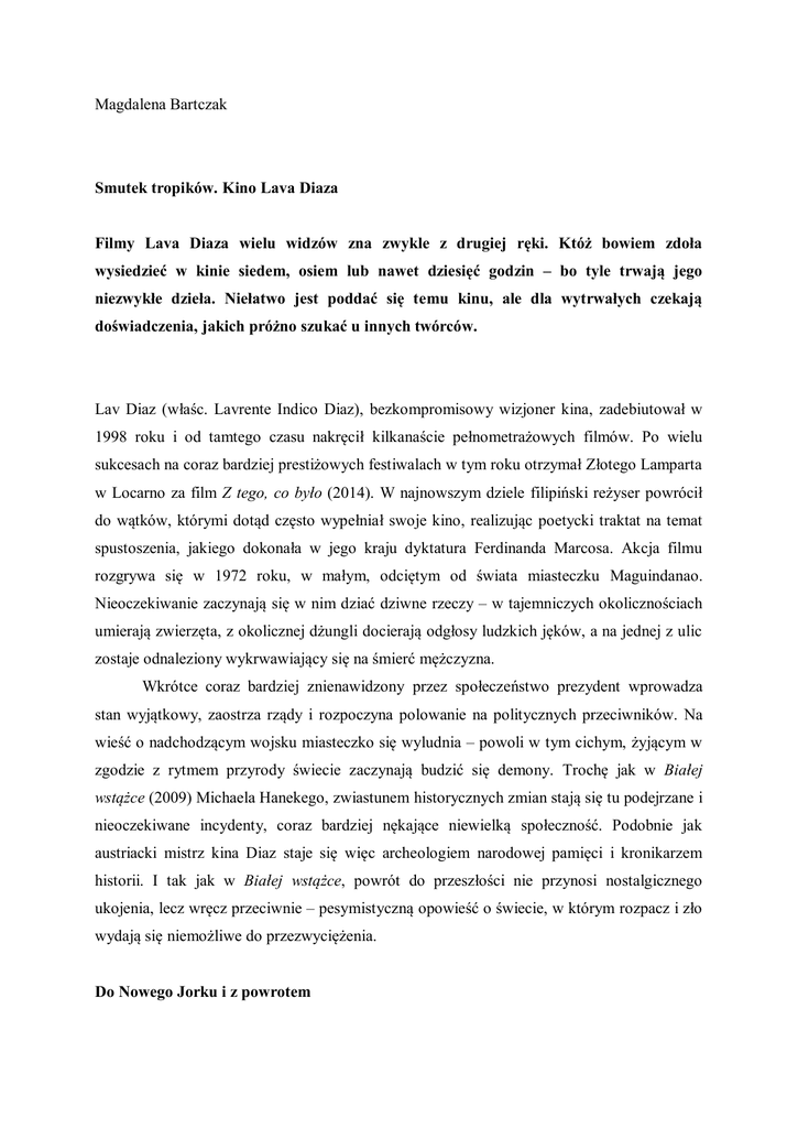 Magdalena Bartczak Smutek tropików. Kino Lava Diaza Filmy Lava Diaza wielu widzów zna zwykle z drugiej ręki. Któż bowiem zdoła wysiedzieć w kinie siedem, osiem lub nawet dziesięć godzin – bo tyle trwają jego niezwykłe dzieła. Niełatwo jest poddać się temu kinu, ale dla wytrwałych czekają doświadczenia, jakich próżno szukać u innych twórców. Lav Diaz (właśc. Lavrente Indico Diaz), bezkompromisowy wizjoner kina, zadebiutował w 1998 roku i od tamtego czasu nakręcił kilkanaście pełnometrażowych filmów. Po wielu sukcesach na coraz bardziej prestiżowych festiwalach w tym roku otrzymał Złotego Lamparta w Locarno za film Z tego, co było (2014). W najnowszym dziele filipiński reżyser powrócił do wątków, którymi dotąd często wypełniał swoje kino, realizując poetycki traktat na temat spustoszenia, jakiego dokonała w jego kraju dyktatura Ferdinanda Marcosa. Akcja filmu rozgrywa się w 1972 roku, w małym, odciętym od świata miasteczku Maguindanao. Nieoczekiwanie zaczynają się w nim dziać dziwne rzeczy – w tajemniczych okolicznościach umierają zwierzęta, z okolicznej dżungli docierają odgłosy ludzkich jęków, a na jednej z ulic zostaje odnaleziony wykrwawiający się na śmierć mężczyzna. Wkrótce coraz bardziej znienawidzony przez społeczeństwo prezydent wprowadza stan wyjątkowy, zaostrza rządy i rozpoczyna polowanie na politycznych przeciwników. Na wieść o nadchodzącym wojsku miasteczko się wyludnia – powoli w tym cichym, żyjącym w zgodzie z rytmem przyrody świecie zaczynają budzić się demony. Trochę jak w Białej wstążce (2009) Michaela Hanekego, zwiastunem historycznych zmian stają się tu podejrzane i nieoczekiwane incydenty, coraz bardziej nękające niewielką społeczność. Podobnie jak austriacki mistrz kina Diaz staje się więc archeologiem narodowej pamięci i kronikarzem historii. I tak jak w Białej wstążce, powrót do przeszłości nie przynosi nostalgicznego ukojenia, lecz wręcz przeciwnie – pesymistyczną opowieść o świecie, w którym rozpacz i zło wydają się niemożliwe do przezwyciężenia. Do Nowego Jorku i z powrotem Choć zapewne dla wielu widzów imponujący metraż nowego obrazu Diaza (liczącego 338 minut) może się wydawać wyzwaniem, na tle jego wcześniejszej twórczości nie jest to film szczególnie długi. Dla przykładu: jedno z jego najsłynniejszych dzieł, Melancholia (2008), trwa osiem godzin, wcześniejsza Śmierć na ziemi Encantos (2007) – dziewięć, a jego najdłuższa produkcja – Ewolucja filipińskiej rodziny (2004) – ma niemal jedenaście godzin. Między innymi za sprawą takich potężnych metraży nagrodzonego w Locarno reżysera postrzega się dziś jako jednego z najbardziej awangardowych autorów Azji Południowo-Wschodniej. Dla porządku warto jednak podkreślić, że jego początki w przemyśle filmowym zdecydowanie nie zapowiadały tak obranej artystycznej drogi. Urodzony w 1958 roku w Datu Paglas na wyspie Mindanao, Diaz pierwsze zawodowe kroki po ukończeniu Mowelfund Film Institute stawiał w telewizji, pisując scenariusze do filmów akcji i produkcji przeznaczonych dla dzieci. Wspomina to dziś jako ważny kurs reżyserskiego rzemiosła, który trudno byłoby mu odbyć gdzie indziej – panujący na Filipinach system produkcji jest bowiem niezwykle hermetyczny i kontrolowany przez kilka wielkich studiów, do których ciężko się przebić. Jednak największy wpływ na jego myślenie o kinie miał kilkuletni pobyt w Nowym Jorku, gdzie pojechał ze względów zarobkowych. Jak sam często przyznaje – ten wyjazd zmienił w jego życiu wszystko. Poznał tam ludzi, którzy pracowali nad filmami całkowicie niezależnie, wyposażeni tylko w lekką 16-milimetrową kamerę. Życie w amerykańskiej metropolii zaszczepiło w nim poczucie wolności i ważną dla artysty świadomość, że samodzielna praca poza studiem i rynkiem jest możliwa. Po powrocie do ojczyzny Diaz ponownie postanowił spróbować swoich sił w przemyśle filmowym – tym razem już na własną rękę. Dzięki pobytowi w Stanach Zjednoczonych filipiński autor zyskał dystans do własnej pracy, który pozwolił mu zacząć budować nie tylko ściśle skodyfikowany model swej twórczości, ale też samego funkcjonowania na planie. Jej cechą charakterystyczną stało się m.in. to, że nigdy nie pracuje chronologicznie. Choć zawsze stara się mieć ściśle określony scenariusz, to przyznaje, że kręcenie filmu przypomina mu malowanie obrazów, gdzie w tym samym czasie pojawia się wiele różnych wizji, pomysłów i emocji, za którymi spontanicznie się podąża i które później w naturalny sposób składają się w harmonijną całość. Portret artysty i motyw pracy nad filmem często zresztą powracają w jego dziełach – najbardziej znamiennym tego przykładem jest Wiek narodzin (2011), gdzie jednym z bohaterów jest Homer –doświadczający kryzysu twórczego reżyser, który ma problem z ukończeniem swojej produkcji. Statyczna opowieść Diaza o filmowcu pragnącym iść na przekór modom przypomina o tym, że tworzy on kino wierzące w modernistyczną koncepcję artysty oraz samego dzieła – filipiński mistrz statycznego kina, podobnie jak jego filmowe alter ego w Wieku narodzin, pozostaje bowiem autorem skoncentrowanym przede wszystkim na swojej twórczości i niedbającym o popularność wśród szerszej publiki. Kręcąc wielogodzinne, zanurzone w czerni i bieli poematy, zdaje się świadomie skazywać swoje kino na status uznanego, ale zarazem hermetycznego i nie zawsze zrozumianego – największą swą siłę znajdującego w bezkompromisowości. Lav Diaz, który swoją przygodę ze sztuką rozpoczynał m.in. od gry na gitarze i pisania poezji (czego zresztą do dziś nie porzucił), jest nie tylko reżyserem i scenarzystą, lecz także operatorem, montażystą oraz producentem swoich dzieł. Nie stanowi to rzadkości w niezależnym kinie filipińsk