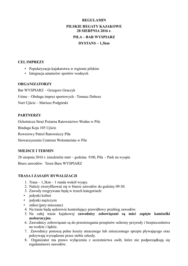 REGULAMIN PILSKIE REGATY KAJAKOWE 28 SIERPNIA 2016 r. PIŁA – BAR WYSPIARZ DYSTANS – 1,3km CEL IMPREZY • Popularyzacja kajakarstwa w regionie pilskim • Integracja amatorów sportów wodnych ORGANIZATORZY Bar WYSPIARZ – Grzegorz Graczyk f-time – Obsługa imprez sportowych - Tomasz Dobosz Nurt Ujście – Mariusz Podgórski PARTNERZY Ochotnicza Straż Pożarna Ratownictwo Wodne w Pile Binduga Keja 105 Ujście Rowerowy Patrol Ratowniczy Piła Stowarzyszenie Centrum Wolontariatu w Pile MIEJSCE I TERMIN 28 sierpnia 2016 r. (niedziela) start – godzina 9:00, Piła - Park na wyspie Biuro zawodów: Teren Baru WYSPIARZ TRASA I ZASADY RYWALIZACJI 1. 2. 3. • • • 4. 5. Trasa – 1,3km – 1 runda wokół wyspy. Należy zweryfikować się w biurze zawodów do godziny 09:30. Zawody rozgrywane będą w trzech kategoriach: jedynki kobiet jedynki mężczyzn mikst (pary mieszane) Na trasie będą sędziowie kontrolujący prawidłowy przebieg zawodów. Na całej trasie kajakowej zawodnicy zobowiązani są mieć zapięte kamizelki asekuracyjne. 6. Zawodnicy zobowiązani są do przestrzegania przepisów ochrony przyrody i bezpieczeństwa na wodzie i lądzie. 7. Zawodnicy ponoszą pełne koszty utraconego lub zniszczonego sprzętu pływającego oraz pokrywają wyrządzone przez siebie szkody. 8. Organizator ma prawo wyłączenia z uczestnictwa osób, które nie podporządkują się regulaminowi zawodów. 9. Należy zachowywać bezpieczny odstęp od innych uczestników zawodów w celu uniknięcia zderzenia. 10. Zawody będą rozgrywane w seriach po maksymalnie 3 kajaki. Linia startu wyznaczona bojami będzie jednocześnie linią mety. POMIAR CZASU Elektroniczny pomiar czasu zapewnia firma f-time. Linia mety będzie monitorowana przez kamerę. W razie wątpliwości komisja sędziowska będzie ustalać kolejność na mecie na podstawie odtworzenia matriału video. NAGRODY I INNE ŚWIADCZENIA DLA ZAWODNIKÓW 1. Zawodnicy w ramach wpisowego otrzymują piękny medal, gadżety od sponsorów, posiłek regeneracyjny, obsługę pomiaru czasu, zabezpieczenie trasy oraz opiekę medyczną. 2. Dla pierwszych trzech kobiet, mężczyzn oraz par mikst na mecie puchary i nagrody rzeczowe. SPRZĘT 1. Kajaki z wiosłami i kamizelkami asekuracyjnymi zapewnia organizator. Niezawodny sprzęt pływający dostarczają: Wyspiarz, Binduga Keja 105 Ujście, Nurt Ujście. 2. Uwaga! Dla zawodników, którzy zapiszą się i uiszczą opłatę startową organizatorzy udostępnią dzień przed zawodami sprzęt do treningu. WARUNKI UCZESTNICTWA 1. W celu weryfikacji każdy zawodnik musi zgłosić się osobiście w biurze zawodów, 2. Weryfikacja zawodników odbywać się będzie w Biurze zawodów w Pile na terenie Baru WYSPIARZ w niedzielę 28 sierpnia w godzinach 9:00 - 9:30 3. Do startu dopuszczeni zostaną zawodnicy, którzy w dniu zawodów ukończyli 18-ty rok życia i zweryfikowali swoje dane osobowe w biurze zawodów. Wyjątkiem jest start w mikstach osób, które ukończyły 15 rok życia – druga osoba w mikscie musi być pełnoletnim opiekunem. 4. Zawodnicy podpisują oświadczenie o starcie na własną odpowiedzialność. (Zawodnicy zobowiązani są do przedstawienia zaświadczenia lekarskiego o zdolności do udziału w zawodach sportowych lub do podpisania oświadczenia udziału na własną odpowiedzialność). 5. Każdy zawodnik musi wyrazić zgodę na przetwarzanie danych osobowych dla celów weryfikacji i umieszczenia w komunikacie końcowym, 6. Każdy zawodnik ma obowiązek zapoznania się z regulaminem zawodów i zobowiązany jest do jego przestrzegania, 7. Podpisanie oświadczenia jest równoznaczne z akceptacją regulaminu zawodów. ZGŁOSZENIA 1. Zgłoszeń można dokonywać: ◦ elektronicznie za pośrednictwem formularza zgłoszeniowego zamieszczonego na stronie internetowej www.f-time.pl w zakładce "ZAPISY" od dnia 22.08.2016 r. do 26.08.2016 r. do godziny 23:59, ◦ Osobiście zgłoszeń będzie można dokonać i uiścić opłatę startową w Biurze Zawodów w dniu zawodów do godziny 09:30, ◦ Za zgłoszenie uważa się wpłynięcie wypełnionego przez uczestnika formularza zgłoszenia oraz uiszczenie opłaty startowej w Barze WYSPIARZ. SPRAWY FINANSOWE 1. • • • Opłata startowa wynosi: 30zł od pary startującej w kategorii MIKST 15zł od osoby startującej w kategori jedynek Uwaga zniżka! Osoby startujące w MIKSCIE chcące wystartować także w jedynkach dopłacają za jedynki 10zł. 2. Opłatę należy uiścić w Barze WYSPIARZ w godzinach otwarcia (pon-pt 12-23; sob-nd 1224) 3. 4. 5. 6. Koszty związane z przeprowadzeniem imprezy pokrywają organizatorzy, Zawodnicy przyjeżdżają na koszt własny, Opłata raz uiszczona nie podlega zwrotowi, Organizator nie wystawia faktur VAT. POSTANOWIENIA KOŃCOWE 1. Zawody odbędą się bez względu na pogodę, 2. Zawodnik potwierdza, iż startuje wyłącznie na własną odpowiedzialność i ponosi związane z tym ryzyko, przyjmując do wiadomości, że udział w zawodach wiąże się z wysiłkiem fizycznym i pociąga za sobą naturalne ryzyko i zagrożenie wypadkami, możliwość odniesienia obrażeń ciała i urazów fizycznych (w tym śmierci), a także szkód i strat o charakterze majątkowym, 3. Wypełnienie formularza zgłoszeniowego oraz dokonanie opłaty startowej oznacza, że zawodnik ocenił charakter, zakres i stopień ryzyka wiążącego się z uczestnictwem w zawodach i dobrowolnie zdecydował się podjąć to ryzyko, startując wyłącznie na własną odpowiedzialność, 4. Organizator zastrzega sobie prawo do przeprowadzenia z każdym z uczestników wywiadu, robienia mu zdjęć i filmowania na potrzeby reklamowe, promocyjne, wykorzystania w Internecie lub w transmisjach radiowo-telewizyjnych oraz na inne potrzeby komercyjne, 5. Organizator zastrzega sobie prawo do nieodpłatnego wykorzystywania na całym świecie wszelkich zdjęć, materiałów filmowych, wywiadów i nagrań dźwiękowych przedstawiających uczestników zawodów. Mog
