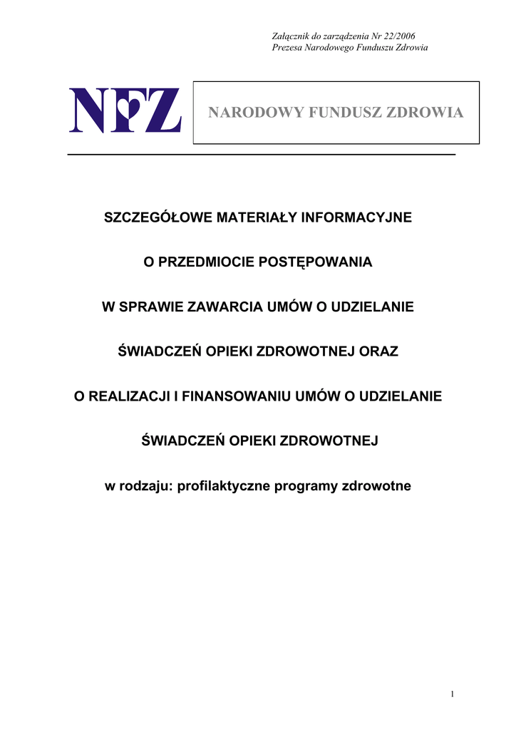 Załącznik do zarządzenia Nr 22/2006 Prezesa Narodowego Funduszu Zdrowia NARODOWY FUNDUSZ ZDROWIA SZCZEGÓŁOWE MATERIAŁY INFORMACYJNE O PRZEDMIOCIE POSTĘPOWANIA W SPRAWIE ZAWARCIA UMÓW O UDZIELANIE ŚWIADCZEŃ OPIEKI ZDROWOTNEJ ORAZ O REALIZACJI I FINANSOWANIU UMÓW O UDZIELANIE ŚWIADCZEŃ OPIEKI ZDROWOTNEJ w rodzaju: profilaktyczne programy zdrowotne 1 Załącznik do zarządzenia Nr 22/2006 Prezesa Narodowego Funduszu Zdrowia Rozdział 1 Przedmiot postępowania i umowy § 1. 3. Przedmiotem postępowania w sprawie zawarcia umowy o udzielanie świadczeń opieki zdrowotnej w rodzaju: profilaktyczne programy zdrowotne, jest zawarcie umowy o udzielanie świadczeń w: 1) Programie profilaktyki chorób układu krążenia, stanowiącym załącznik nr 1 do Zarządzenia Nr 86/2005 Prezesa Narodowego Funduszu Zdrowia z dnia 13 października 2005 r., 2) Programie profilaktyki przewlekłej obturacyjnej choroby płuc, stanowiącym załącznik nr 2 do Zarządzenia Nr 86/2005 Prezesa Narodowego Funduszu Zdrowia z dnia 13 października 2005 r., 3) Programie profilaktyki raka szyjki macicy, stanowiącym załącznik nr 3 do Zarządzenia Nr 86/2005 Prezesa Narodowego Funduszu Zdrowia z dnia 13 października 2005 r., 4) Programie profilaktyki raka piersi, stanowiącym załącznik nr 4 do Zarządzenia Nr 86/2005 Prezesa Narodowego Funduszu Zdrowia z dnia 13 października 2005 r., 5) Programie badań prenatalnych, stanowiącym załącznik nr 5 do Zarządzenia Nr 86/2005 Prezesa Narodowego Funduszu Zdrowia z dnia 13 października 2005 r., 6) Programie wczesnej, wielospecjalistycznej, kompleksowej, skoordynowanej i ciągłej pomocy dziecku zagrożonemu niepełnosprawnością lub niepełnosprawnemu oraz jego rodzinie, stanowiącym załącznik do Zarządzenia Nr 63/2005 Prezesa Narodowego Funduszu Zdrowia z dnia 22 września 2005 r., 7) Programie profilaktyki gruźlicy, stanowiącym załącznik do Zarządzenia Nr 102/2005 z dnia 1 grudnia 2005 r., 8) Programie profilaktyki chorób odtytoniowych – palenie jest uleczalne, stanowiącym załącznik do Zarządzenia Nr 54/2005 z dnia 30 sierpnia 2005 r., 9) Programie wczesnego wykrywania zakażeń HIV u kobiet w ciąży, stanowiącym załącznik nr 1 do Zarządzenia Nr 21/2006 z dnia 18 maja 2006 r., 10) Programie wczesnej diagnostyki i leczenia jaskry, stanowiącym załącznik nr 2 do Zarządzenia Nr 21/2006 z dnia 18 maja 2006 r., - zwanych dalej „Programami”. 2 Załącznik do zarządzenia Nr 22/2006 Prezesa Narodowego Funduszu Zdrowia 4. Świadczenia opieki zdrowotnej w rodzaju profilaktyczne programy zdrowotne zwane są dalej „świadczeniami”. 5. Zakresy świadczeń, o których mowa w ust 2, są określone w załączniku nr 1 do materiałów informacyjnych. 6. Szczegółowe materiały informacyjne w sprawie zawarcia umów o udzielanie świadczeń opieki zdrowotnej oraz o realizacji i finansowaniu umów o udzielanie świadczeń opieki zdrowotnej w rodzaju profilaktyczne programy zdrowotne, zwane są dalej „materiałami informacyjnymi”. 7. Wzór umowy o udzielanie świadczeń, o których mowa w § 1 ust. 2, stanowi załącznik nr 2 do materiałów informacyjnych. 8. Umowa może zawierać inne postanowienia niż określone we wzorze umowy pod warunkiem, że nie pozostają one w sprzeczności z postanowieniami określonymi we wzorze umowy. § 2. 1. Szczegółowy przedmiot postępowania w sprawie zawarcia umowy o udzielenie świadczeń oraz przedmiot umowy określa się z uwzględnieniem nazwy i kodu określonego we Wspólnym Słowniku Zamówień, określonym w rozporządzeniu nr 2195/2002 z dnia 5 listopada 2002 w sprawie Wspólnego Słownika Zamówień Publicznych Dz. Urz. WE L 340 z 16.12.2002 oraz art. 141 ust. 4 ustawy z dnia 27 sierpnia 2004 r. o świadczeniach opieki zdrowotnej finansowanych ze środków publicznych (Dz. U. Nr 210 poz.2135 z późn. zm.): - 85143000-3 Usługi ambulatoryjne, - 85121200-5 Specjalistyczne usługi medyczne. 2. Pojęcia zdefiniowane w ogólnych warunkach umów o udzielanie świadczeń opieki zdrowotnej, zachowują nadane im znaczenie. Rozdział 2 Zasady postępowania oraz wymagania wobec świadczeniodawców § 3. 1. Postępowanie w sprawie zawarcia umowy o udzielanie świadczeń odbywa się w drodze konkursu ofert albo rokowań. 3 Załącznik do zarządzenia Nr 22/2006 Prezesa Narodowego Funduszu Zdrowia 2. Podmiot biorący udział w postępowaniu, o którym mowa w ust. 1, powinien spełniać wymagania określone w przepisach odrębnych. 3. Podmiot biorący udział w postępowaniu powinien spełniać wymagania w zakresie zatrudnionej kadry medycznej i wyposażenia w sprzęt, określone w odrębnych przepisach i w załącznikach nr 3 - 12 do materiałów informacyjnych. Rozdział 3 Zasady udzielania świadczeń § 4. 1. Realizacja świadczeń odbywać się będzie zgodnie z harmonogramem pracy stanowiącym załącznik nr 2 do umowy, niekolidującym z godzinami przyjęć świadczeniobiorców w ramach innych umów o udzielanie świadczeń opieki zdrowotnej. 2. W przypadku realizacji przez jednego świadczeniodawcę więcej niż jednego Programu, dla każdego zakresu świadczeń ustala się odrębny harmonogram pracy, z zastrzeżeniem ust. 2a. 2a. Harmonogram pracy w ramach realizacji Programu wczesnego wykrywania zakażeń HIV u kobiet w ciąży, może pokrywać się z harmonogramem pracy w ramach realizacji umowy o udzielanie świadczeń opieki zdrowotnej w rodzaju ambulatoryjne świadczenia specjalistyczne w zakresach : poradnia ginekologiczno-położnicza, poradnia patologii ciąży. 3. W czasie realizacji Programu świadczeniodawca zapewnia rejestrację świadczeniobiorców na wyznaczone godziny. 4. Rejestracja świadczeniobiorców może się odbywać osobiście, telefonicznie lub za pośrednictwem osoby trzeciej. 5. Za świadczenia realizowane w ramach Programu świadczeniodawca nie może pobierać opłat od świadczeniobiorców. 6. Maksymalny okres oczekiwania na świadczenie na każdym etapie Programu wynosi 3