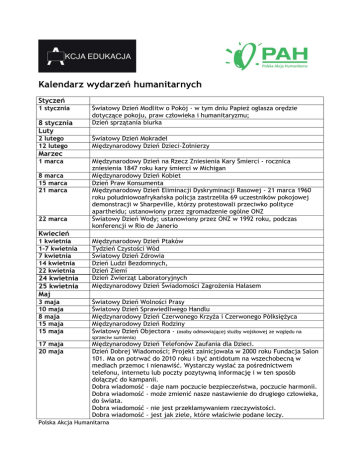 Kalendarz wydarzeń humanitarnych Styczeń 1 stycznia 8 stycznia Luty 2 lutego 12 lutego Światowy Dzień Modlitw o Pokój - w tym dniu Papież ogłasza orędzie dotyczące pokoju, praw człowieka i humanitaryzmu; Dzień sprzątania biurka Światowy Dzień Mokradeł Międzynarodowy Dzień Dzieci-Żołnierzy Marzec 1 marca 8 marca 15 marca 21 marca 22 marca Międzynarodowy Dzień na Rzecz Zniesienia Kary Śmierci - rocznica zniesienia 1847 roku kary śmierci w Michigan Międzynarodowy Dzień Kobiet Dzień Praw Konsumenta Międzynarodowy Dzień Eliminacji Dyskryminacji Rasowej - 21 marca 1960 roku południowoafrykańska policja zastrzeliła 69 uczestników pokojowej demonstracji w Sharpeville, którzy protestowali przeciwko polityce apartheidu; ustanowiony przez zgromadzenie ogólne ONZ Światowy Dzień Wody; ustanowiony przez ONZ w 1992 roku, podczas konferencji w Rio de Janerio Kwiecień 1 kwietnia 1-7 kwietnia 7 kwietnia 14 kwietnia 22 kwietnia 24 kwietnia 25 kwietnia Maj 3 maja 10 maja 8 maja 15 maja 15 maja Międzynarodowy Dzień Ptaków Tydzień Czystości Wód Światowy Dzień Zdrowia Dzień Ludzi Bezdomnych, Dzień Ziemi Dzień Zwierząt Laboratoryjnych Międzynarodowy Dzień Świadomości Zagrożenia Hałasem Światowy Dzień Wolności Prasy Światowy Dzień Sprawiedliwego Handlu Międzynarodowy Dzień Czerwonego Krzyża i Czerwonego Półksiężyca Międzynarodowy Dzień Rodziny Światowy Dzień Objectora - (osoby odmawiającej służby wojskowej ze względu na sprzeciw sumienia) 17 maja 20 maja Międzynarodowy Dzień Telefonów Zaufania dla Dzieci. Dzień Dobrej Wiadomości; Projekt zainicjowała w 2000 roku Fundacja Salon 101. Ma on potrwać do 2010 roku i być antidotum na wszechobecną w mediach przemoc i nienawiść. Wystarczy wysłać za pośrednictwem telefonu, internetu lub poczty pozytywną informację i w ten sposób dołączyć do kampanii. Dobra wiadomość - daje nam poczucie bezpieczeństwa, poczucie harmonii. Dobra wiadomość - może zmienić nasze nastawienie do drugiego człowieka, do świata. Dobra wiadomość - nie jest przekłamywaniem rzeczywistości. Dobra wiadomość - jest jak ziele, które właściwie podane leczy. Polska Akcja Humanitarna od 22 maja 24 maja 25 maja od 25 maja 28 maja 31 maja Międzynarodowy Dzień Różnorodności Biologicznej; data wejścia w życie Konwencji na temat Różnorodności Biologicznej Europejski Dzień Parków Narodowych Międzynarodowy Dzień Dziecka Zaginionego Tydzień Solidarności z Ludami Zamieszkującymi Niesamorządne Terytoria Międzynarodowy Dzień Działania na rzecz Zdrowia Kobiet Światowy Dzień Bez Papierosa Czerwiec 1 czerwca 4 czerwca 5 czerwca 12 czerwca 16 czerwca 17 czerwca 20 czerwca 26 czerwca Powszechny Dzień Dziecka Międzynarodowy Dzień Dzieci Będących Ofiarami Agresji; 19 sierpnia 1982 roku, na specjalnej sesji na temat kwestii palestyńskiej, Zgromadzenie Ogólne - "wstrząśnięte ogromną liczbą palestyńskich i libańskich dzieci zabitych podczas dokonywanych przez Izrael aktów agresji" - postanowiło ustanowić w dniu 4 czerwca doroczne obchody Międzynarodowego Dnia Dzieci Będących Ofiarami Agresji Światowy Dzień Ochrony Środowiska Światowy Dzień przeciwko Pracy Dzieci Międzynarodowy Dzień Pomocy Dzieciom Afrykańskim Światowy Dzień Zwalczania Skutków Pustynnienia Gleby i Suszy Międzynarodowy Dzień Uchodźcy Międzynarodowy Dzień Pomocy Ofiarom Tortur; Obchody Dnia mają na celu wspieranie działań na rzecz wyeliminowania tortur i skutecznej realizacji postanowień - uchwalonej w 1984 roku - Konwencji przeciwko stosowaniu tortur oraz innych okrutnych, nieludzkich i poniżających środków lub kar. Konwencja weszła w życie 26 czerwca 1987 roku. Lipiec pierwsza sobota lipca 11 lipca Międzynarodowy Dzień Spółdzielczości; proklamowany przez Zgromadzenie Ogólne Narodów Zjednoczone w 1992 roku Obchody zorganizowano w pierwszą sobotę lipca 1995 roku dla uczczenia setnej rocznicy powstania Międzynarodowego Stowarzyszenia Spółdzielni, grupy organizacji spółdzielczych zrzeszających łącznie 760 milionów członków w 100 krajach. Światowy Dzień Ludności; Ustanowiony w rocznicę obchodzonego w 1987 roku tzw. Dnia Pięciu Miliardów, Sierpień 9 sierpnia 12 sierpnia 23 sierpnia Międzynarodowy Dzień Ludności Tubylczej; Obchody Dnia zostały ustanowione na czas trwania Międzynarodowej Dekady Ludności Tubylczej na Świecie. Obchody przypadają w rocznicę pierwszego spotkania - w 1992 roku - Grupy Roboczej ds. Ludności Tubylczej, utworzonej przez Podkomisję Narodów Zjednoczonych ds. Popierania i Ochrony Praw Człowieka. Międzynarodowy Dzień Młodzieży Międzynarodowy Dzień Pamięci o Handlu Niewolnikami i jego Zniesieniu Wrzesień wrzesień 8 września 16 września (inauguracja sesji Zgromadzenia Ogólnego) - Międzynarodowy Dzień Pokoju Międzynarodowy Dzień Walki z Analfabetyzmem Międzynarodowy Dzień Ochrony Warstwy Ozonowej; Dzień jest obchodzony 16 września dla uczczenia rocznicy podpisania, w 1987 roku, Montrealskiego Polska Akcja Humanitarna 19 września 19-21 września 21 września 22 września 26 września 27 września Protokołu na temat substancji niszczących warstwę ozonową Dzień Dzikiej Fauny, Flory i Naturalnych Siedlisk Sprzątanie Świata Międzynarodowy Dzień Pokoju (International Day of Peace) Europejski Tydzień Mobilności (uprzednio Europejski Dzień bez Samochodu) Europejski Dzień Języków. Światowy Dzień Turystyki Październik 1 października pierwszy poniedziałek października 5 października 7 października 10 października druga środa października 16 października 17 października 24 października 24 października 24-30 października 31 października Międzynarodowy Dzień Osób Starszych Światowy Dzień Habitat (warunków zamieszkania) Światowy Dzień Nauczyciela Światowy Dzień Godnej Pracy Światowy Dzień Zdrowia Psychicznego Międzynarodowy Dzień Ograniczania Skutków Klęsk Żywiołowych Światowy D