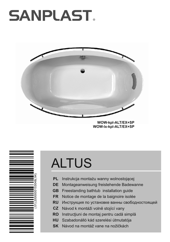 WOW-kpl-ALT/EX+SP WOW-lx-kpl-ALT/EX+SP ALTUS PL DE GB FR RU CZ RO HU SK Instrukcja montażu wanny wolnostojącej Montageanweisung freistehende Badewanne Freestanding bathtub installation guide Notice de montage de la baignoire isolée Инструкция по установке ванны свободностоящей Návod k montáži volně stojící vany Instrucţiuni de montaj pentru cadă simplă Szabadonálló kád szerelési útmutatója Návod na montáž vane na nožičkách ALTUS WOW-lx-ALT/EX+SP WOW-ALT/EX+SP WOW-lx-kpl-ALT/EX+SP WOW-kpl-ALT/EX+SP 655 970 250 155 175 = 1870 2 + 8 x2 A H 2 1 II. H[mm] I. WOW-kpl-ALT/EX+SP WOW-lx-kpl-ALT/EX+SP 670 3 ALTUS B C 1 2 4 D 2 1 3 E 2 1 3 5 ALTUS F WOW-lx-ALT/EX+SP WOW-lx-kpl-ALT/EX+SP A00 20 A00 PL D GB RUS 6 21 PL MONTA Ż : Z uwagi na zachowanie optymalnych parametrów, producent zaleca zlecić montaż odpowiednio wykwalifikowanemu instalatorowi. Aktualny wykaz polecanych punktów serwisowych znajduje się na stronie www.sanplast.pl. Produkt należy zamontować w sposób umożliwiający łatwy demontaż, aby w przypadku uszkodzenia można go zdemontować nie uszkadzając glazury. EKSPLOATACJA: Po każdej kąpieli powierzchnię wyrobu spłukać czystą bieżącą wodą. Pozostałe resztki wody wytrzeć za pomocą miękkiej ściereczki (nie stosować ścierek lub gąbek, które zawierają w swojej strukturze elementy szorstkie i trące). Czyścić okresowo za pomocą miękkiej ściereczki lub g ą bki stosuj ą c jedynie delikatne ś rodki chemiczne przeznaczone do czyszczenia i pielęgnacji akrylu sanitarnego. Nie stosować środków czyszczących zawierających elementy rysujące powierzchnię np. proszki. Uwaga! Podczas zwilżania, zwłaszcza przy zastosowaniu mydła, szamponu, olejku do kąpieli itd., powierzchnia większości brodzików/wanien staje się bardziej śliska! DROBNE NAPRAWY: Zarysowania (nie większe niż 0,2 mm) można usunąć szlifując powierzchnię papierem ściernym wodoodpornym nr 400, a następnie papierem nr 600 i 800, aż do usunięcia zarysowań. Następnie należy polerować powierzchnię pastą polerską używaną do polerowania powierzchni lakierniczych samochodu, aż do uzyskania połysku. W przypadku zmatowienia powierzchni akrylu zaleca się polerować powierzchnię ww. pastą polerską aż do osiągnięcia efektu połysku. Uwaga: Producent zastrzega sobie prawo do wprowadzania zmian w zakresie charakterystyki technicznej oraz kolorystyki opisywanych elementów. DE MONTAGE: Zur Beibehaltung der optimalen Parameter, wird es von dem Produzenten empfohlen, die Montage von einem Fachmann durchführen zu lassen. Die aktuelle Übersicht der empfohlenen Servicepunkte finden Sie auf der Internetseite: www.sanplast.pl. Das Produkt sollte so montiert werden, damit es auch einfach demontiert werden kann, d.h. auf solche Art und Weise, damit man es im Fall einer Beschädigung demontieren könnte, ohne gleichzeitig den Fliesenbelag zu beschädigen. BETRIEB: Nach jedem Bad sollte die Produktoberfläche mit sauberem, fliessenden Wasser gespült werden. Die Wasserreste sollten mit einem weichen Tuch getrocknet werden (bitte keine Tücher mit kratzenden oder reibenden Elementen verwenden). Bitte zyklisch mit Hilfe von einem weichen Tuch oder Schwamm und Reinigungsmitteln, die ausschließlich für Sanitäracryl geeignet sind reinigen. Bitte keine Reinigungsmittel, die kratzende Elemente beinhalten z.B. Pulver verwenden. Achtung! Während des Bades besonders mit Anwendung von Seife, Schampoo, Badeöl usw. wird die Duschwannen - und Badewannenoberfläche sehr glitschig! KLEINE REPARATUREN: Kratzer (nicht grösser als 0,2mm) beseitigt man durch das Schleifen der Oberfläche mit einem wasserrechten Schleifpapier Nr. 400, und dann mit dem Schleifpapier Nr. 600 und 800. Danach soll man die Oberfläche mit einer Polierpaste polieren, bis zum Erreichen des Glanzes. In der Situation wenn die Acryloberfläche matt wird, soll man sie mit der obergenannten Polierpaste polieren, bis zum Erreichen des Glanzes. Achtung: Der Hersteller behält sich das Recht vor, technische Änderungen und Farbenänderungen in den Produkten einzuführen. GB INSTALLATION: Producer recommends installation by the qualified installer to keep optimal parameters of product. Current list of recommended service points can be found at www.sanplast.pl. It should be remembered that various type of walls need various type of fixing materials. Producer equipped product with standard installation elements - stretchers to the walls made of solid materials - like concrete, brick, silicates, etc. If the walls are made of other materials (for example reinforced plasterboard walls) proper stretchers should be bought within one's capacity. Product should be installed in a way which enables an easy dismantling in case of failure, so that the tiles were not damaged. EVERYDAY USING: Product surface should be washed out with clean running water after each bathing. Remaining water drops should be removed with soft cloth to dry (do not use cloths or sponges, that contain rough and friction elements in the structure). It should be periodically cleaned with soft cloth or sponge using only gentle chemical agent for cleaning and maintenance of sanitary acrylic. Do not use cleaners containing drawing the surface elements, for example: powders. Attention! During wetting, especially with soap, shampoo, bath oil using, etc., most of the shower trays/bathtub surface can be very slippery! SMALL REPAIRS: Scratches (not bigger than 0,2mm) can be removed by polishing the surface with waterproof abrasive paper no 400, then with abrasive paper no 600 and 800, until the scratches are completely removed. The surface then should be polished with an abrasive compound used for car lacquer to restore its shine. In case the acrylic surface looks mat, it is recommended to polish it with an abrasive compound until it looks shiny again. Notice: The producer reserves the right to introduce changes o