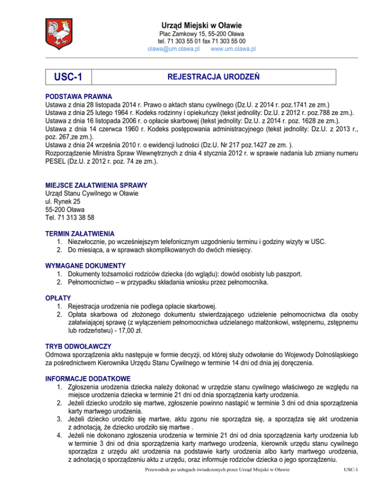 Urząd Miejski w Oławie Plac Zamkowy 15, 55-200 Oława tel. 71 303 55 01 fax 71 303 55 00 [email protected] www.um.olawa.pl USC-1 REJESTRACJA URODZEŃ PODSTAWA PRAWNA Ustawa z dnia 28 listopada 2014 r. Prawo o aktach stanu cywilnego (Dz.U. z 2014 r. poz.1741 ze zm.) Ustawa z dnia 25 lutego 1964 r. Kodeks rodzinny i opiekuńczy (tekst jednolity: Dz.U. z 2012 r. poz.788 ze zm.). Ustawa z dnia 16 listopada 2006 r. o opłacie skarbowej (tekst jednolity: Dz.U. z 2014 r. poz. 1628 ze zm.). Ustawa z dnia 14 czerwca 1960 r. Kodeks postępowania administracyjnego (tekst jednolity: Dz.U. z 2013 r., poz. 267,ze zm.). Ustawa z dnia 24 września 2010 r. o ewidencji ludności (Dz.U. Nr 217 poz.1427 ze zm. ). Rozporządzenie Ministra Spraw Wewnętrznych z dnia 4 stycznia 2012 r. w sprawie nadania lub zmiany numeru PESEL (Dz.U. z 2012 r. poz. 74 ze zm.). MIEJSCE ZAŁATWIENIA SPRAWY Urząd Stanu Cywilnego w Oławie ul. Rynek 25 55-200 Oława Tel. 71 313 38 58 TERMIN ZAŁATWIENIA 1. Niezwłocznie, po wcześniejszym telefonicznym uzgodnieniu terminu i godziny wizyty w USC. 2. Do miesiąca, a w sprawach skomplikowanych do dwóch miesięcy. WYMAGANE DOKUMENTY 1. Dokumenty tożsamości rodziców dziecka (do wglądu): dowód osobisty lub paszport. 2. Pełnomocnictwo – w przypadku składania wniosku przez pełnomocnika. OPŁATY 1. Rejestracja urodzenia nie podlega opłacie skarbowej. 2. Opłata skarbowa od złożonego dokumentu stwierdzającego udzielenie pełnomocnictwa dla osoby załatwiającej sprawę (z wyłączeniem pełnomocnictwa udzielanego małżonkowi, wstępnemu, zstępnemu lub rodzeństwu) - 17,00 zł. TRYB ODWOŁAWCZY Odmowa sporządzenia aktu następuje w formie decyzji, od której służy odwołanie do Wojewody Dolnośląskiego za pośrednictwem Kierownika Urzędu Stanu Cywilnego w terminie 14 dni od dnia jej doręczenia. INFORMACJE DODATKOWE 1. Zgłoszenia urodzenia dziecka należy dokonać w urzędzie stanu cywilnego właściwego ze względu na miejsce urodzenia dziecka w terminie 21 dni od dnia sporządzenia karty urodzenia. 2. Jeżeli dziecko urodziło się martwe, zgłoszenie powinno nastąpić w terminie 3 dni od dnia sporządzenia karty martwego urodzenia. 3. Jeżeli dziecko urodziło się martwe, aktu zgonu nie sporządza się, a sporządza się akt urodzenia z adnotacją, że dziecko urodziło się martwe . 4. Jeżeli nie dokonano zgłoszenia urodzenia w terminie 21 dni od dnia sporządzenia karty urodzenia lub w terminie 3 dni od dnia sporządzenia karty martwego urodzenia, kierownik urzędu stanu cywilnego sporządza z urzędu akt urodzenia na podstawie karty urodzenia albo karty martwego urodzenia, z adnotacją o sporządzeniu aktu z urzędu, oraz informuje rodziców dziecka o jego sporządzeniu. Przewodnik po usługach świadczonych przez Urząd Miejski w Oławie USC-1 Urząd Miejski w Oławie Plac Zamkowy 15, 55-200 Oława tel. 71 303 55 01 fax 71 303 55 00 [email protected] www.um.olawa.pl 5. Zgłoszenia urodzenia dokonują matka lub ojciec dziecka posiadający pełną zdolność do czynności prawnych. Matka lub ojciec dziecka, którzy ukończyli 16 lat, dokonują zgłoszenia urodzenia, jeżeli posiadają ograniczoną zdolność do czynności prawnych. W pozostałych przypadkach zgłoszenia urodzenia dokonują przedstawiciel ustawowy lub opiekun matki. 6. Zgłoszenia urodzenia można dokonać przez pełnomocnika. 7. Jeżeli dziecko urodziło się w czasie trwania małżeństwa albo przed upływem trzystu dni od jego ustania lub unieważnienia, domniemywa się, że pochodzi ono od męża matki. Domniemania tego nie stosuje się, jeżeli dziecko urodziło się po upływie trzystu dni od orzeczenia separacji. 8. Odpis skrócony aktu urodzenia jest wydawany z urzędu po dokonaniu rejestracji osobie zgłaszającej urodzenie. 9. Kierownik urzędu stanu cywilnego, który sporządził akt urodzenia występuje o nadanie numeru PESEL i powiadamia osobę o nadaniu tego numeru. 10. Zameldowanie dziecka urodzonego na terenie Rzeczypospolitej Polskiej na pobyt stały lub czasowy następuje z dniem sporządzenia aktu urodzenia. Uwaga! Utrudnienia, jakie mogą wystąpić po 1 marca 2015 roku w czasie obsługi Klientów, mają związek z działaniem aplikacji informatycznej, która jest obarczona wadami i ciągle modyfikowana. Ministerstwo Spraw Wewnętrznych opracowało procedurę awaryjną. Konieczność zastosowania procedury awaryjnej spowoduje, że nadanie numeru PESEL i zameldowanie noworodka nie będzie możliwe do załatwienia podczas jednej wizyty w Urzędzie. Przewodnik po usługach świadczonych przez Urząd Miejski w Oławie USC-1