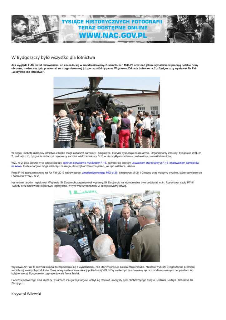W Bydgoszczy było wszystko dla lotnictwa Jak wygląda F-16 przed malowaniem, co zmieniło się w zmodernizowanych samolotach MiG-29 oraz nad jakimi wynalazkami pracują polskie firmy obronne, można się było przekonać na zorganizowanej już po raz siódmy przez Wojskowe Zakłady Lotnicze nr 2 z Bydgoszczy wystawie Air Fair „Wszystko dla lotnictwa”. W piątek i sobotę miłośnicy lotnictwa z bliska mogli zobaczyć samoloty i śmigłowce, którymi dysponuje nasza armia. Organizatorzy imprezy, bydgoskie WZL nr 2, zadbały o to, by goście zobaczyli najnowszy samolot wielozadaniowy F-16 w niezwykłym stadium – pozbawiony powłoki lakierniczej. WZL nr 2, jako jedyne w tej części Europy centrum serwisowe myśliwców F-16, zajmuje się bowiem usuwaniem starej farby z F-16 i malowaniem samolotów na nowo. Goście targów mogli zobaczyć naszego „Jastrzębia” zarówno przed, jak i po nałożeniu lakieru. Poza F-16 zaprezentowano na Air Fair 2013 najnowszego, zmodernizowanego MiG-a-29, śmigłowce Mi-24 i Głuszec oraz maszyny cywilne, które serwisuje się i naprawia w WZL nr 2. Na terenie targów Inspektorat Wsparcia Sił Zbrojnych zorganizował wystawę Sił Zbrojnych, na której można było podziwiać m.in. Rosomaka, czołg PT-91 Twardy oraz najnowsze ciężarówki logistyczne, w tym wóz wyposażony w specjalistyczny dźwig. Wystawa Air Fair to również okazja do zapoznania się z wynalazkami, nad którymi pracuje polska zbrojeniówka. Niektóre wybrały Bydgoszcz na premierę swoich najnowszych produktów. Swój nowy system komunikacji pokładowej VIS, który może być zastosowany np. w zmodernizowanych Leopardach lub kolejnej wersji Rosomaków, zaprezentowała firma Teldat. Podczas pierwszego dnia imprezy, w ramach inauguracji targów, odbył się również uroczysty apel obchodzącego święto Centrum Doktryn i Szkolenia Sił Zbrojnych. Krzysztof Wilewski autor zdjęć: Krzysztof Wilewski, Inspektorat Wsparcia SZ CZYTAJ NA PORTALU Polski przemysł musi być konkurencyjny Siła armii jest pochodną kondycji przemysłu i odwrotnie – podkreślał wiceminister obrony Waldemar Skrzypczak podczas otwarcia „Dni Przemysłu 2013”. Tegoroczna konferencja poświęcona była wyzwaniom, jakie niosą ze... W Kielcach króluje Rosomak Międzynarodowe targi przemysłu obronnego zdominowali polscy producenci. Pokazali najwięcej nowego sprzętu i uzbrojenia. Podobnie jak przed rokiem w centrum uwagi znów jest transporter opancerzony Rosomak....