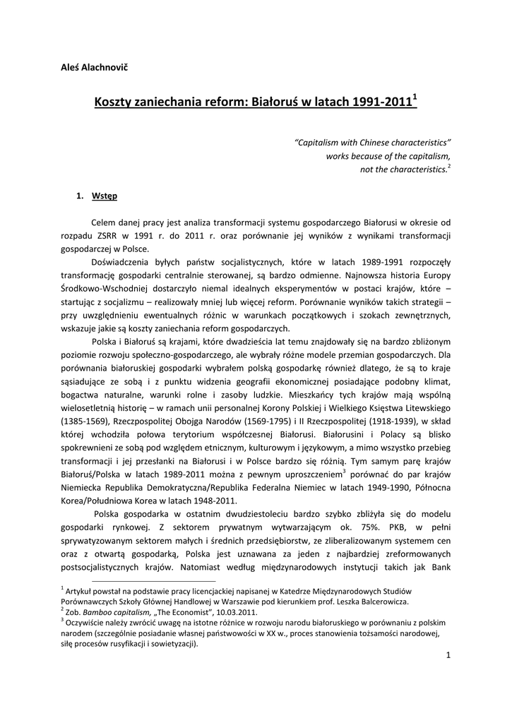 Aleś Alachnovič Koszty zaniechania reform: Białoruś w latach 1991-20111 “Capitalism with Chinese characteristics” works because of the capitalism, not the characteristics.2 1. Wstęp Celem danej pracy jest analiza transformacji systemu gospodarczego Białorusi w okresie od rozpadu ZSRR w 1991 r. do 2011 r. oraz porównanie jej wyników z wynikami transformacji gospodarczej w Polsce. Doświadczenia byłych paostw socjalistycznych, które w latach 1989-1991 rozpoczęły transformację gospodarki centralnie sterowanej, są bardzo odmienne. Najnowsza historia Europy Środkowo-Wschodniej dostarczyło niemal idealnych eksperymentów w postaci krajów, które – startując z socjalizmu – realizowały mniej lub więcej reform. Porównanie wyników takich strategii – przy uwzględnieniu ewentualnych różnic w warunkach początkowych i szokach zewnętrznych, wskazuje jakie są koszty zaniechania reform gospodarczych. Polska i Białoruś są krajami, które dwadzieścia lat temu znajdowały się na bardzo zbliżonym poziomie rozwoju społeczno-gospodarczego, ale wybrały różne modele przemian gospodarczych. Dla porównania białoruskiej gospodarki wybrałem polską gospodarkę również dlatego, że są to kraje sąsiadujące ze sobą i z punktu widzenia geografii ekonomicznej posiadające podobny klimat, bogactwa naturalne, warunki rolne i zasoby ludzkie. Mieszkaocy tych krajów mają wspólną wielosetletnią historię – w ramach unii personalnej Korony Polskiej i Wielkiego Księstwa Litewskiego (1385-1569), Rzeczpospolitej Obojga Narodów (1569-1795) i II Rzeczpospolitej (1918-1939), w skład której wchodziła połowa terytorium współczesnej Białorusi. Białorusini i Polacy są blisko spokrewnieni ze sobą pod względem etnicznym, kulturowym i językowym, a mimo wszystko przebieg transformacji i jej przesłanki na Białorusi i w Polsce bardzo się różnią. Tym samym parę krajów Białoruś/Polska w latach 1989-2011 można z pewnym uproszczeniem3 porównad do par krajów Niemiecka Republika Demokratyczna/Republika Federalna Niemiec w latach 1949-1990, Północna Korea/Południowa Korea w latach 1948-2011. Polska gospodarka w ostatnim dwudziestoleciu bardzo szybko zbliżyła się do modelu gospodarki rynkowej. Z sektorem prywatnym wytwarzającym ok. 75%. PKB, w pełni sprywatyzowanym sektorem małych i średnich przedsiębiorstw, ze zliberalizowanym systemem cen oraz z otwartą gospodarką, Polska jest uznawana za jeden z najbardziej zreformowanych postsocjalistycznych krajów. Natomiast według międzynarodowych instytucji takich jak Bank 1 Artykuł powstał na podstawie pracy licencjackiej napisanej w Katedrze Międzynarodowych Studiów Porównawczych Szkoły Głównej Handlowej w Warszawie pod kierunkiem prof. Leszka Balcerowicza. 2 Zob. Bamboo capitalism, „The Economist”, 10.03.2011. 3 Oczywiście należy zwrócid uwagę na istotne różnice w rozwoju narodu białoruskiego w porównaniu z polskim narodem (szczególnie posiadanie własnej paostwowości w XX w., proces stanowienia tożsamości narodowej, siłę procesów rusyfikacji i sowietyzacji). 1 Światowy, Europejski Bank Odbudowy i Rozwoju, Międzynarodowy Fundusz Walutowy przemiany gospodarcze na Białorusi są najmniejsze wśród transformujących się krajów. Dla białoruskiego prezydenta nadal aktualne są słowa W. Lenina, że „gospodarka jest kontynuacją polityki, ale prowadzona innymi metodami”. Należy podkreślid, że władze Białorusi starają się jak najdłużej zachowad status quo i kontrolowad gospodarkę. Rola, jaką odgrywa paostwo w rozwoju gospodarki, jest nadal olbrzymia – udział sektora publicznego w tworzeniu PKB wynosi obecnie ok. 70%.4, a system gospodarczy jest uznawany za system „tłumiący wolnośd gospodarczą” 5. Wyraźne różnice w rozwoju społeczno-gospodarczym Białorusi i Polski po dwudziestu latach od upadku komunizmu sugerują, jaki model lepiej służy społeczeostwu. Historia jest najlepszym sędzią każdego sporu i wydaje się, że w tej sprawie wyrok został już wydany. 2. Polska i Białoruś w 1989 r. Literatura empiryczna6 podkreśla silny związek pomiędzy rozwojem systemu politycznego a reformami gospodarczymi w danym kraju. System polityczny tworzy bodźce dla polityków do podejmowania określonych decyzji w sferze ekonomicznej. W zależności od wyboru polityki gospodarczej inny będzie rozkład korzyści i kosztów dla poszczególnych grup społecznych, które następnie będą decydowad o wyborze elit politycznych. Upadek komunistycznej dyktatury w Polsce i rozpad ZSRR sprawiły, że w pierwszej kolejności naród dokonywał wyboru systemu politycznego, a dopiero później systemu gospodarczego. W swojej pracy traktuję zmiany w systemie politycznym jako egzogeniczne determinanty transformacji gospodarczej. Nie analizuję osobno społecznopolitycznych przesłanek transformacji ustrojowej, ponieważ bez przesłanek ekonomicznych są one niewystarczające do jej realizacji. Jednak warto o nich pamiętad, ponieważ częściową wyjaśniają, dlaczego na Białorusi zabrakło zmiany władzy w 1991 r., a później powstało przyzwolenie społeczne na stanowienie władzy autorytarnej reżimu Łukaszenki, co ostatecznie przyczyniło się do wyboru innego niż w Polsce modelu transformacji systemowej. Większości wybitnych ekonomistów zajmujących się transformacją sądzi7, że na dłuższą metę wyniki ekonomiczne w krajach postsocjalistycznych mniej zależą od warunków wstępnych oraz szoków zewnętrznych niż od jakości prowadzonej polityki gospodarczej. Jednak moim zdaniem, w przypadku Białorusi, warunki wyjściowe ustroju politycznego miały wpływ na kształtowanie tej polityki. Po pierwsze, na progu przemian systemowych na początku lat 90’ na Białorusi całkowicie zabrakło tradycji zorganizowanej walki społeczeostwa o swoje prawa. Po drugie, białoruskie społeczeostwo było o wiele bardziej zsowietyzowane niż polskie. W odróżni