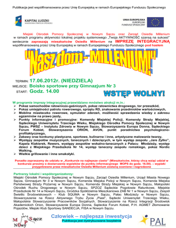 Publikacja jest współfinansowana przez Unię Europejską w ramach Europejskiego Funduszu Społecznego Miejski Ośrodek Pomocy Społecznej w Nowym Sączu oraz Zarząd Osiedla Millenium w ramach programu aktywności lokalnej projektu systemowego „Twoja AKTYWNOŚĆ szansą na sukces!” serdecznie zapraszają mieszkańców Osiedla Millenium na IMPREZĘ INTEGRACYJNĄ współfinansowaną przez Unię Europejską w ramach Europejskiego Funduszu Społecznego pod hasłem TERMIN: MIEJSCE: START: 17.06.2012r. (NIEDZIELA) Boisko sportowe przy Gimnazjum Nr 3 Godz. 14.00 W programie imprezy integracyjnej przewidziano mnóstwo atrakcji m.in.: Pokaz samochodów ratowniczo-gaśniczych, pokaz ratownictwa drogowego, tor przeszkód, Pokaz umiejętności patrolu rowerowego, sprzętu RD, znakowanie przedmiotów wartościowych, Mobilne miasteczko rowerowe, symulator zderzeń, możliwość sprawdzenia wiedzy z zakresu egzaminów na prawo jazdy, Punkty informacyjne i promocyjne: Komendy Miejskiej Policji, Komendy Straży Miejskiej, Sądeckiego Uniwersytetu Trzeciego Wieku, Miejskiego Ośrodka Pomocy Społecznej w Nowym Sączu, PWSZ – Instytutu Zdrowia w Nowym Sączu, Stowarzyszenia Europa Donna, Sądeckiego Forum Kobiet, Stowarzyszenia ORION, AVON, punkt poradnictwa psychologicznoprofilaktycznego, Zabawy oraz konkursy plastyczne, sportowe, kulinarne i inne, artystyczne malowanie twarzy, Występy zespołów muzycznych, tanecznych i dziecięcych, w tym występ zespołu „Jare Zytko”, Kapela Klakierek, Rewers, występy zespołów wokalno-tanecznych z Pałacu Młodzieży, występ dzieci z Miejskiego Przedszkola Nr 14, występ taneczny zespołu romskiego, pokaz Nordic Walking, Wielkie grillowanie i inne smakołyki. Ponadto zapraszamy do udziału w „Konkursie na najlepsze ciasto” (Mieszkańców, którzy chcą wziąć udział w konkursie prosimy o dostarczenie wypieków do punktu informacyjnego MOPS do godz. 16.00). – wypieki przygotowane przez mieszkańców Osiedla Millenium zostaną ocenione i nagrodzone Partnerzy lokalni i współorganizatorzy: Miejski Ośrodek Pomocy Społecznej w Nowym Sączu, Zarząd Osiedla Millenium, Urząd Miasta Nowego Sącza, Gimnazjum Nr 3 w Nowym Sączu, Komenda Miejska Policji w Nowym Sączu, Komenda Miejska Państwowej Straży Pożarnej w Nowym Sączu, Komenda Straży Miejskiej w Nowym Sączu, Małopolski Ośrodek Ruchu Drogowego w Nowym Sączu, SPZOZ Sądeckie Pogotowie Ratunkowe, Miejskie Przedszkole Nr 14 w Nowym Sączu, Grodzka Spółdzielnia Mieszkaniowa ZAB Nr 1 w Nowym Sączu, Zespół Świetlic Środowiskowych – Klub SQUMA w Nowym Sączu, Pałac Młodzieży w Nowym Sączu, Stowarzyszenie na Rzecz Aktywnego Trybu Życia „Piast”, Sądecki Uniwersytet Trzeciego Wieku, Małopolskie Stowarzyszenie Pracowników Socjalnych, Stowarzyszenie na Rzecz Integracji Środowisk Akademickich Orion, Stowarzyszenie Europa Donna, Sądeckie Forum Kobiet, P.H. AGMET Złomowanie Pojazdów, Miejski Klub Sportowy SANDECJA, FISA w Nowym Sączu. Człowiek – najlepsza inwestycja Publikacja jest dystrybuowana bezpłatnie