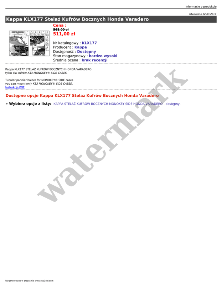 Informacje o produkcie Utworzono 02-03-2017 Kappa KLX177 Stelaż Kufrów Bocznych Honda Varadero Cena : 568,00 zł 511,00 zł Nr katalogowy : KLX177 Producent : Kappa Dostępność : Dostępny Stan magazynowy : bardzo wysoki Średnia ocena : brak recenzji Kappa KLX177 STELAŻ KUFRÓW BOCZNYCH HONDA VARADERO tylko dla kufrów K33 MONOKEY® SIDE CASES. er m ar k Tubular pannier holder for MONOKEY® SIDE cases you can mount only K33 MONOKEY® SIDE CASES. Instrukcja PDF Dostępne opcje Kappa KLX177 Stelaż Kufrów Bocznych Honda Varadero w at » Wybierz opcje z listy: KAPPA STELAŻ KUFRÓW BOCZNYCH MONOKEY SIDE HONDA VARADERO - dostępny. Wygenerowano w programie www.oscGold.com